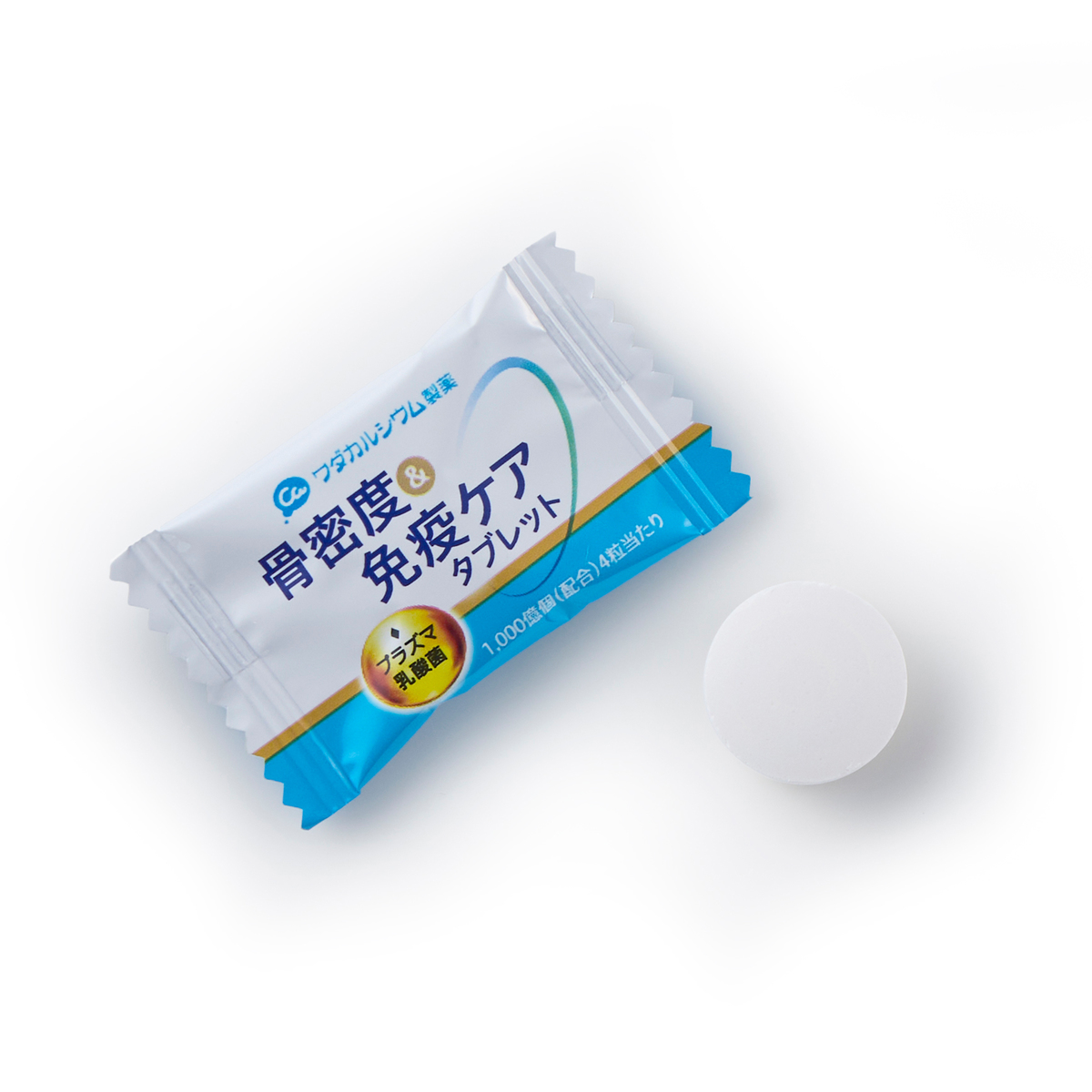 [アレルギー物質特定原材料8品目] なし [内容量]150g(60粒)×4袋 [目安量]1日4粒 [お召し上がり方] 1日4粒を目安に、かみくだくか口の中で溶かしてお召し上がりください [保存方法] 高温、多湿及び直射日光を避けて、常温で保存してください [栄養成分表示](4粒(10g)当たり) エネルギー 25.60kcal タンパク質 0.04g 脂質 0.20g 炭水化物 8.47g 食塩相当量 0.004g カルシウム 250mg 機能性関与成分 マルトビオン酸Ca 2.98g プラズマ乳酸菌(L. lactis strain Plasma) 1000億個 [届出番号]I1053 [届出表示] 本品にはマルトビオン酸Caとプラズマ乳酸菌(L. lactis strain Plasma)が含まれます。マルトビオン酸Caは加齢に伴い低下する骨密度の維持に役立つことが報告されています。プラズマ乳酸菌はpDC(プラズマサイトイド樹状細胞)に働きかけ、健康な人の免疫機能の維持に役立つことが報告されています。 [注意事項] ※本品は、事業者の責任において特定の保健の目的が期待できる旨を表示するものとして、消費者庁長官に届出されたものです。ただし、特定保健用食品と異なり、消費者庁長官による個別審査を受けたものではありません ※本品は、疾病に罹患している者、未成年者、妊産婦(妊娠を計画している者を含む。)及び授乳婦を対象に開発された食品ではありません ※本品は、疾病の診断、治療、予防を目的としたものではありません ※疾病に罹患している場合は医師に、医薬品を服用している場合は医師、薬剤師に相談してください ※本品は、多量摂取により疾病が治癒したり、より健康が増進するものではありません ※一日当たりの摂取目安量を守ってください ※妊娠・授乳期の方、乳幼児、小児のご利用はお控えください ※原材料の表示をご参照の上、食物アレルギーの方はお召し上がりにならないでください ※開封後はチャックをしっかり閉めて常温で保管し、お早めにお召し上がりください ※乳幼児、小児の手の届かない所に保管してください ※体調に異変を感じた際は、速やかに摂取を中止し、医師に相談してください ※変色や斑点が生じることがありますが、品質に問題はありません ■機能性表示食品 ※機能性関与成分 マルトビオン酸Ca 2.98g プラズマ乳酸菌(L.lactis strain Plasma) 1000億個 [原料原産地] オリゴ糖酸Ca(マルトビオン酸Ca含有)(国内製造) [原産国] 日本 [原材料] オリゴ糖酸Ca(マルトビオン酸Ca含有)(国内製造)、ぶどう糖、乳酸菌殺菌乾燥粉末/クエン酸、ステアリン酸カルシウム、微粒二酸化ケイ素、甘味料(アスパルテーム・L‐フェニルアラニン化合物)、香料
