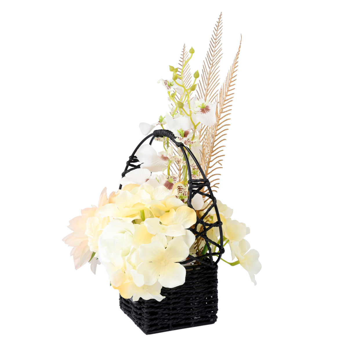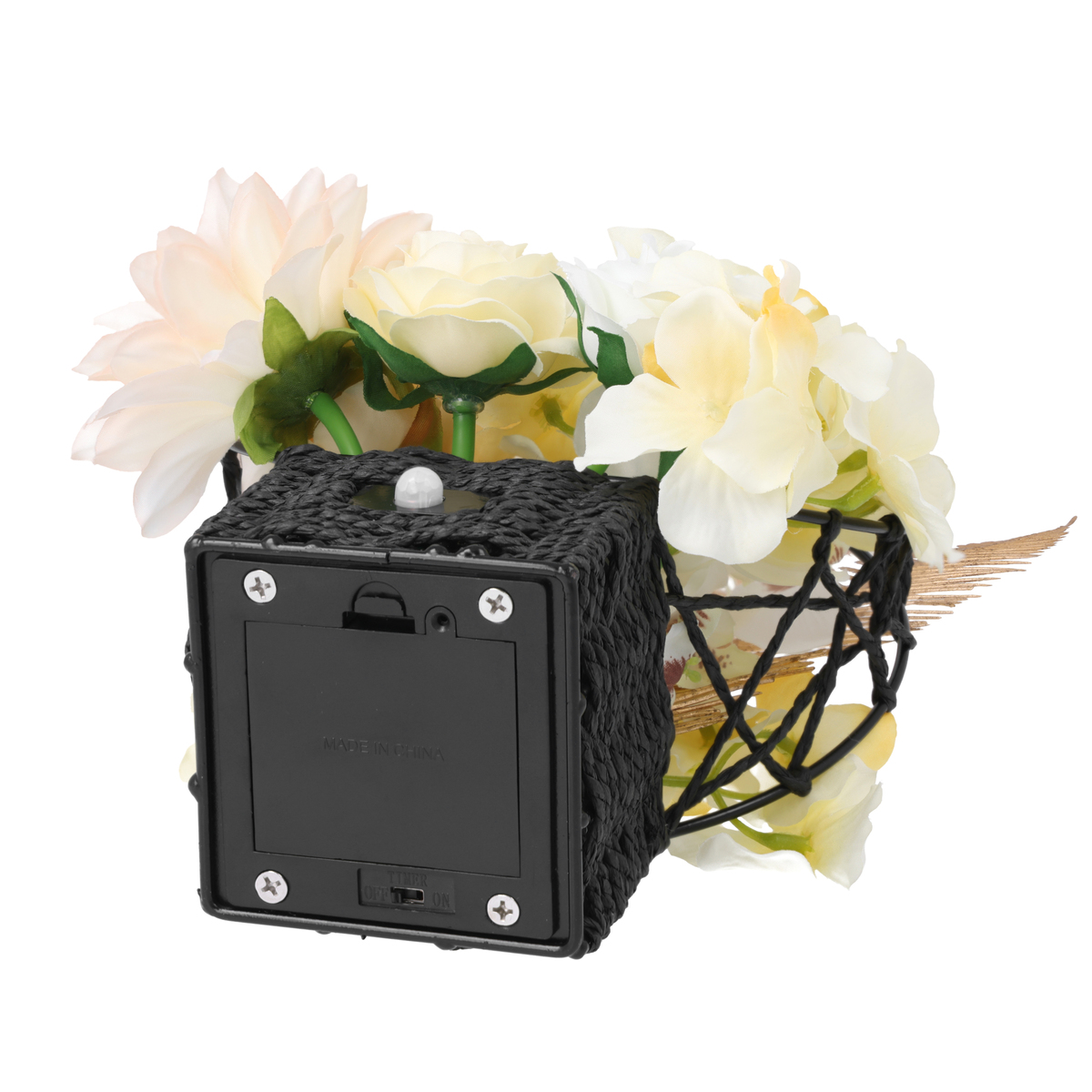 電源を入れると花に組み込まれたLEDライトが点灯するアートフラワー。オンシジューム、ローズ、ダマスクローズ、紫陽花、ダリア、フェザーを黒いシックなバスケットにアレンジしました