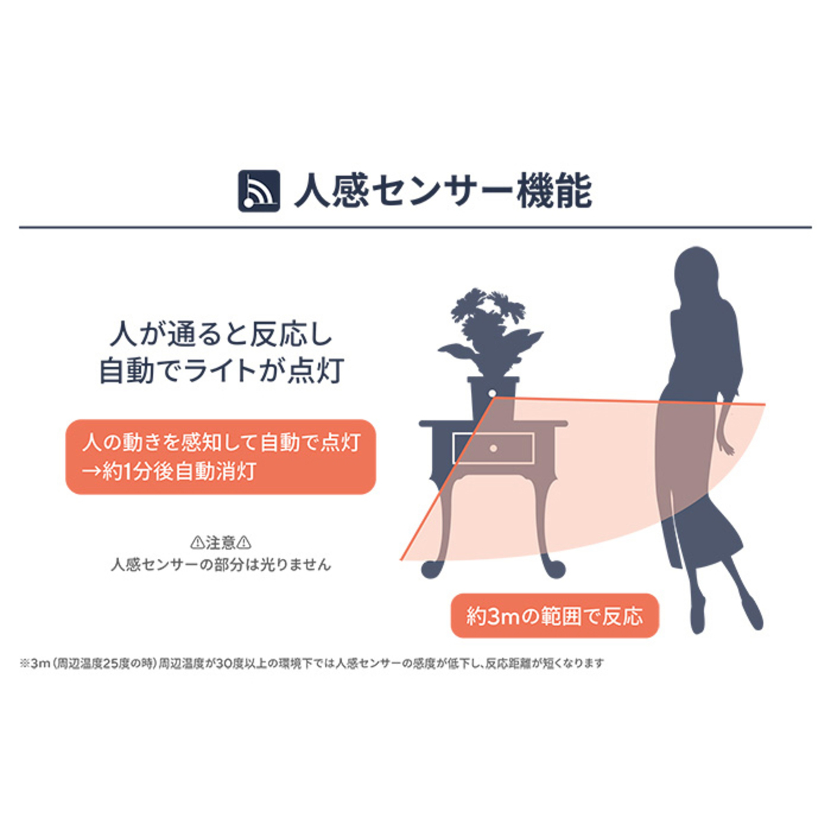 *3)人感センサーの反応距離3m(周辺温度25度の時)、周辺温度が30度以上の環境下では人感センサーの感度が低下し、反応距離が短くなります