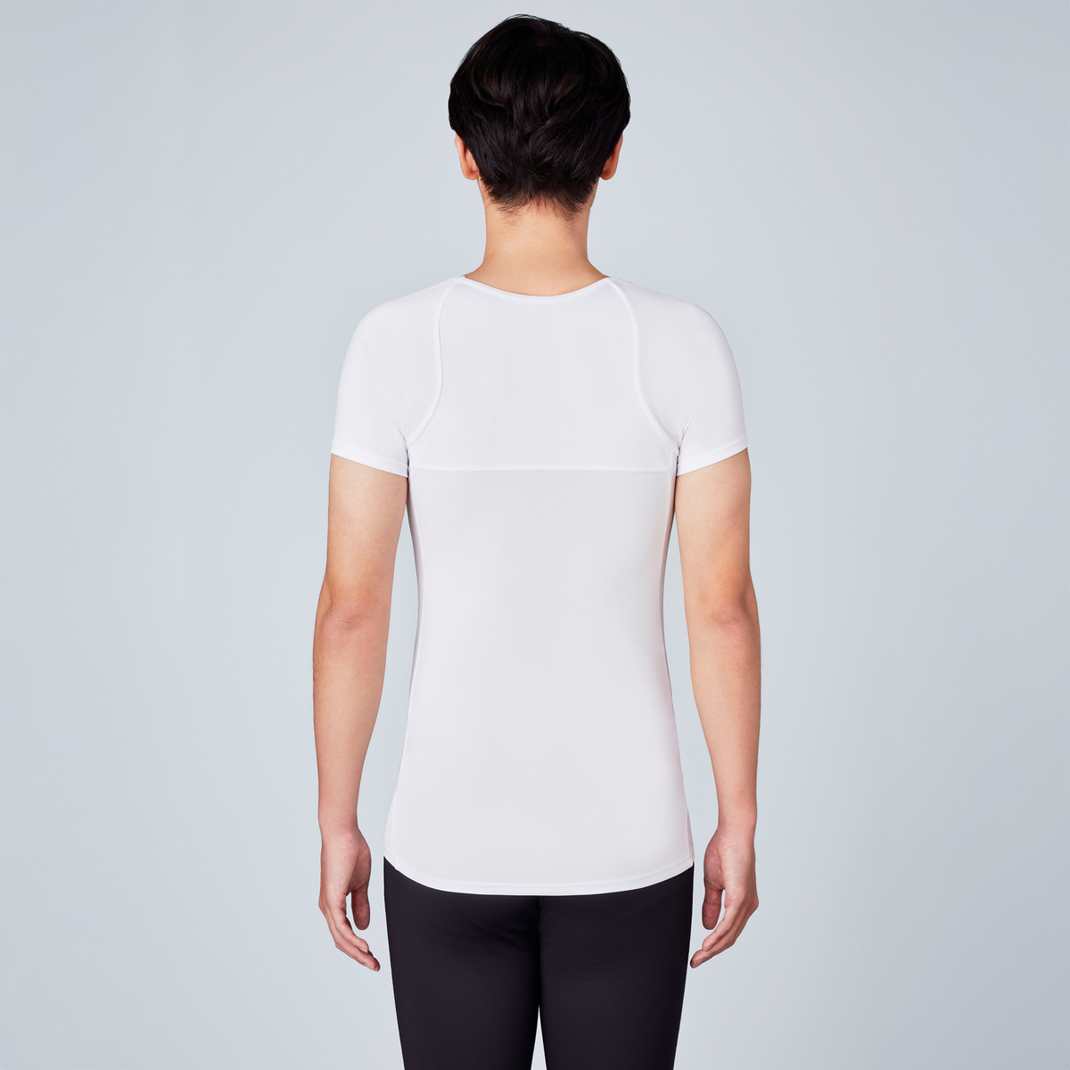 後ろに向いた袖で、肩と腕を背中側へ。自然に胸を開き、猫背・巻き肩を防止します