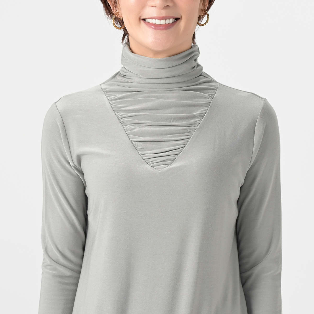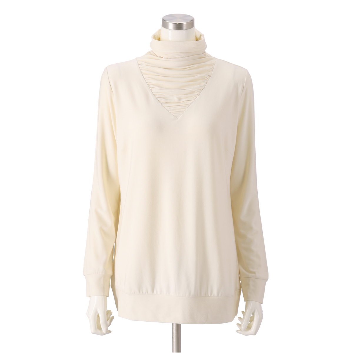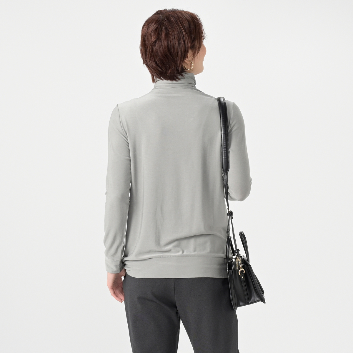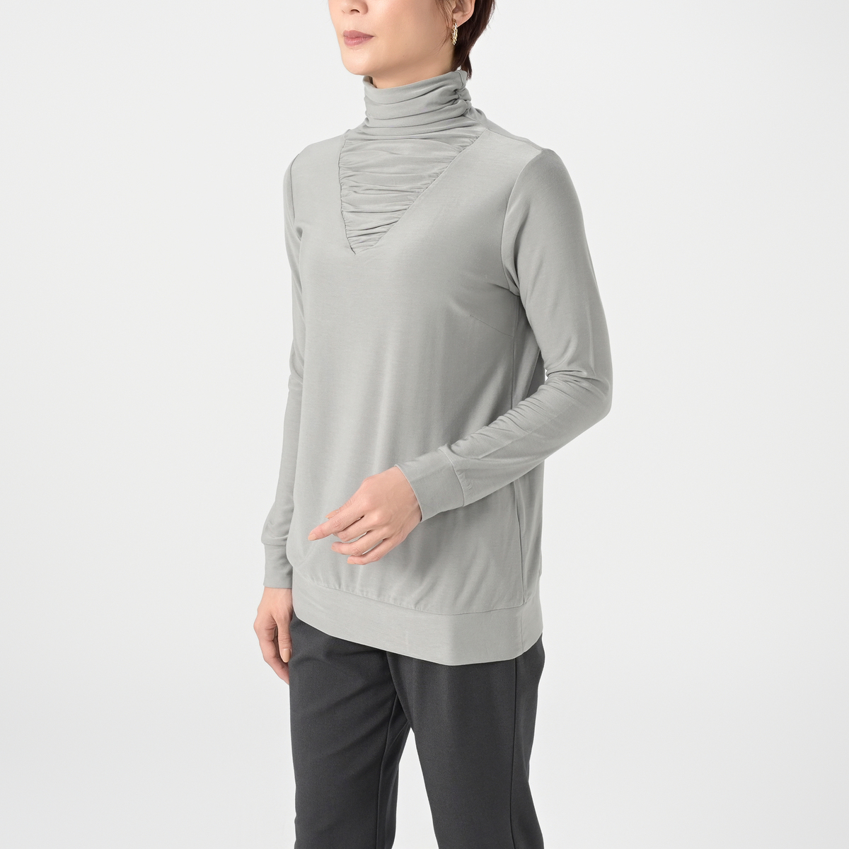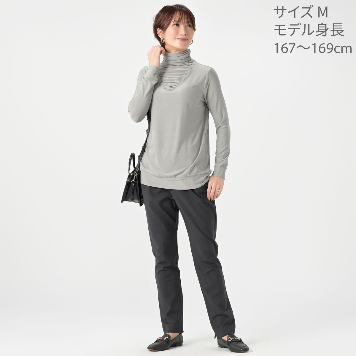 柔らかく肌触りの良い天竺素材で仕立てた、吸湿発熱シャーリングハイネックプルオーバー。袖口と裾は共地で切り替えています