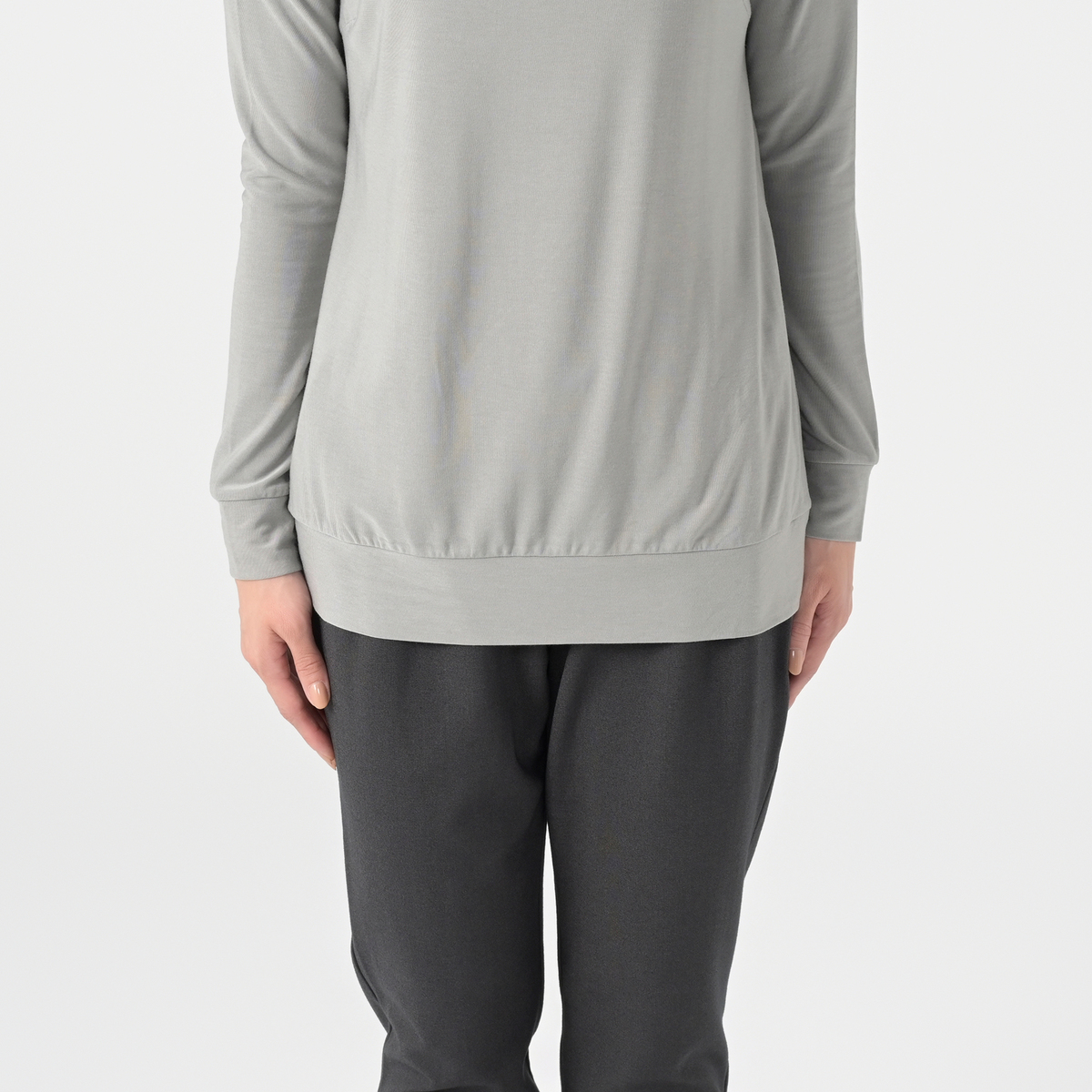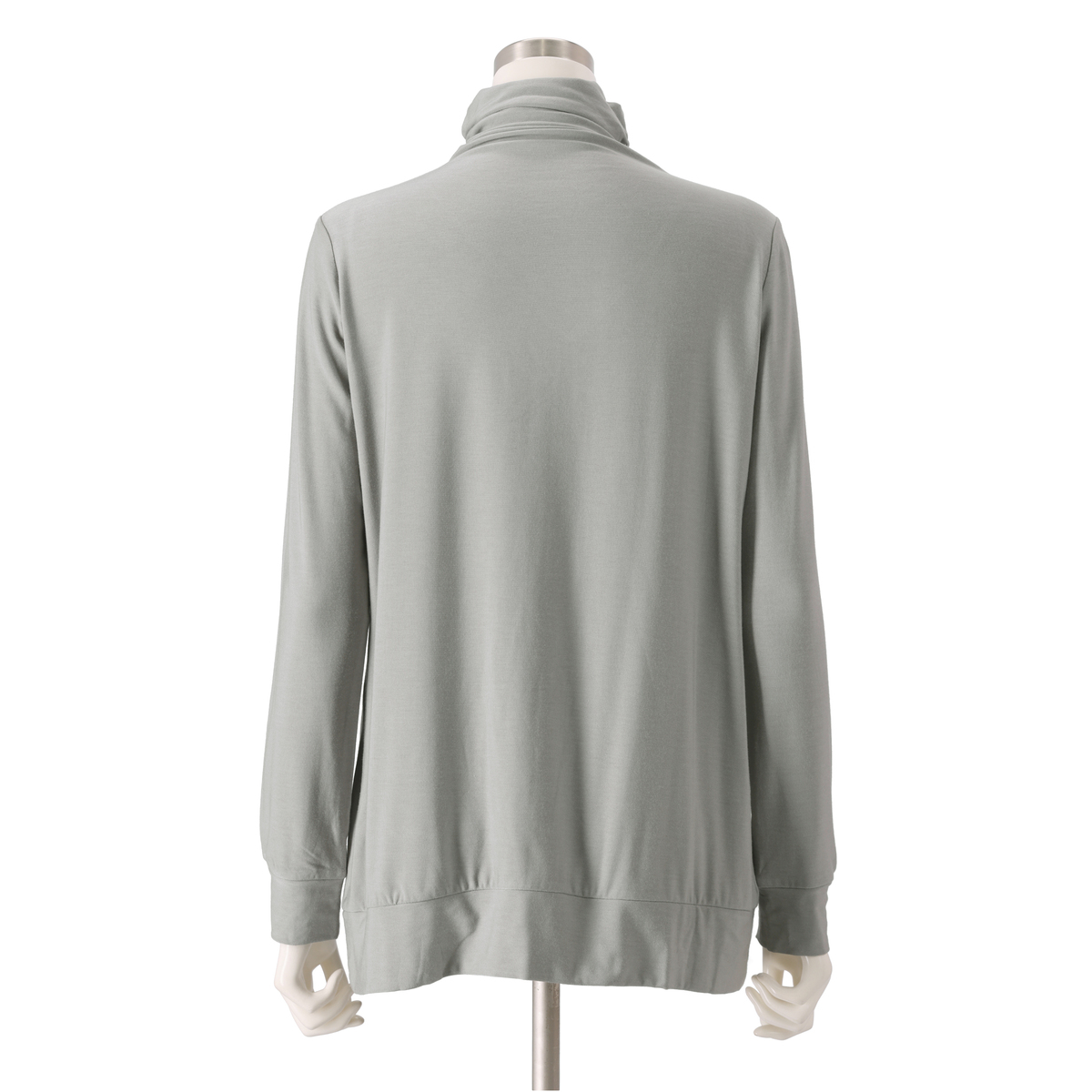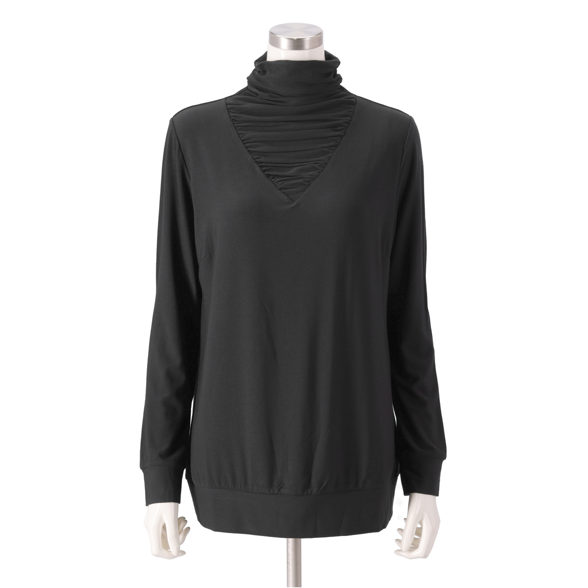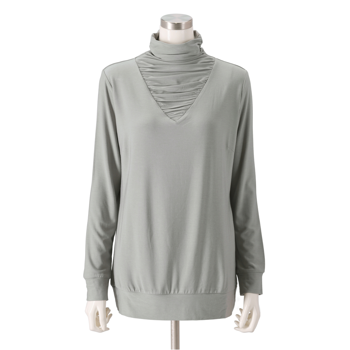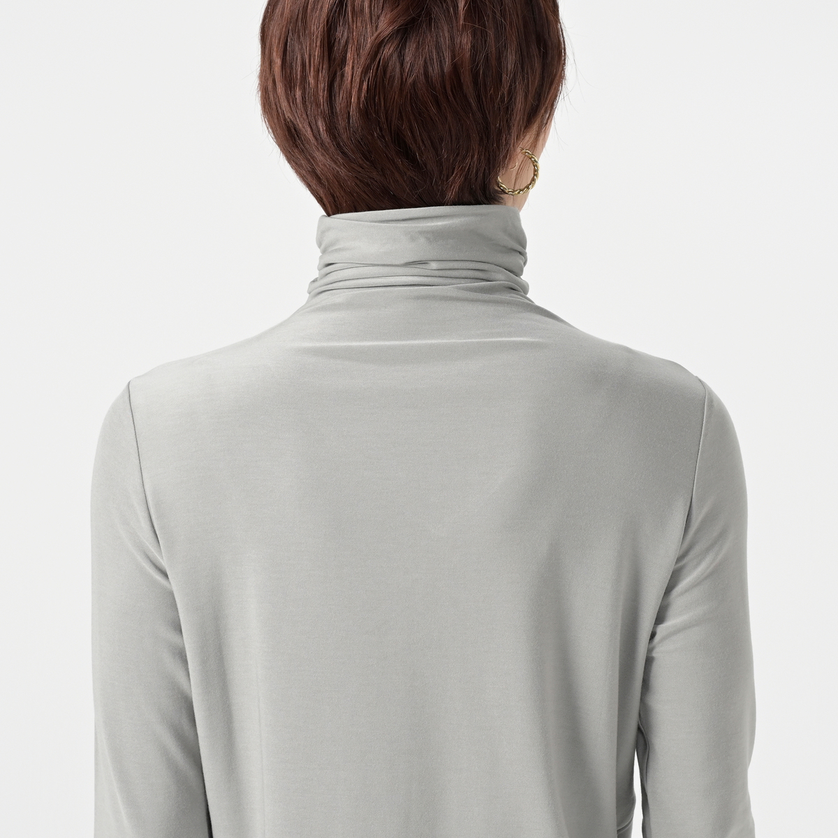 柔らかく肌触りの良い天竺素材で仕立てた、吸湿発熱シャーリングハイネックプルオーバー。袖口と裾は共地で切り替えています