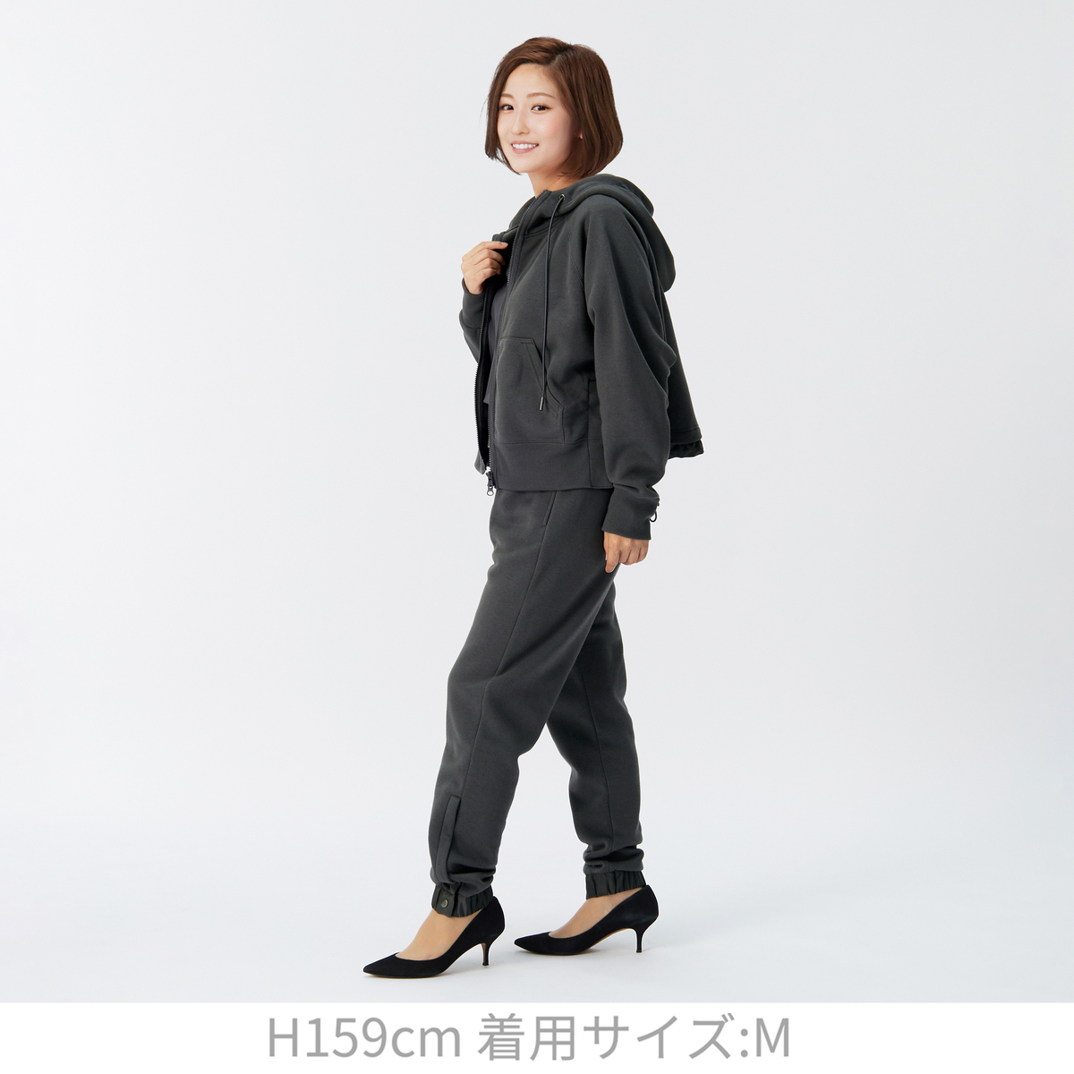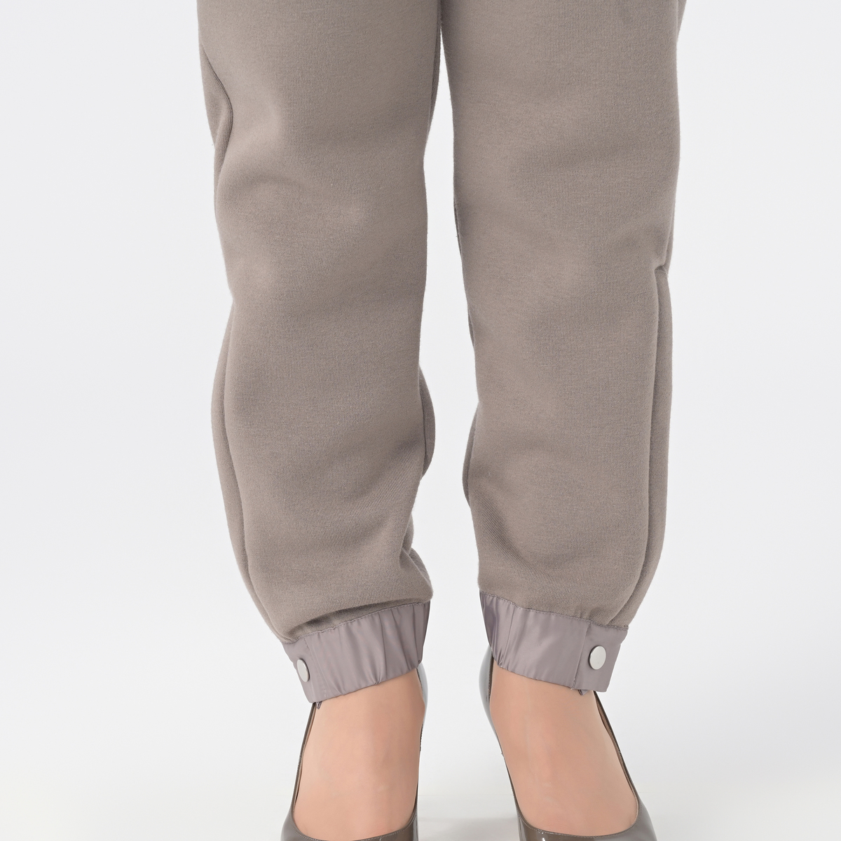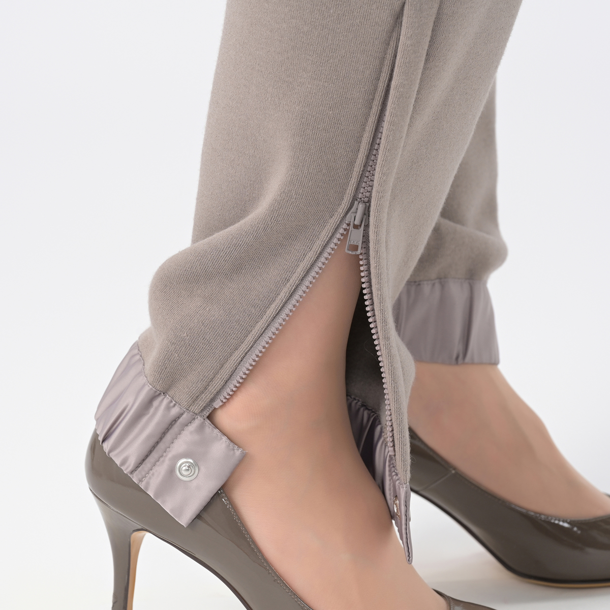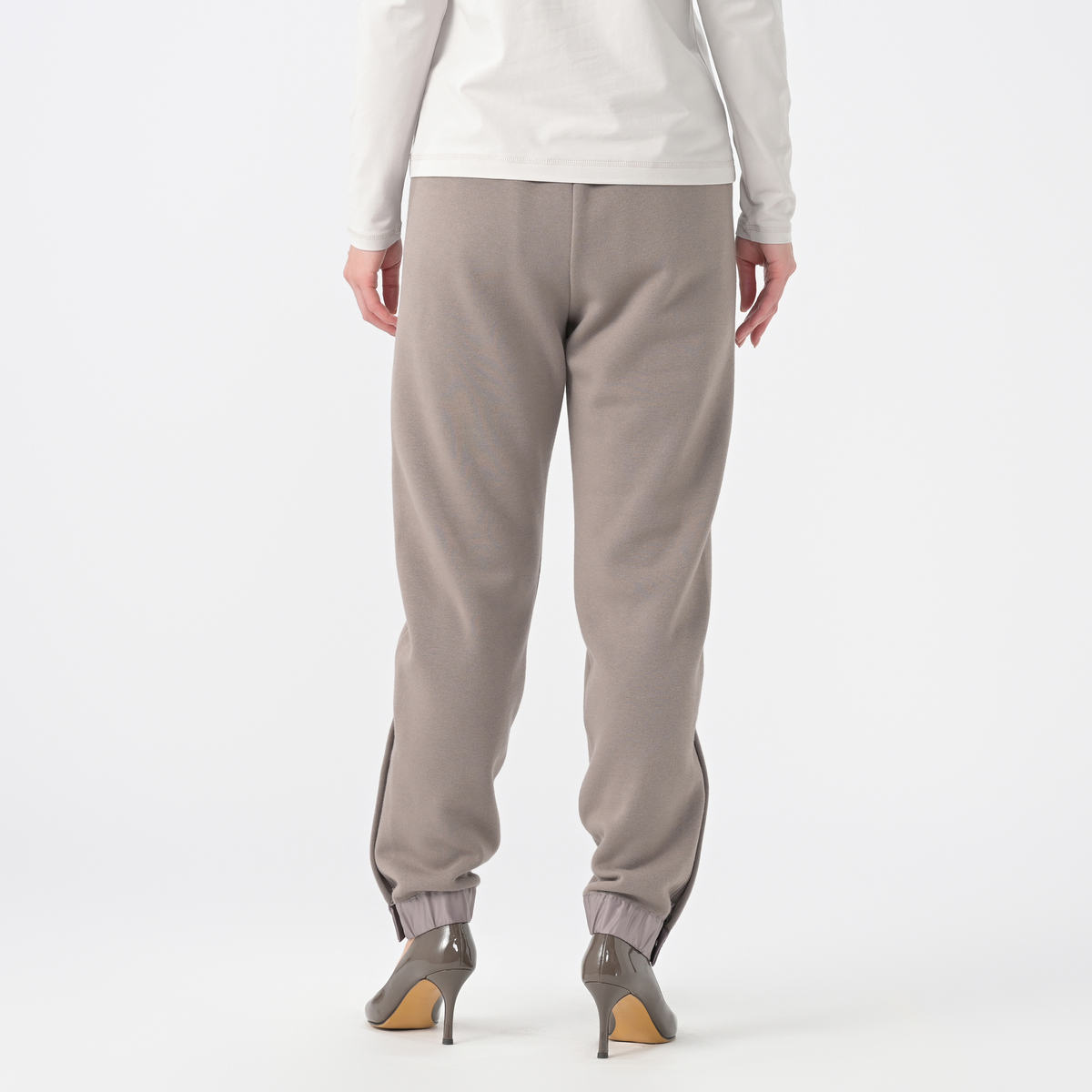 テーパードシルエットの裏毛パンツ。裾にあしらったファスナーを開けて着こなしアレンジが楽しめる仕様です