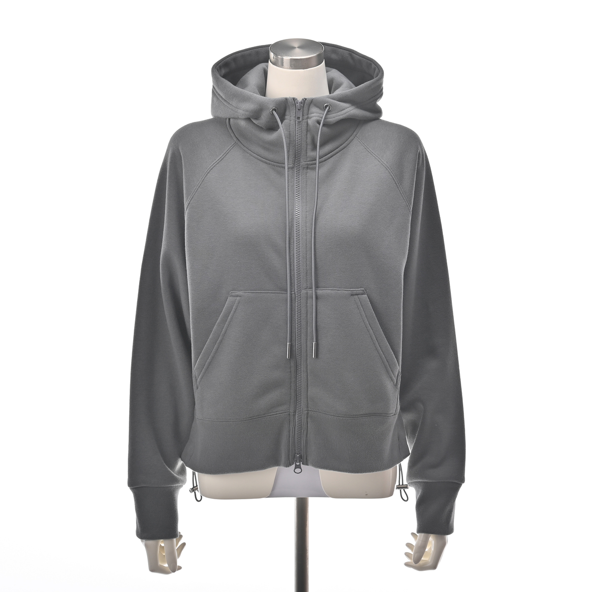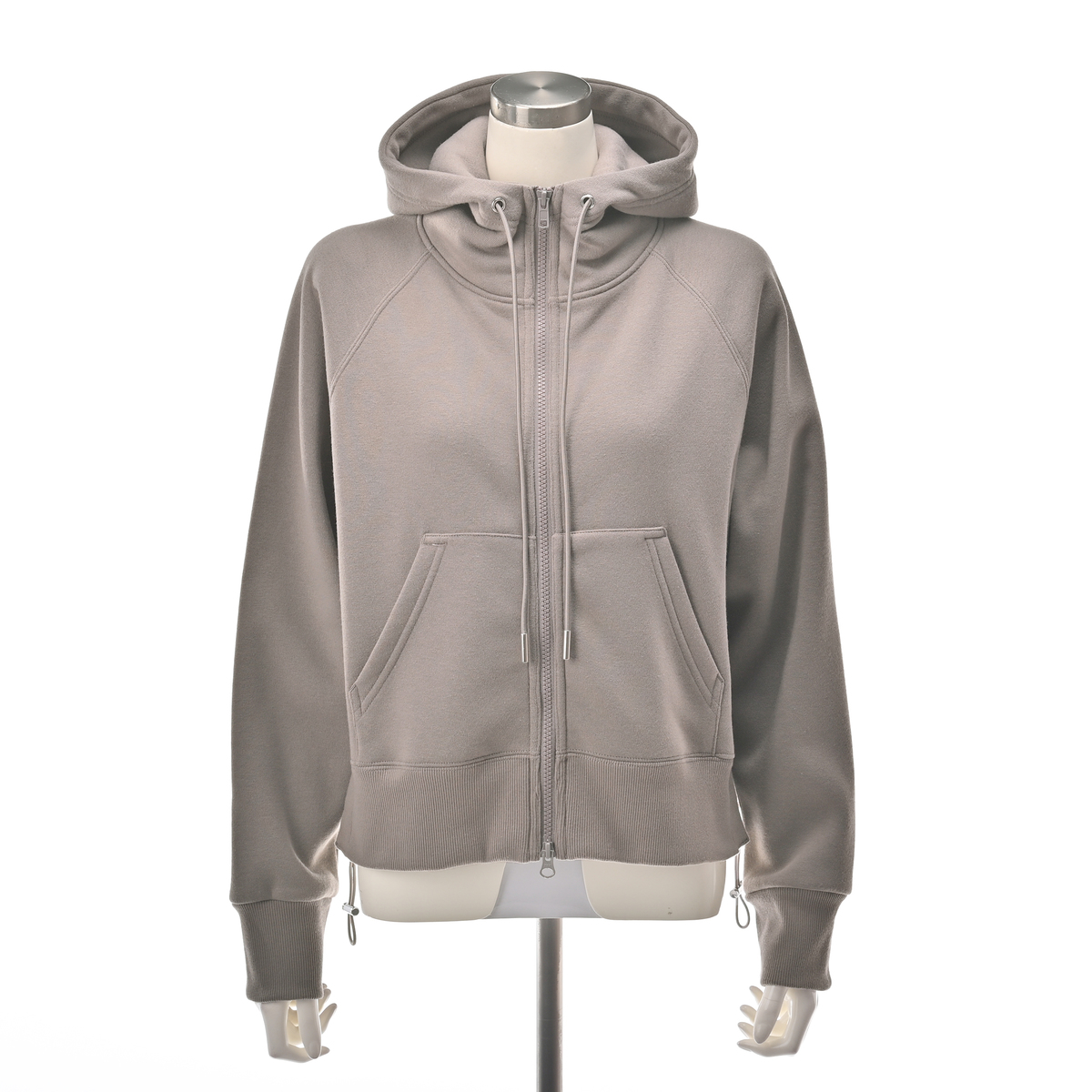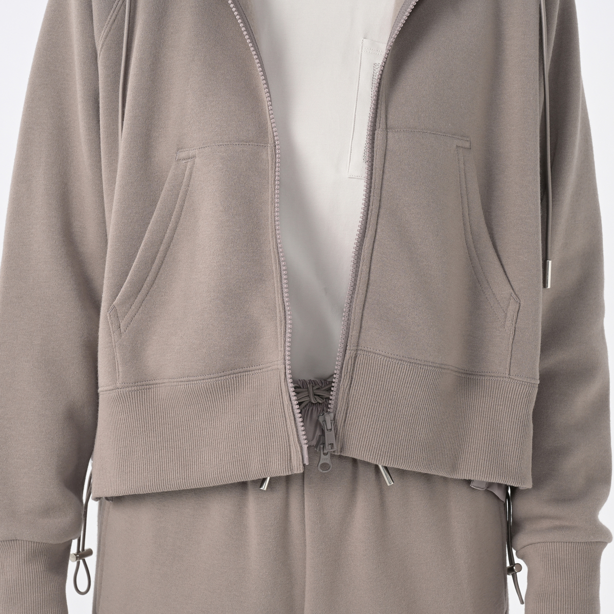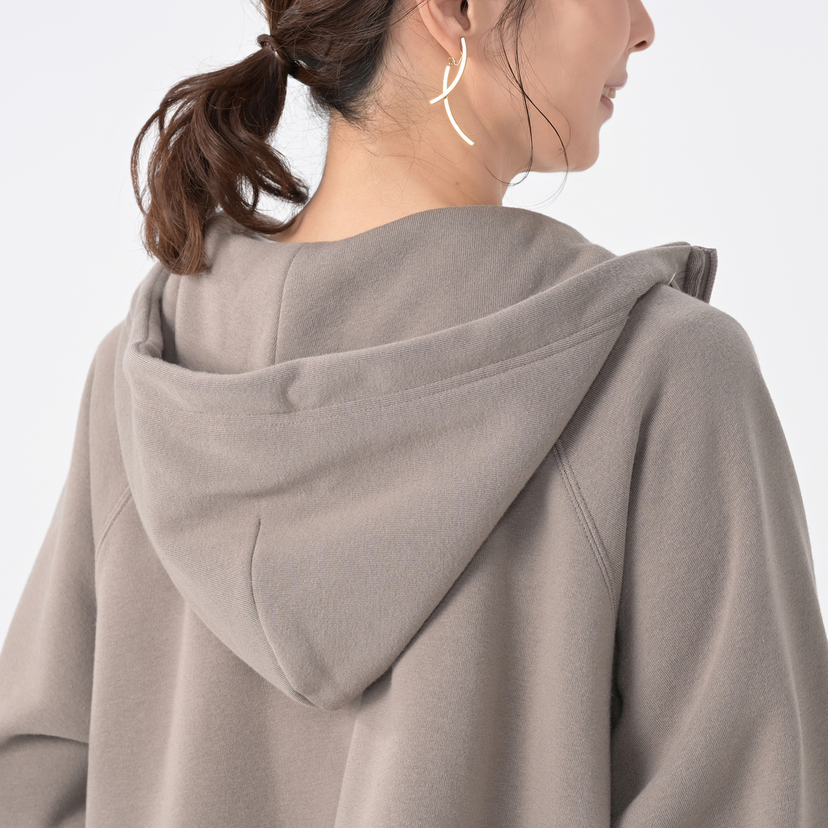 デザインにこだわったショート丈の裏毛パーカー。首元に立ち上がりのあるスタイリッシュなデザインです