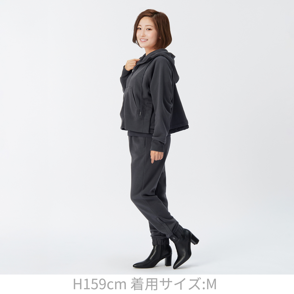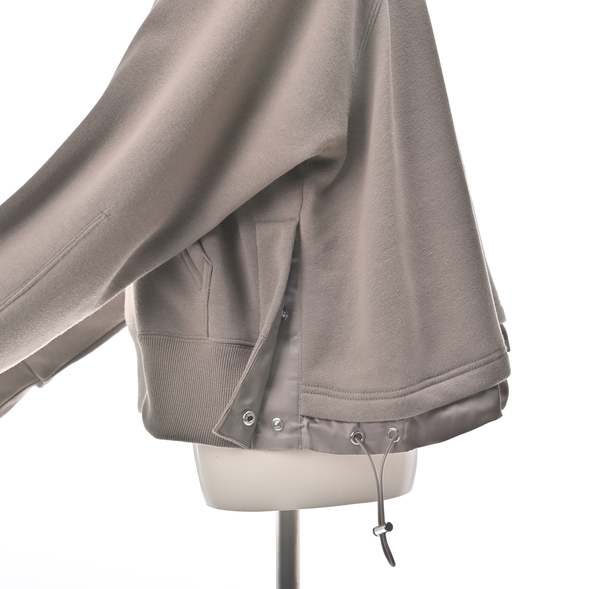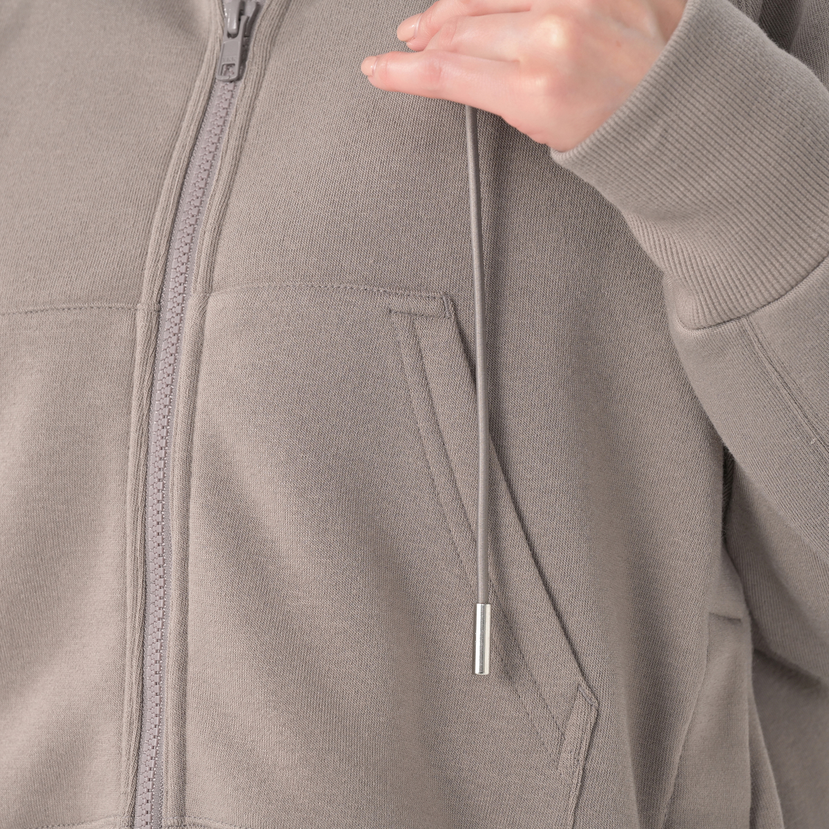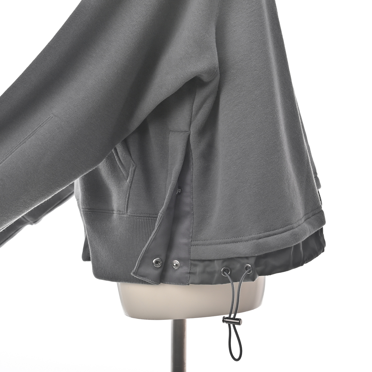 デザインにこだわったショート丈の裏毛パーカー。首元に立ち上がりのあるスタイリッシュなデザインです