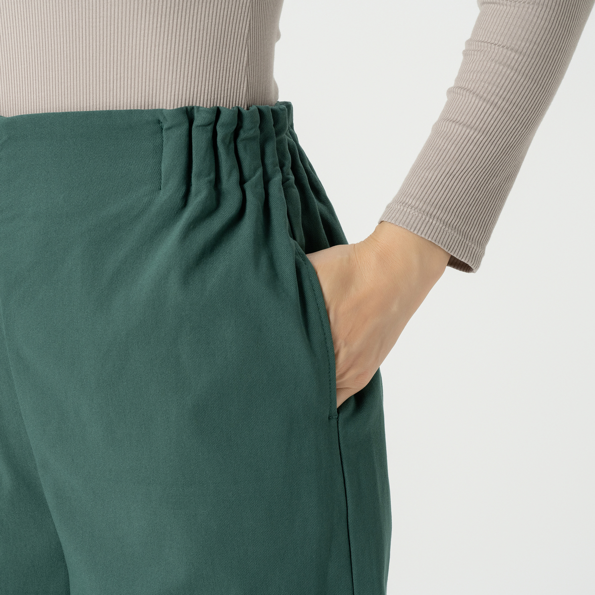 ウエストの内側は背中側のみ幅広ゴムを使い、締めつけ感を感じにくくラクな穿き心地。前側はゴムをあえてつけないことによりお腹周りをすっきり見せてくれます