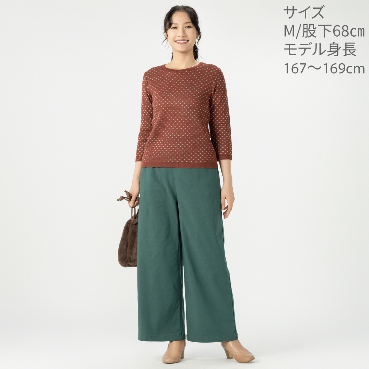 [商品寸法(ヌード寸法)cm] サイズ ウエスト ヒップ S : 60(58〜64) 97(82〜90) M : 65(64〜70) 102(87〜95) L : 70(69〜77) 107(92〜100) LL : 75(77〜85) 112(97〜105) 3L : 80(85〜93) 117(102〜110) サイズ 前股ぐり わたり幅 S : 33 31 M : 34 33 L : 35 34.5 LL : 35.5 36 3L : 36.5 37.5 股下:63/68 [ウエストゴム] 全体に有(前一部を除く) [素材] ベージュ、ピンク、グリーン、ブラック:レーヨン74%・ナイロン22%・ポリウレタン4% ストライプ:レーヨン75%・ナイロン22%・ポリウレタン3% グレンチェック:レーヨン75%・ポリエステル22%・ポリウレタン3% [お手入れ] 洗濯機洗い可 [注意事項] ※商品寸法の誤差は多少発生します。ご了承下さい ※洗濯時は洗濯ネットを使用してください ※アイロンはあて布を使用してください ※淡色の物は蛍光増白剤が入っていない洗剤を使用してください ※濃色の物は色落ちすることがありますので他の物と分けて洗い、洗濯後は直ちに干してください ※染料の性質上、汗や湿った状態、摩擦により色落ちしたり、他に色移りすることがありますので注意してください 【中国製】