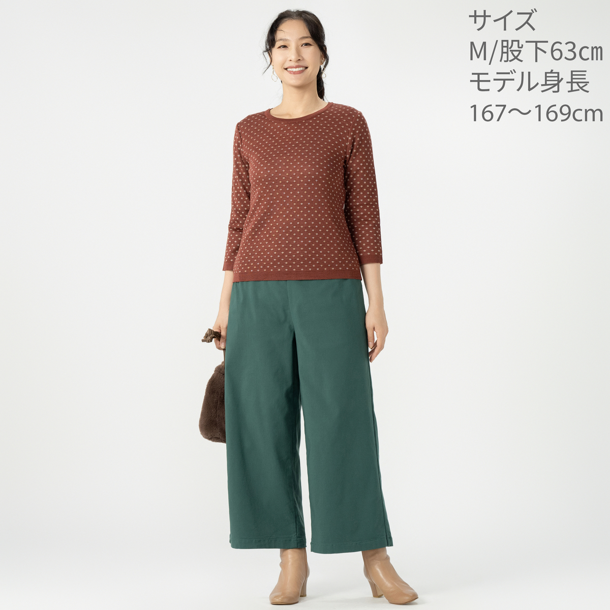暖かな穿き心地の裏起毛パンツ。ゆったりとしたセミワイドシルエットで脚のラインを拾いにくく、ウエストの両サイドには細かくタックを施し、視覚効果でウエストをキュッと見せてくれます