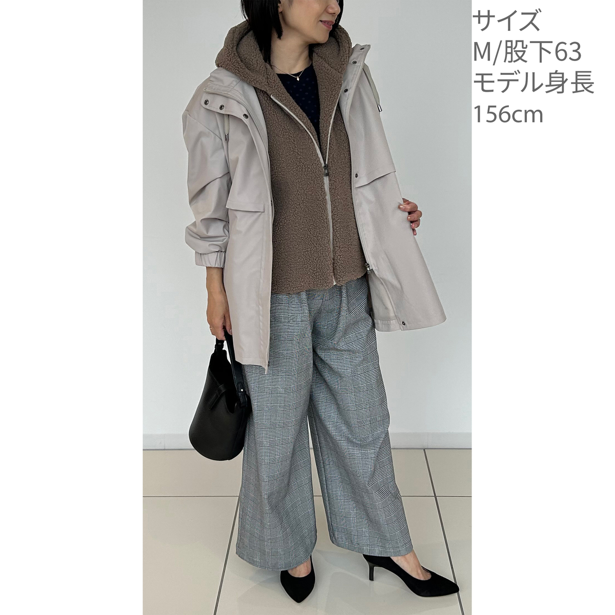 チェックのLサイズを購入しました。私の体型の為なのでしょうか、正面から鏡で見ますと腰回りが横に少し膨れて太って見える様に思います。デザインなのでしょうか、私には似合わないと思いますので今回は返品させて頂きます。生地は暖かくてとても良いと思います。