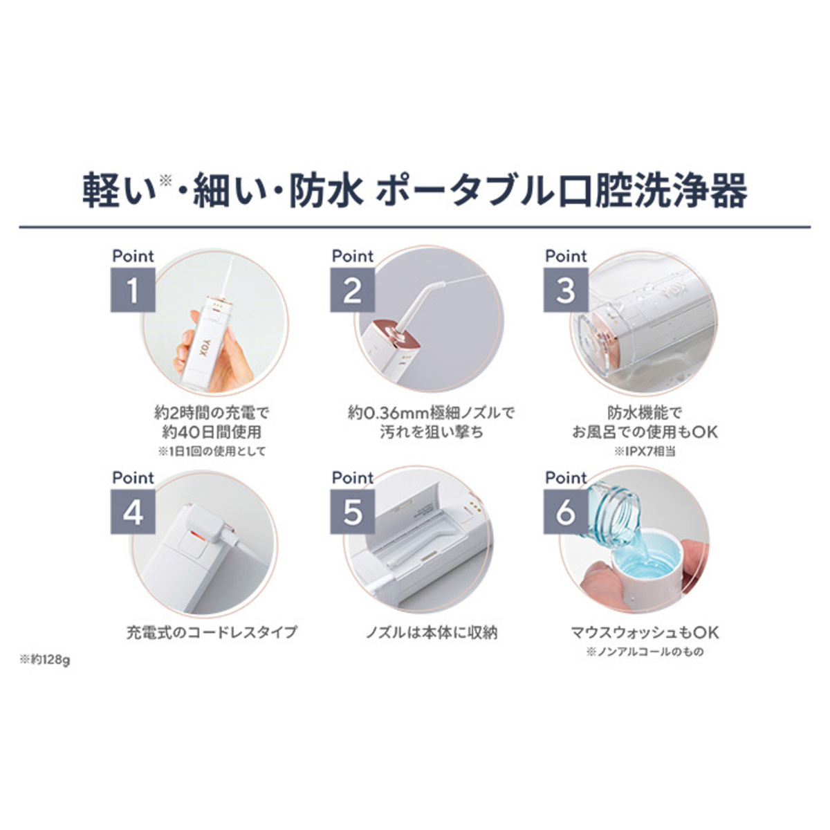 [サイズ] 約幅0.9×奥行4.8×高さ6.0cm [使用方法] ・本体の先端部分にノズルを装着します。ノズル溝の位置と差し込み口の形状を確認しながら差し込みます ・差し込み後はノズルを90度回転、正常な位置にノズルを装着します ・操作ボタンなどの本体正面とノズルの先端が同じ方向を向いていれば正常な装着となります [注意事項] ※毎日の様にお使いの場合は、3ヶ月に1回を目安として交換してください ※使用頻度が少ない場合は、6か月に1回を目安として交換してください ■取り扱い説明を充分にご確認の上、ご使用下さい 【中国製】 [セット内容] ・YOX ウォーターフロッサー コンパクト口腔洗浄器 ・本体 ・ノズル×2 ・充電ケーブル ・収納ポーチ ※ACアダプターは付属しません ・YOX ウォーターフロッサー 専用替えノズル2本 ※自然乾燥は給水フタを開放した状態で通気性を保ちます ※本体をクリアケースに収納し保護カバーを装着します ※本製品はUSB充電式です、十分に充電してから使用してください ※充電時は運転ランプが点滅し、充電完了時は運転ランプが常時点灯になります ※充電完了後は速やかにUSBケーブルを本体から外してください ※充電時はタンクを空の状態にしてください ※ノズルは消耗品です、噴射のパワーが以前より弱くなった、噴射口付近から水漏れするようになった、ノズル装着部が摩耗してセットしずらくなってきた等の際は、新しいノズルに交換してください。3ヶ月に1回交換が目安です