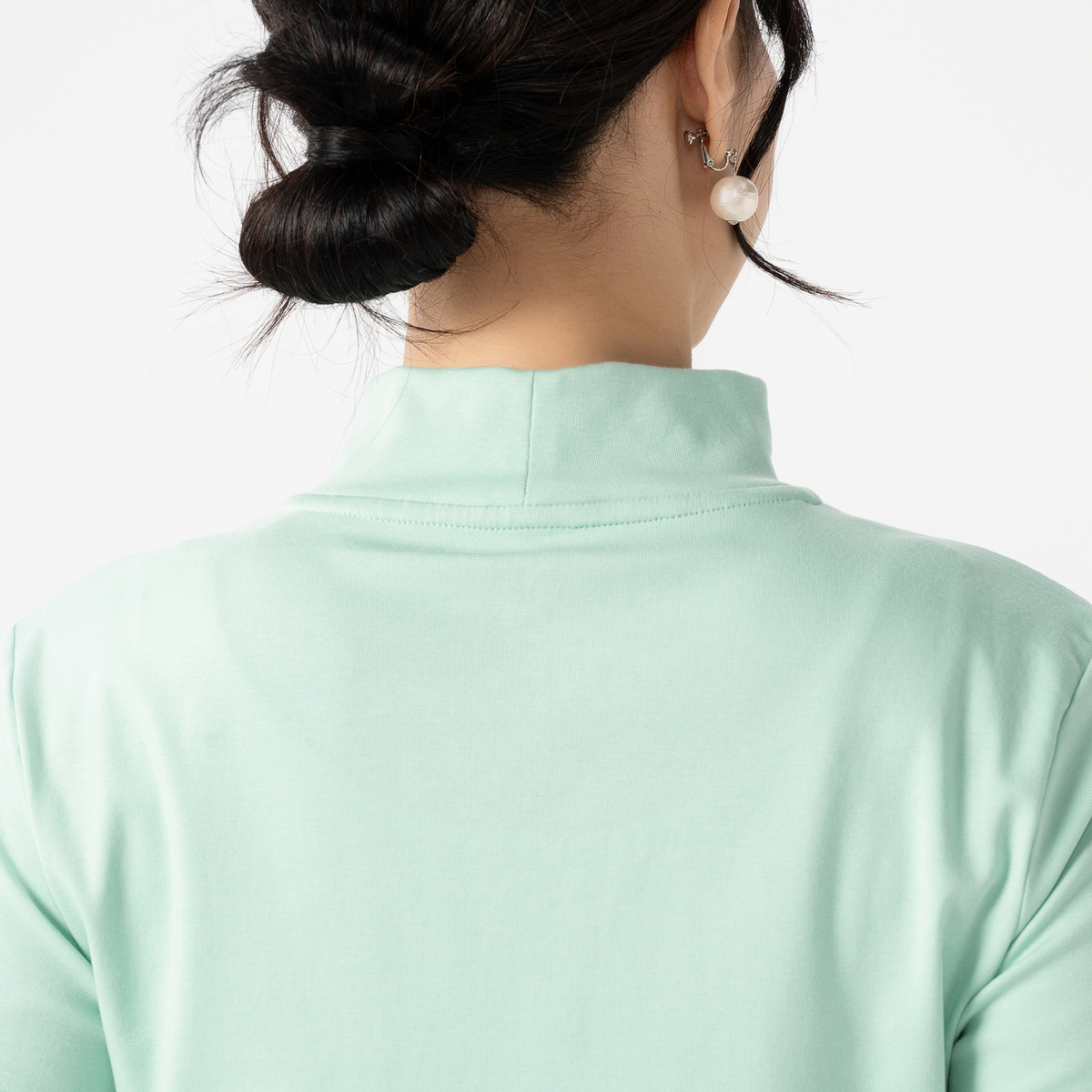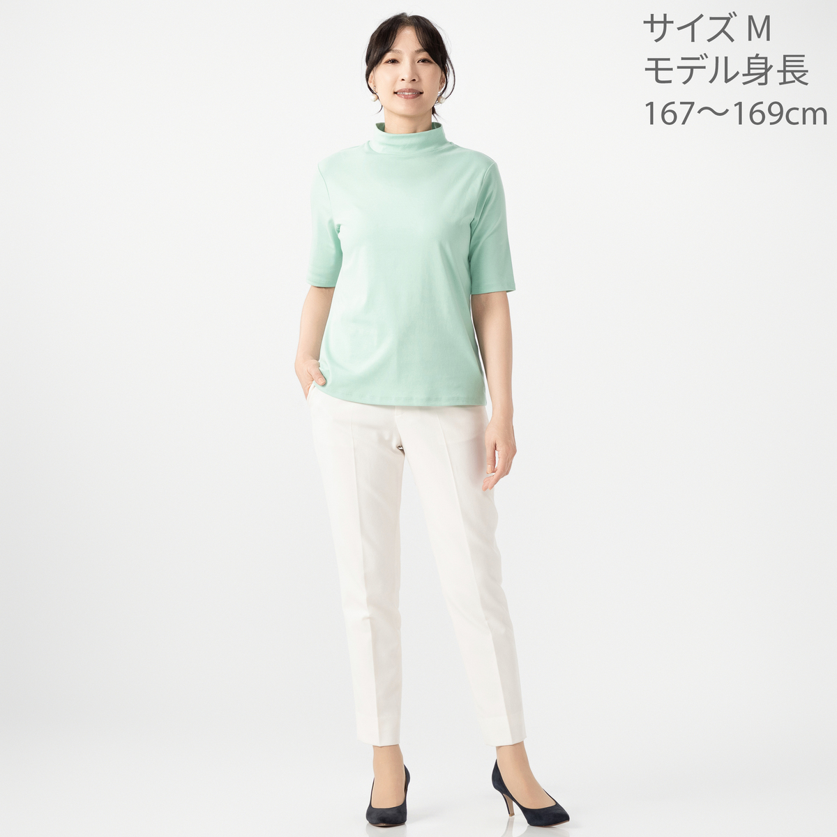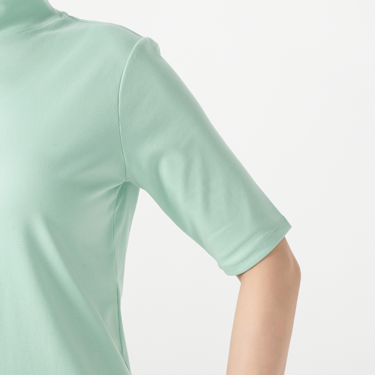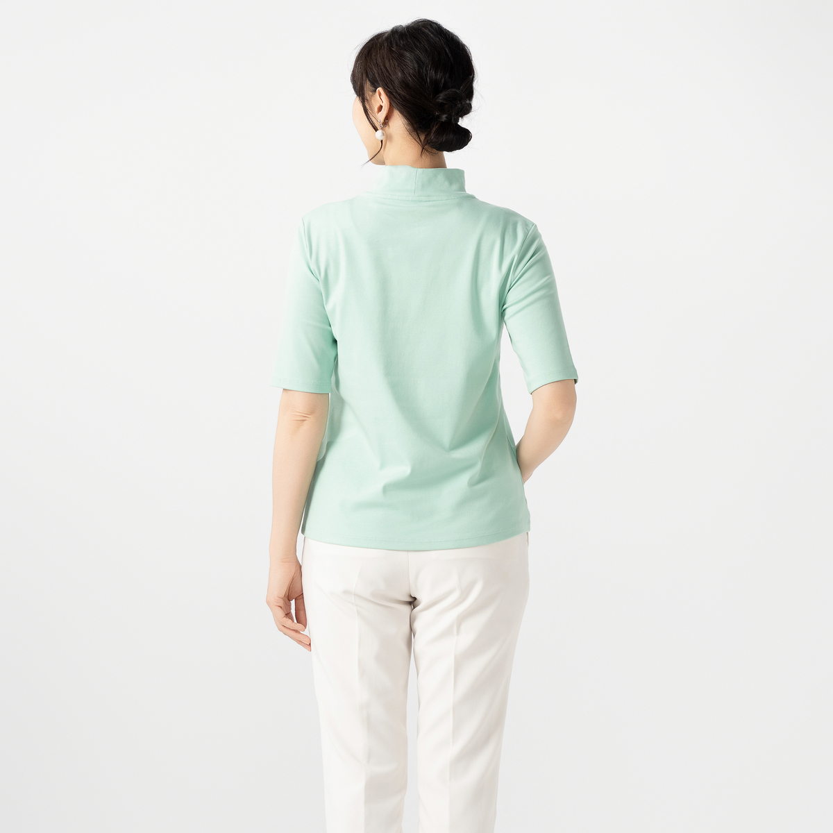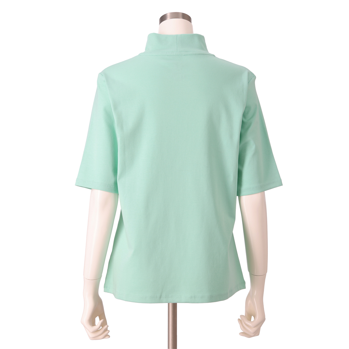 シルキーなコットン混素材で作られた、肌触りの良い半袖ハイネックプルオーバーです