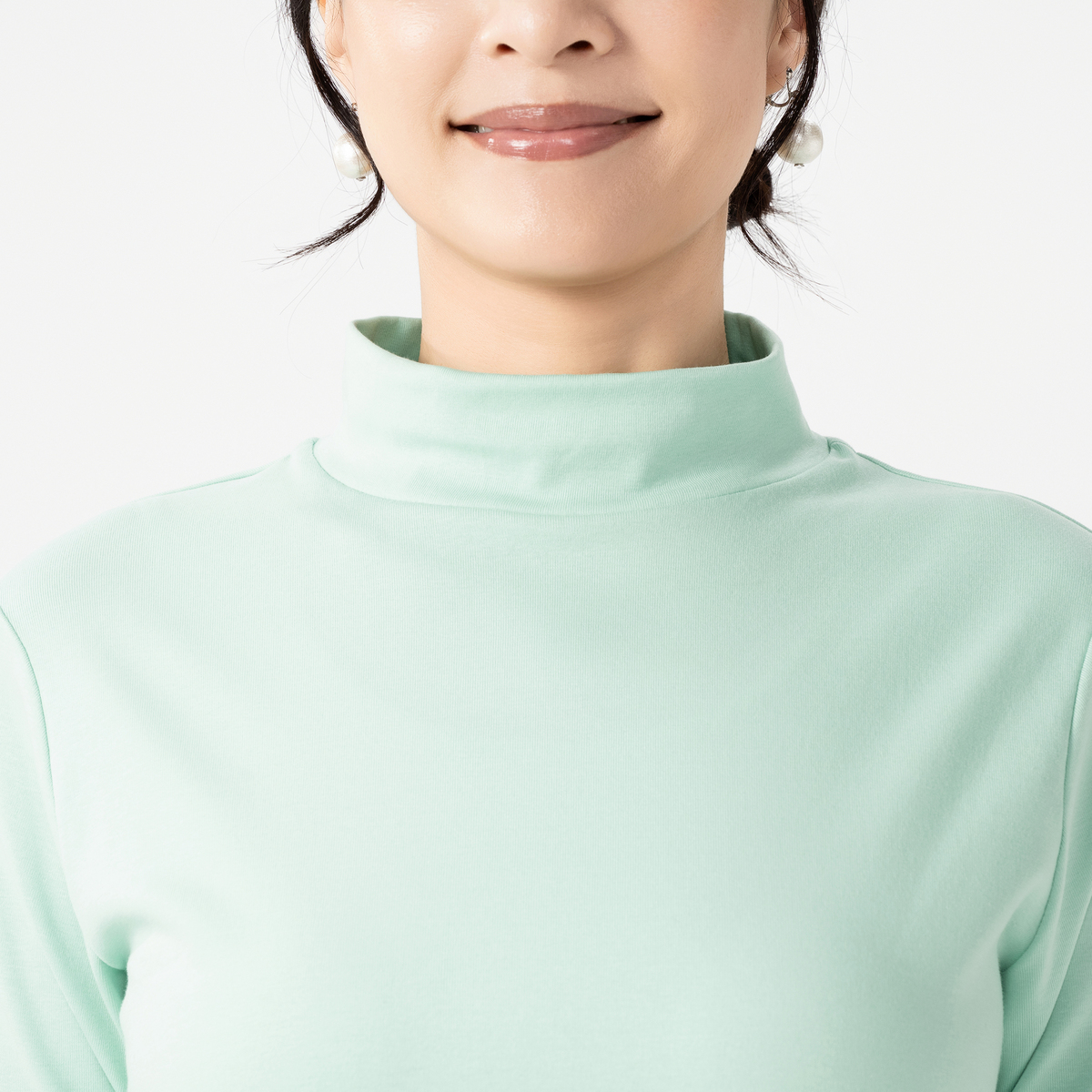 ほどよい高さのハイネック。シンプルなデザインで、様々なコーディネートに合わせやすい一枚です