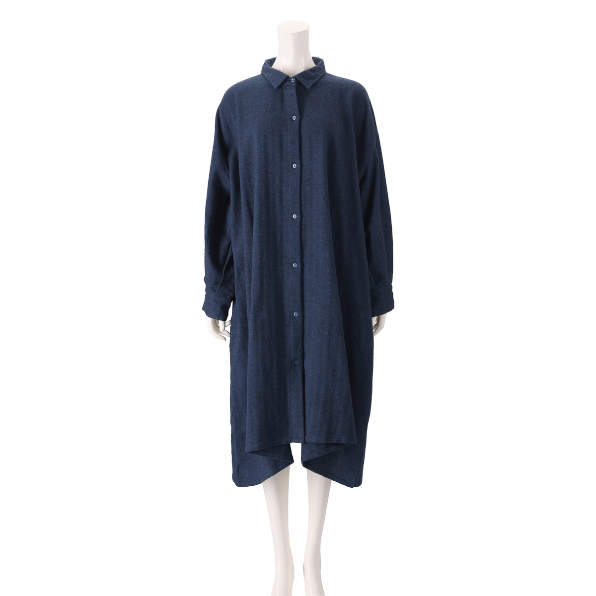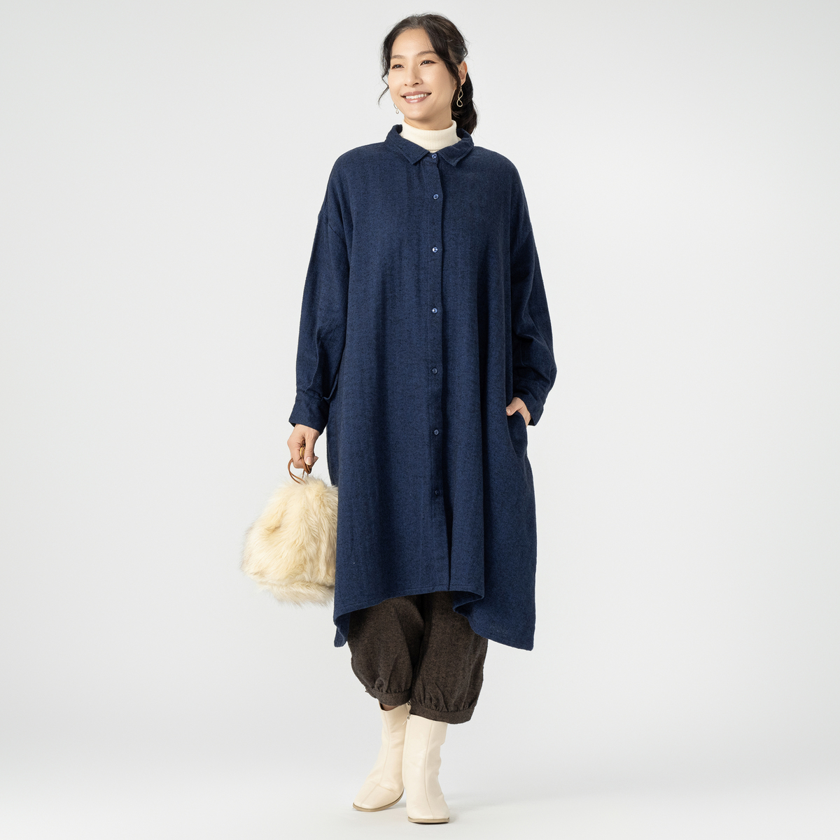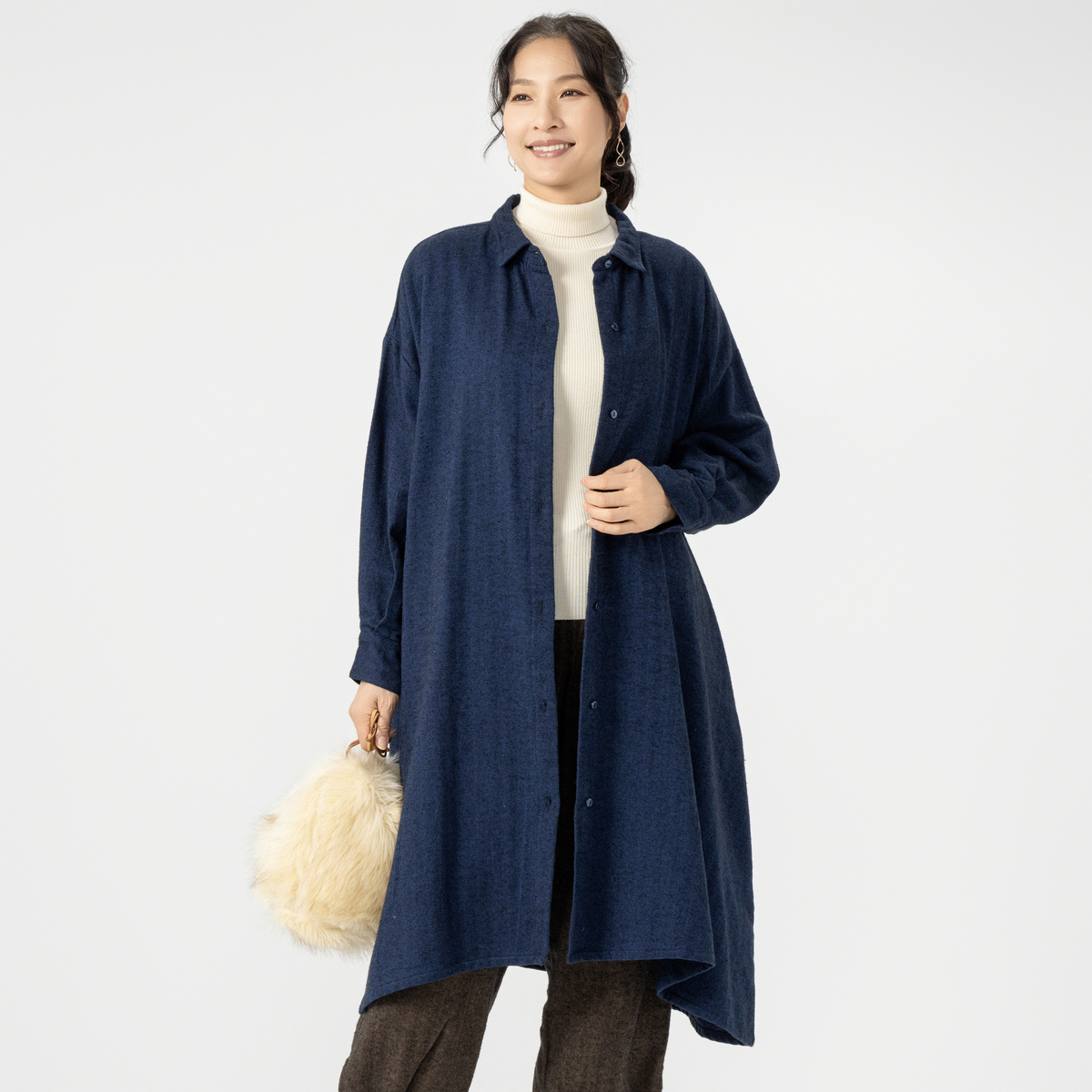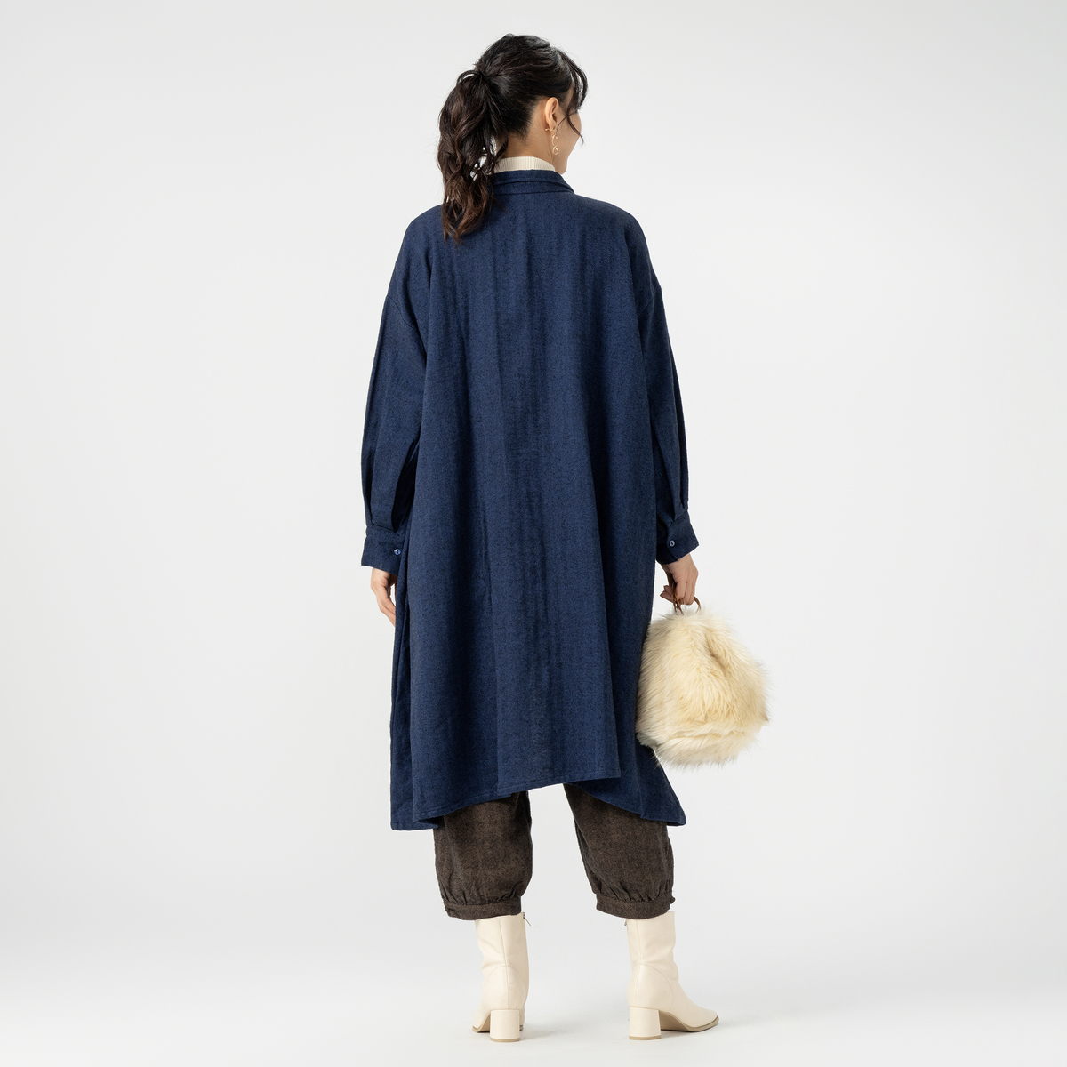 コットン混ツイードで仕立てたワンピースジャケット。一枚でシンプルなワンピースとしてはもちろん、ロングジャケットとしてレイヤードスタイルも楽しめます