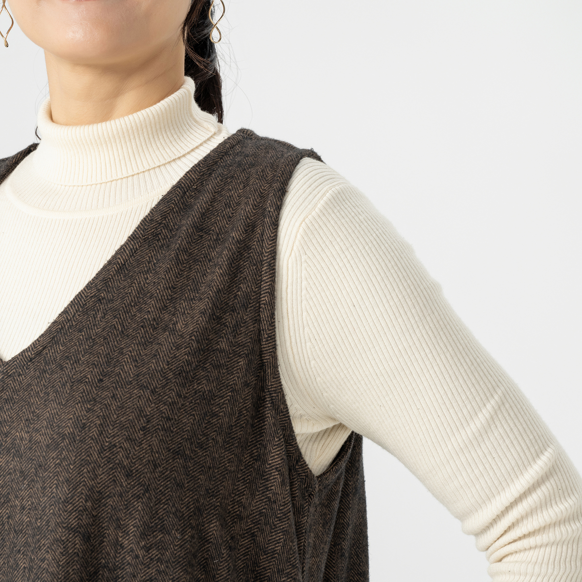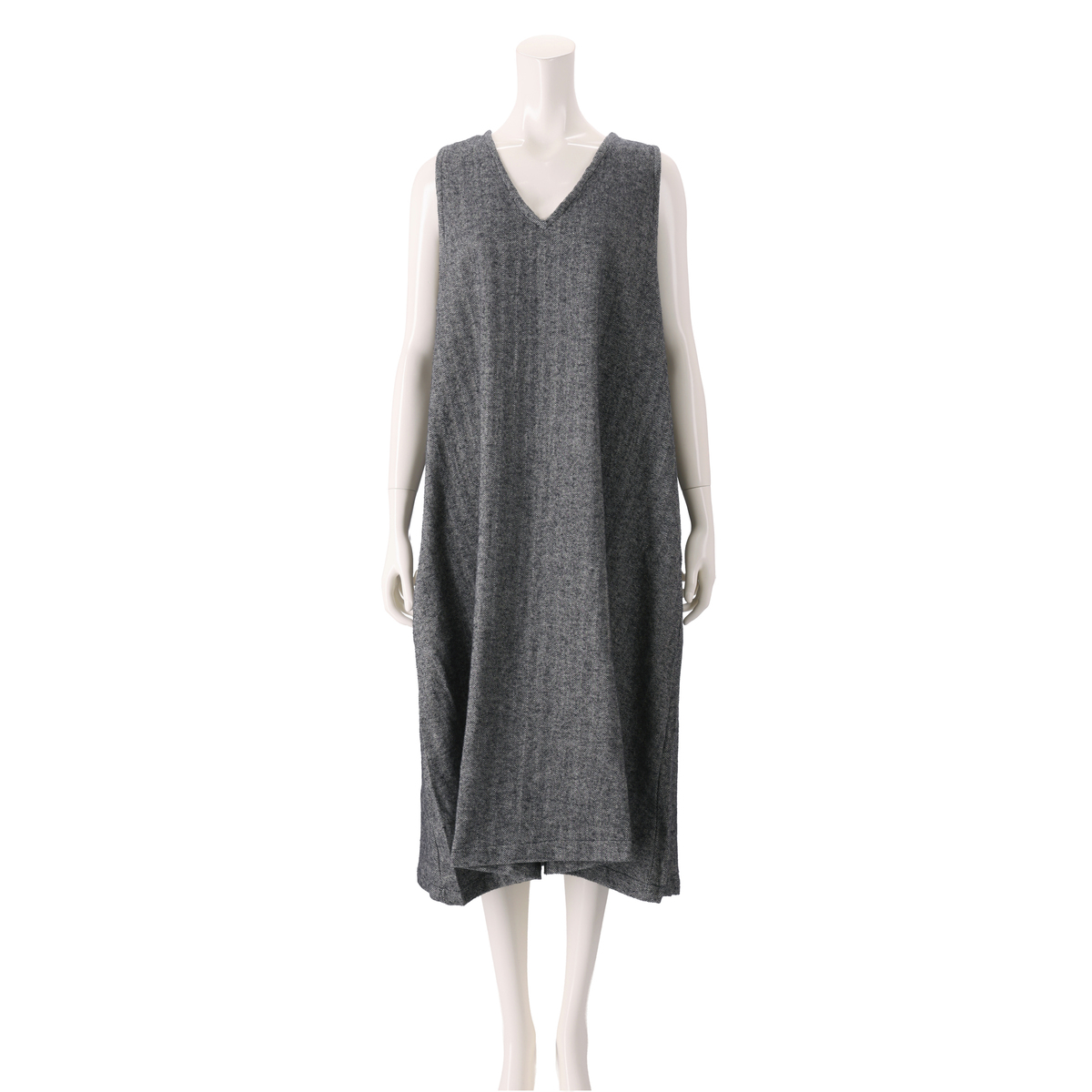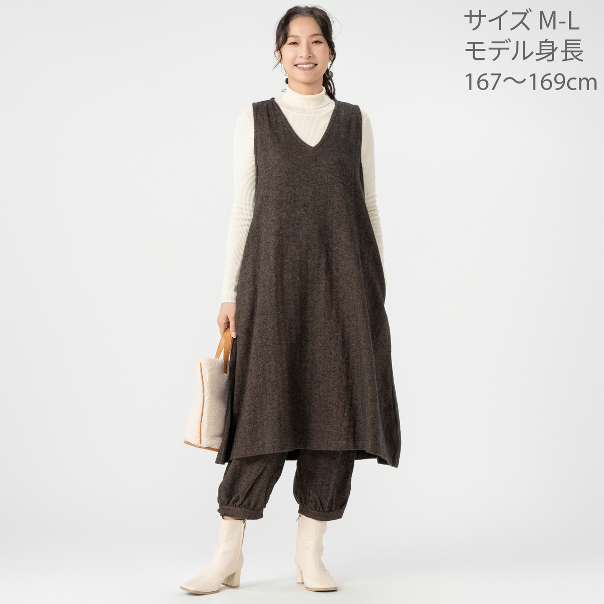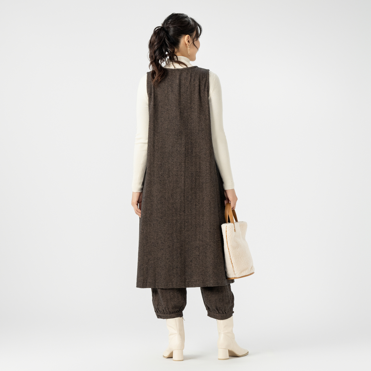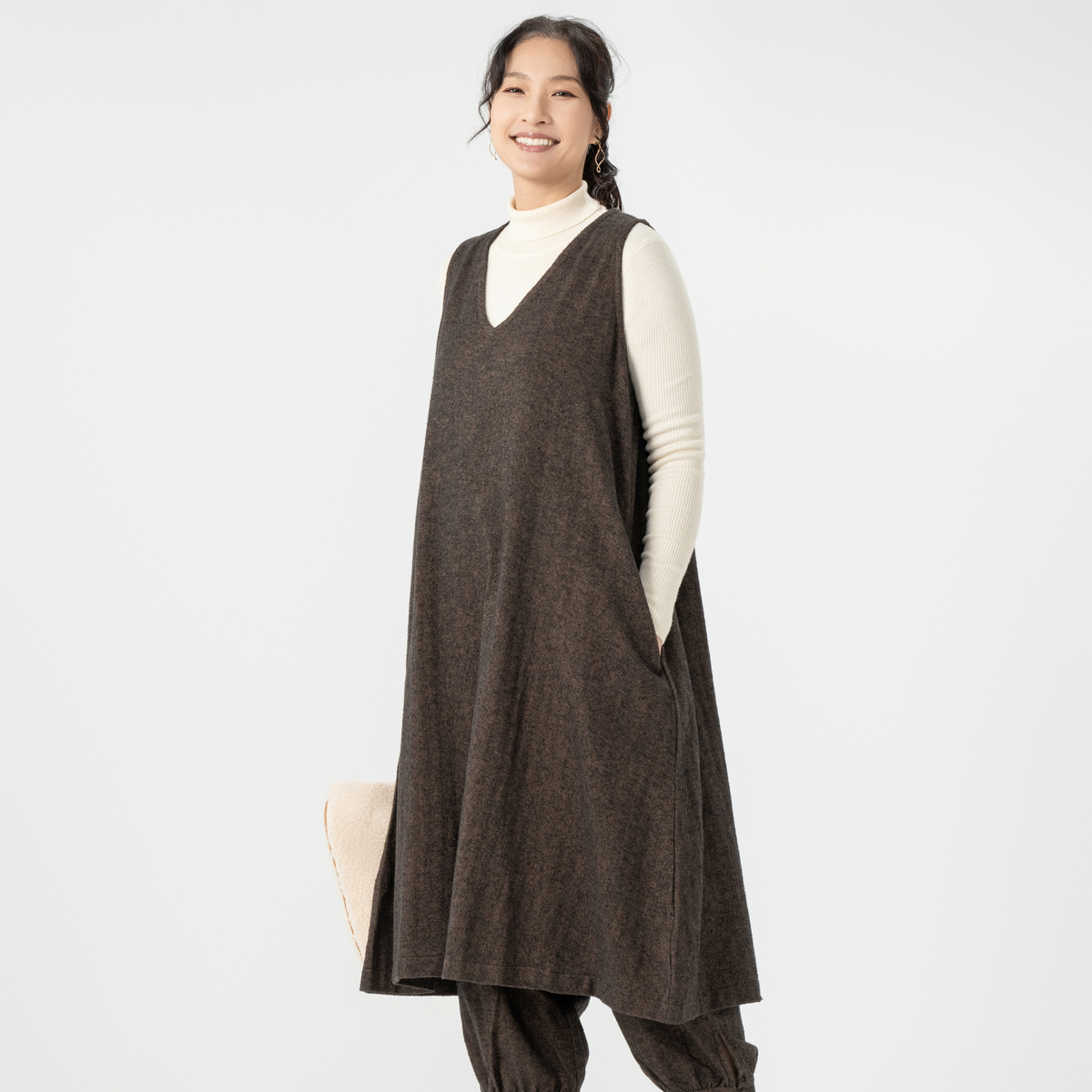 インド綿100%で仕立てたジャンパースカート。ツイード織の暖かみと奥行きのある生地感。アームホールをたっぷり取っているため腕まわりもラクで、重ね着も無理なく楽しめます