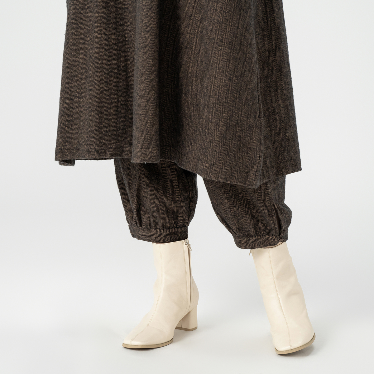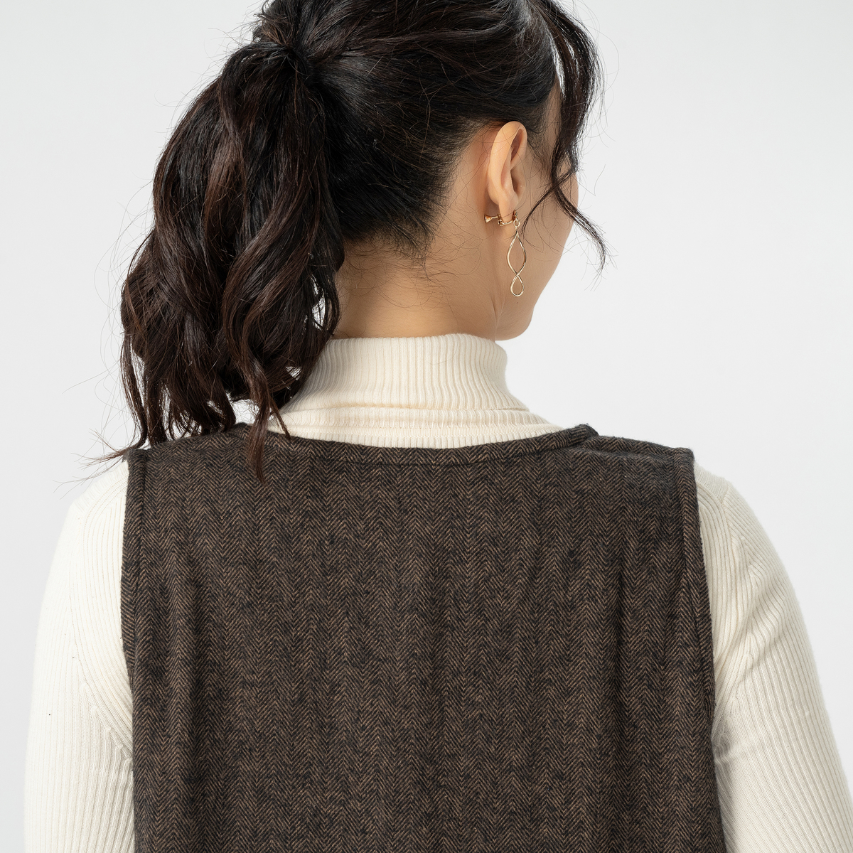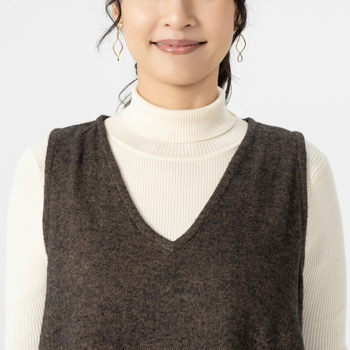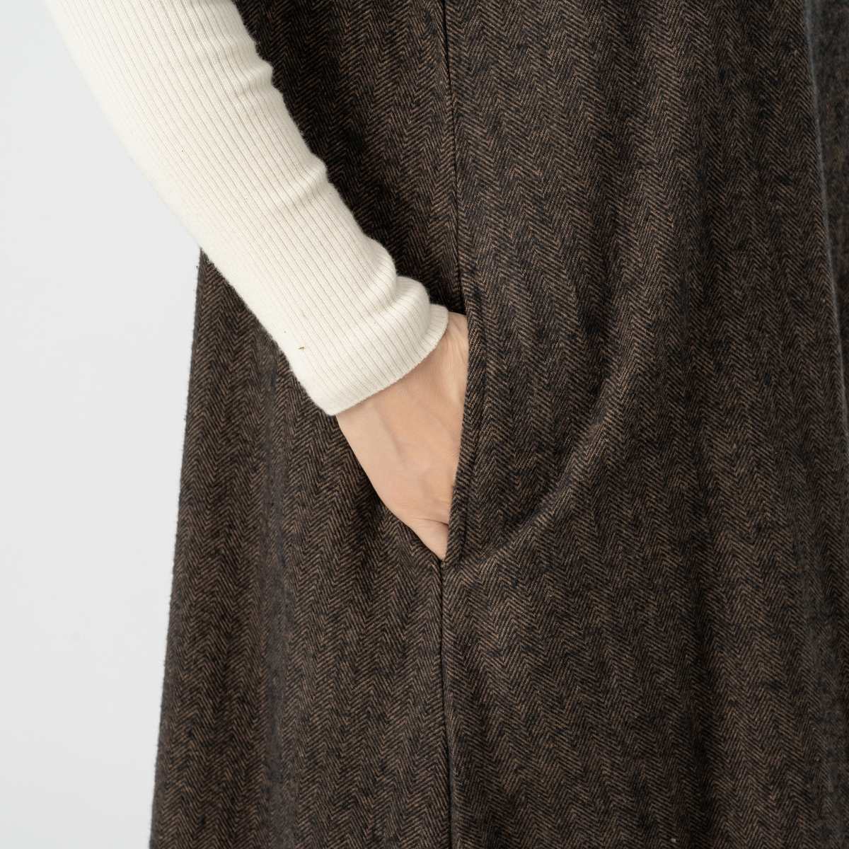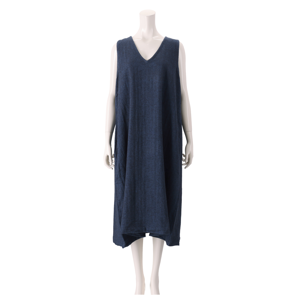 インド綿100%で仕立てたジャンパースカート。ツイード織の暖かみと奥行きのある生地感。アームホールをたっぷり取っているため腕まわりもラクで、重ね着も無理なく楽しめます