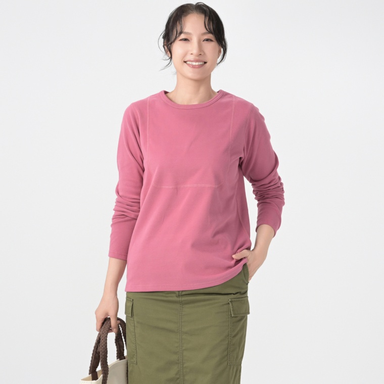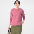 高密度でコットン高混率の天竺に裏起毛をかけた素材を使用。縫い代は全て3本針ステッチで押さえてあり、裏糸にはウーリー糸を使い、肌あたり良く始末しています。大きすぎず小さすぎず、着やすい分量感のクルーネックプルオーバーです