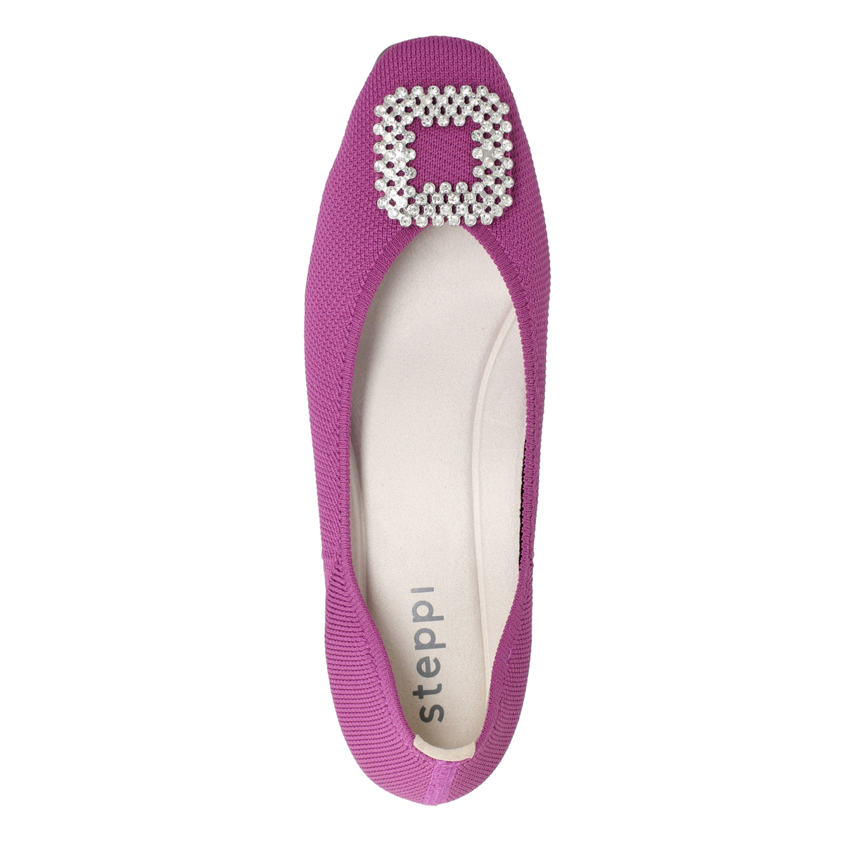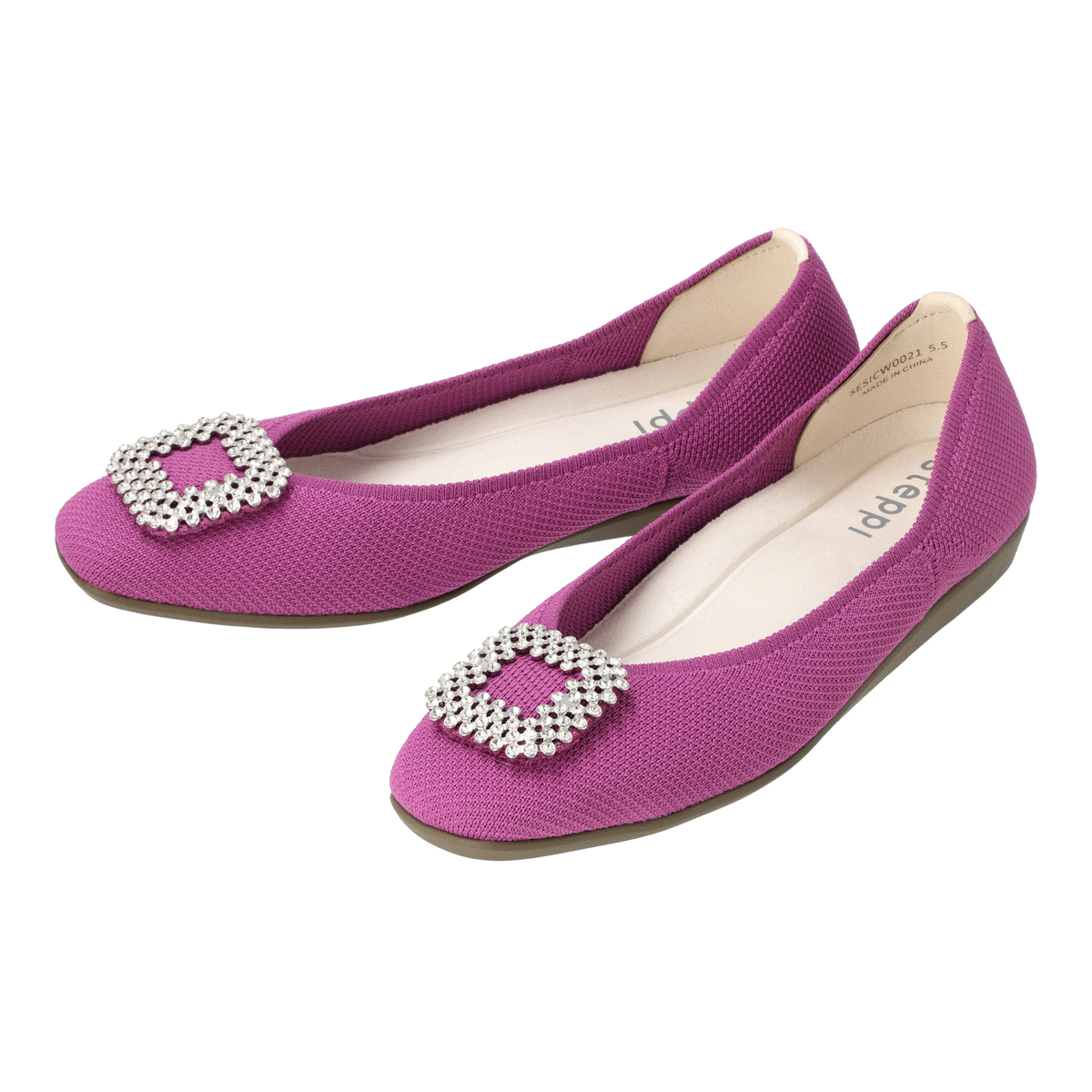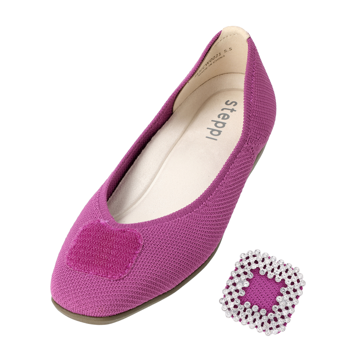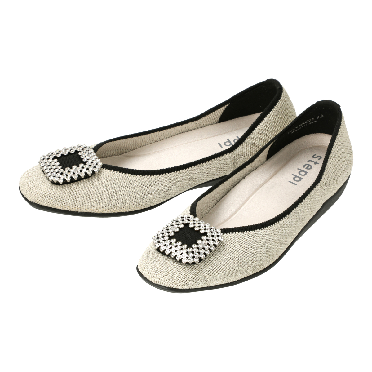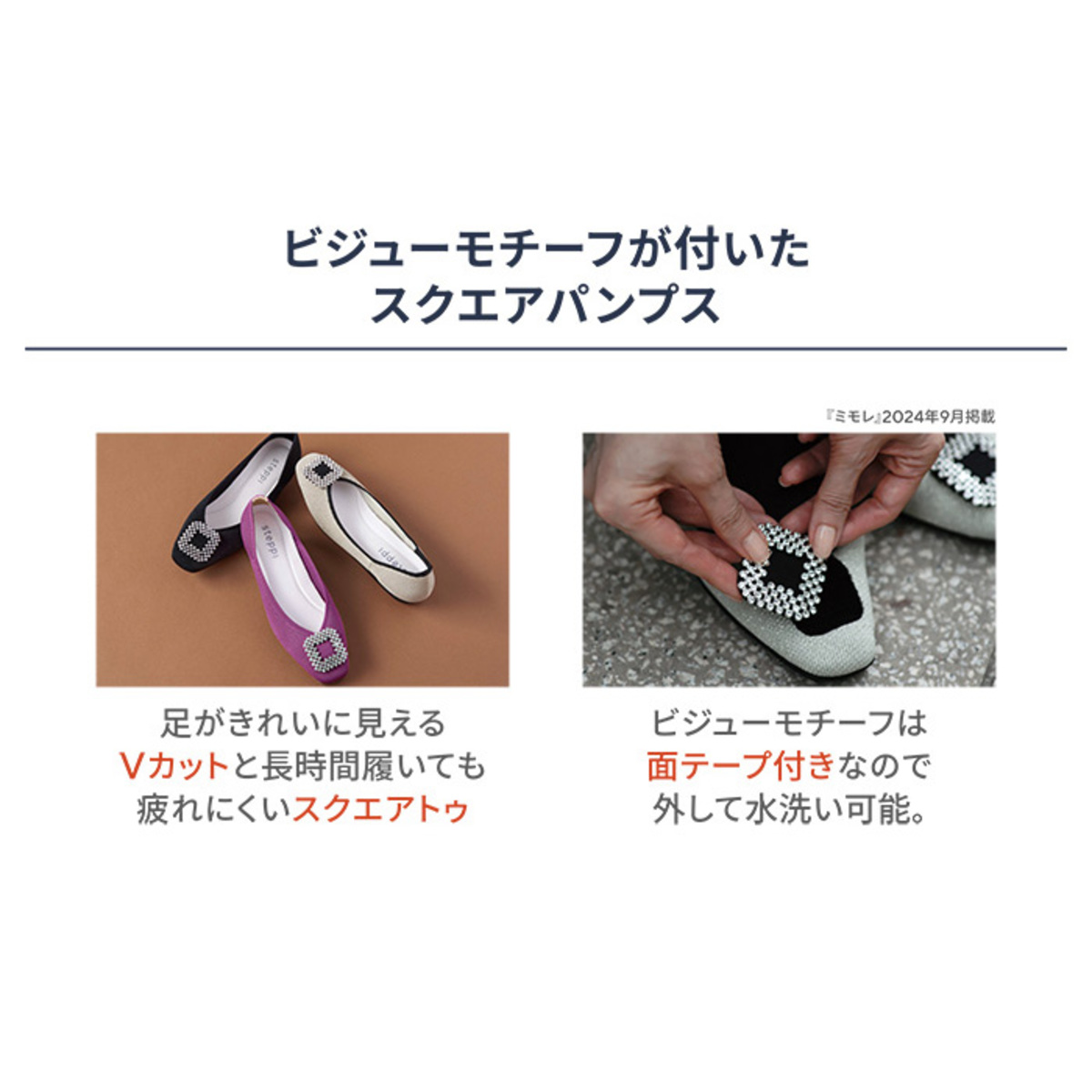 華やかなキラキラビジューのバックルが付いたニットパンプスです。すっきりとしたスクエアトゥで、足がきれいにみえるVカット。長時間履いても締め付け感が少なく疲れにくい形。ビジューモチーフは、面テープで取り外しが可能です