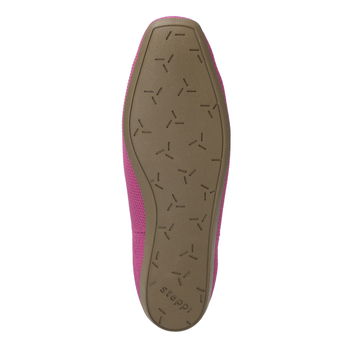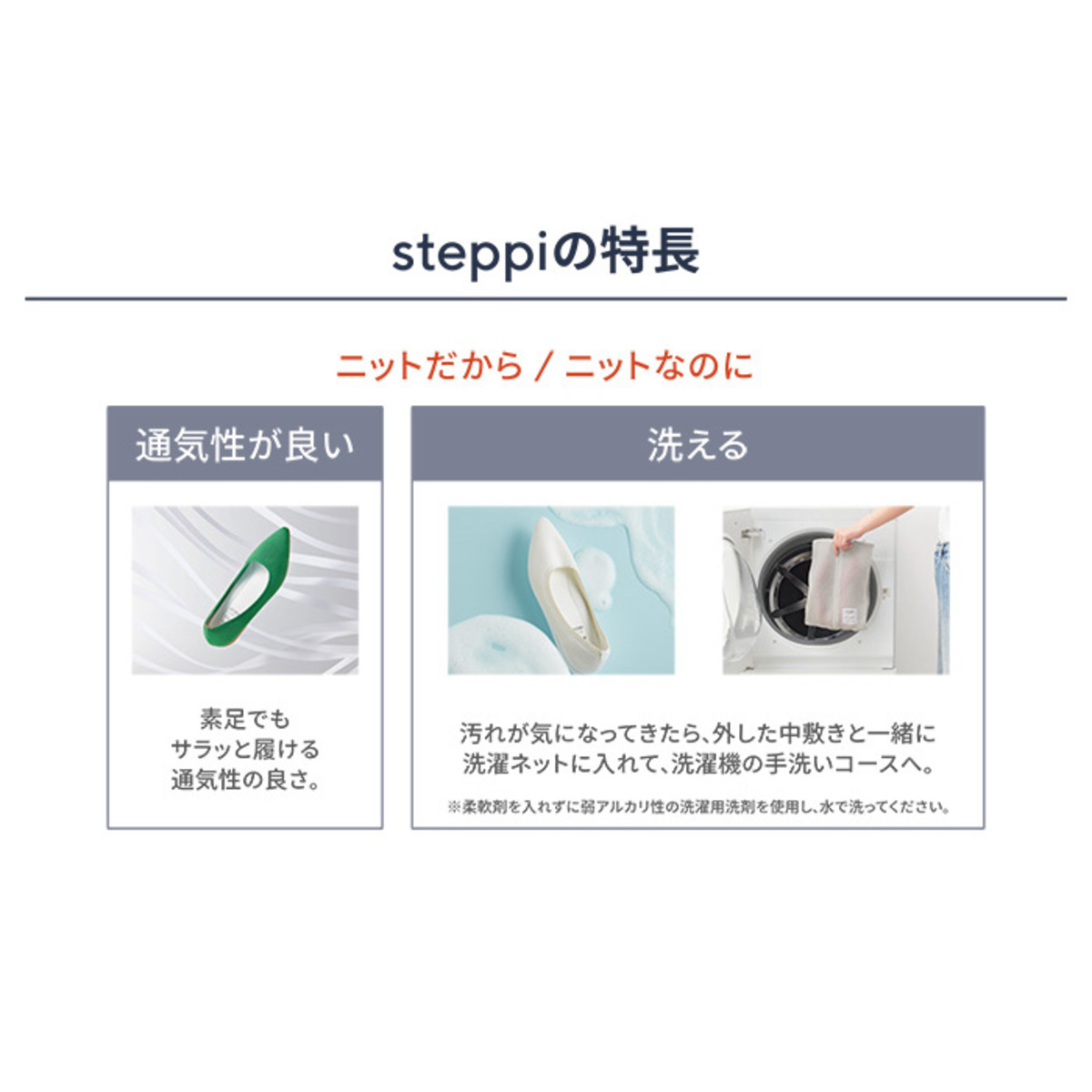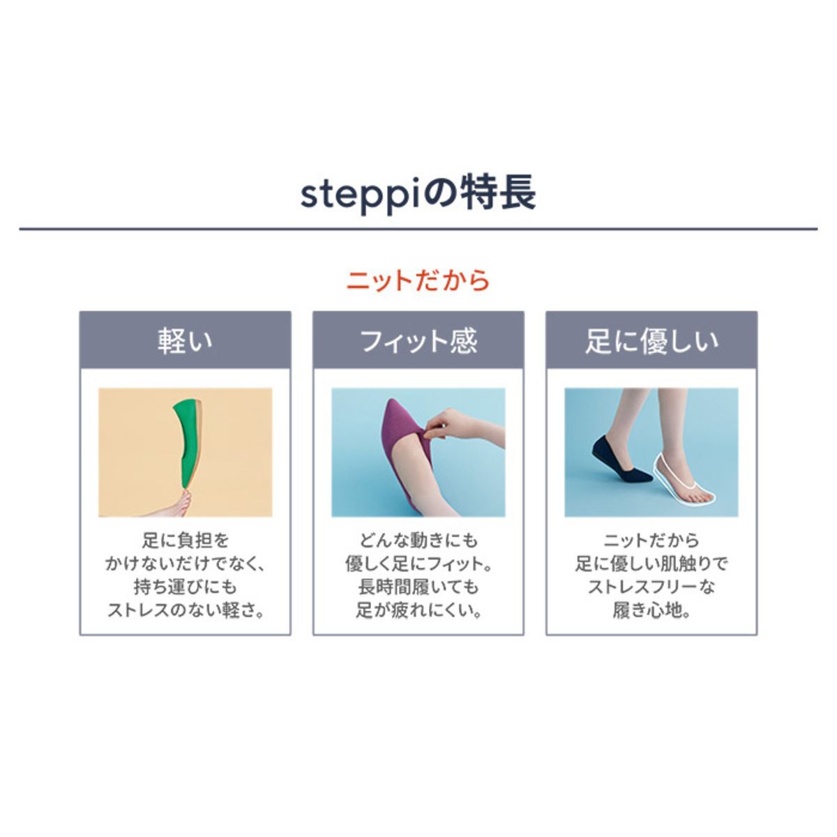 一枚仕立てのニットアッパーと発泡素材のアウトソールを使用。ポリエステルヤーンでしなやかに編みたてることで、裏材や芯材を使用せずに構成しています。中敷きは前スベリを抑え、靴の中で足が動かないようにする構造。アウトソールは軽くてクッション性があり、パンプスのきちんと感もある絶妙なバランスにしています