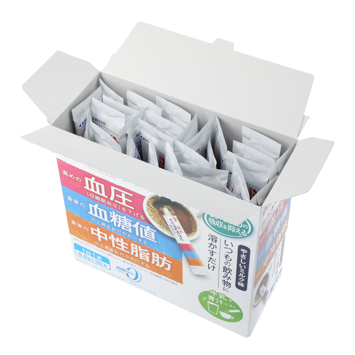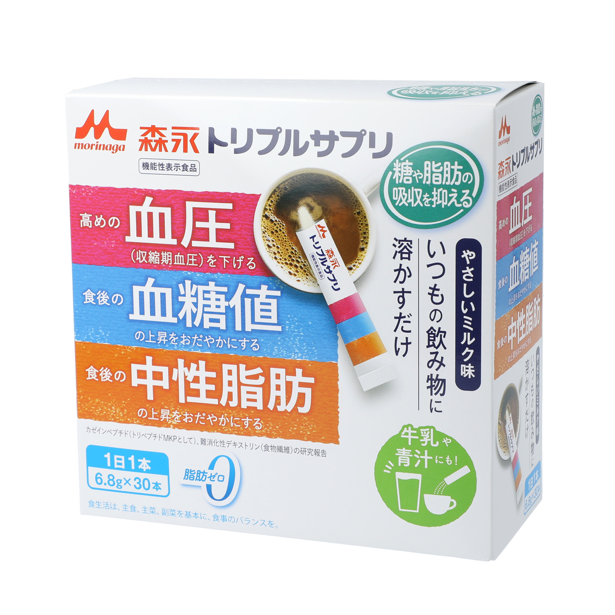 本品にはカゼインペプチド(トリペプチドMKPとして)と難消化性デキストリン(食物繊維) が含まれます。カゼインペプチド(トリペプチドMKPとして)には、高めの血圧(収縮期血圧)を下げる機能、難消化性デキストリン(食物繊維)には、糖や脂肪の吸収を抑える機能、食後の血糖値や血中中性脂肪の上昇をおだやかにする機能が報告されています