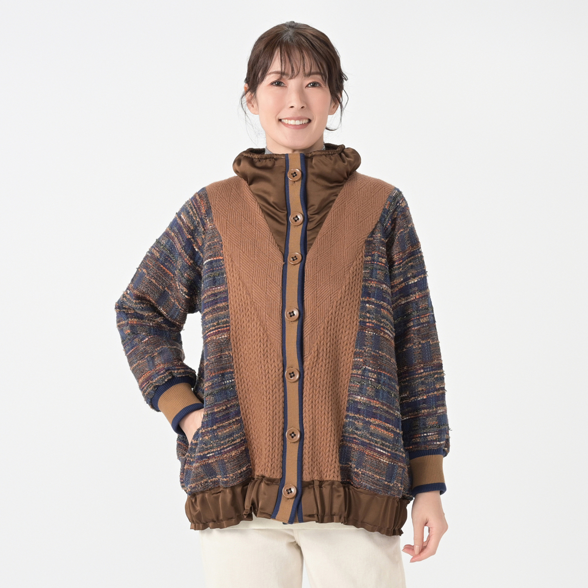 身頃と袖に高級感のあるファンシーツイードを使用したブルゾン。前中心の切り替えにケーブル柄とダイヤ柄のカットソーを組合せたデザインが特徴です。ストレッチの裏地を使用した総裏地仕立て。裏地は伸縮するので、柔らかい肌触りです