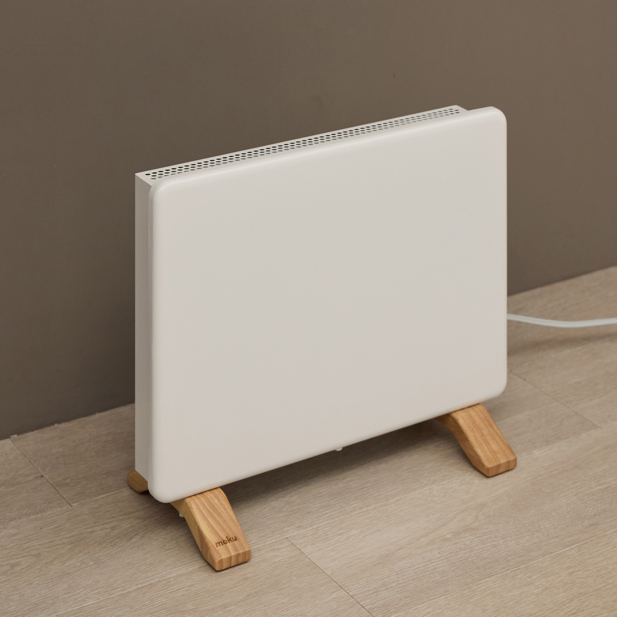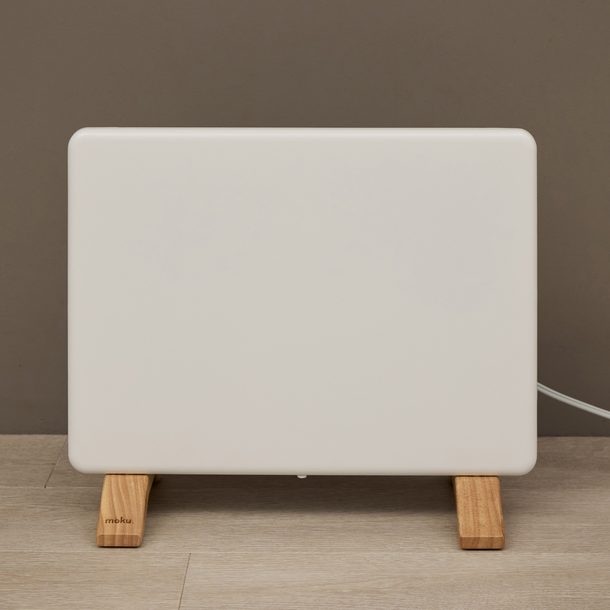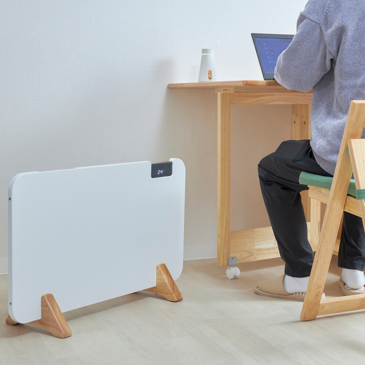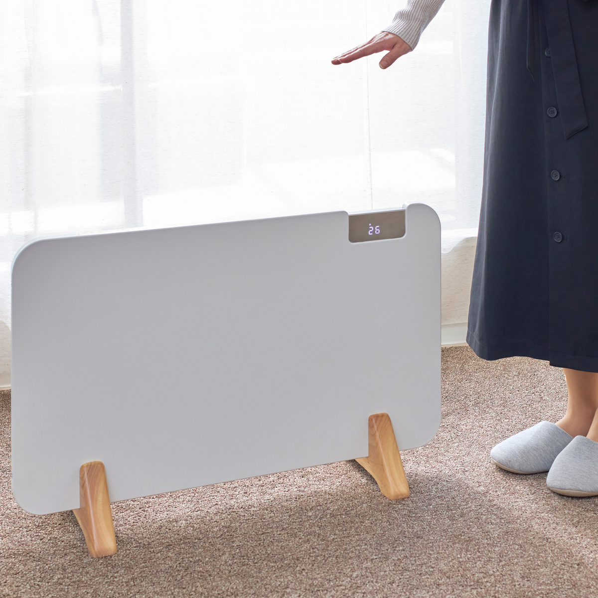 ゆっくりと時間をかけて部屋を暖めるしくみで、冬の陽だまりにいるような自然な暖かさを感じることができる暖房です。木目と白を基調とした、お部屋に馴染むシンプルデザインで、スタンド部分は天然木を使用。個体による木目や節や色味など、1つ1つの風合いも楽しめます
