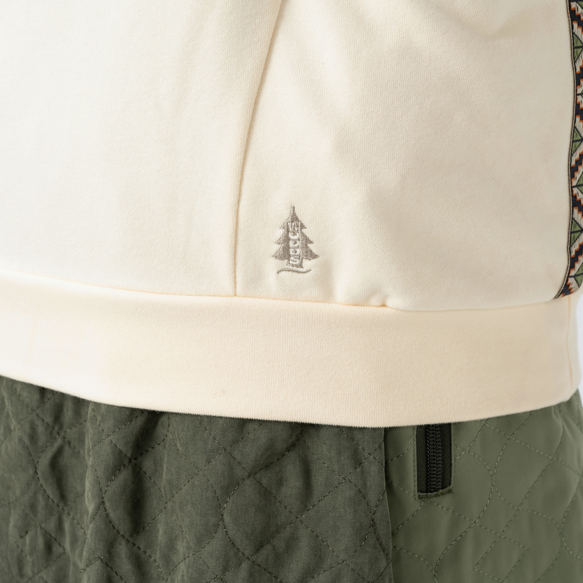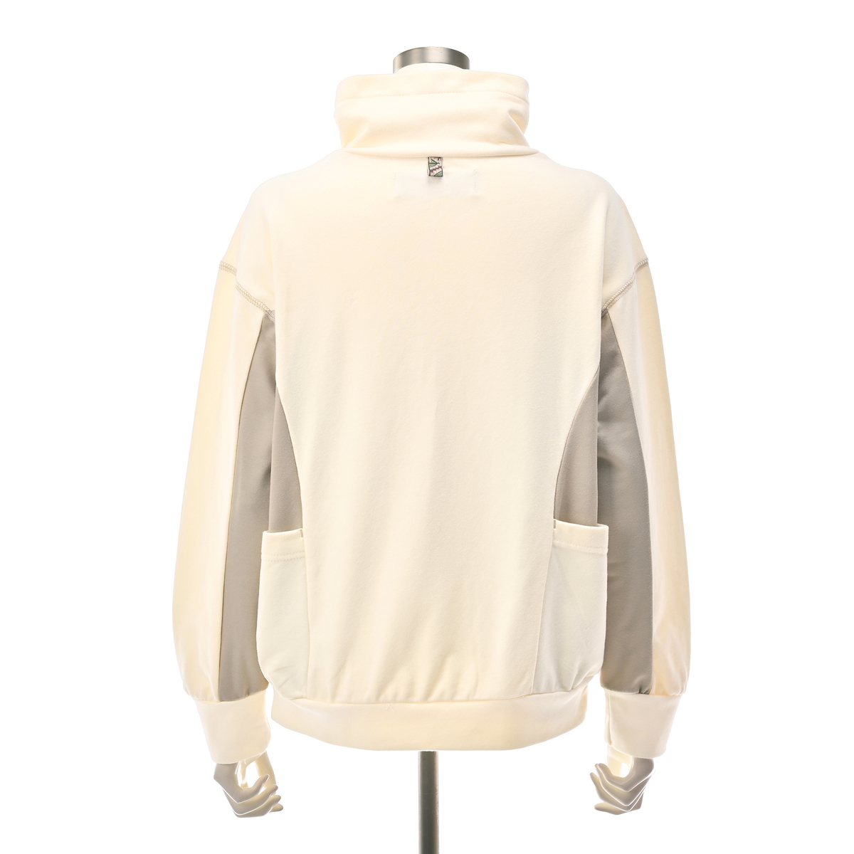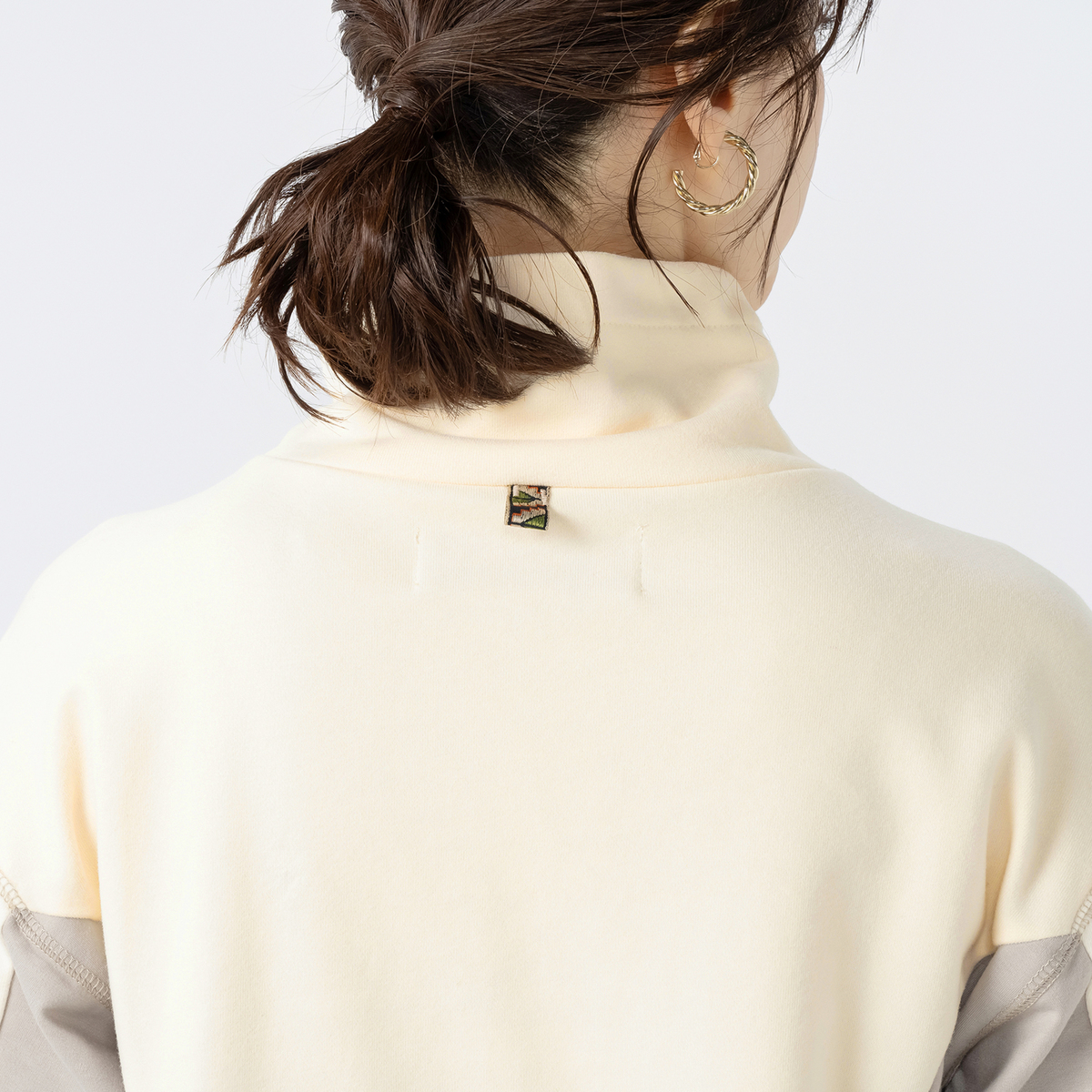 前で重ね衿になった変形ハイネックデザイン。ネックの後ろとポケット中央に柄テープを配して個性をプラスしています。肩と袖の接ぎ目部分には、さり気ない配色の振りロックをアクセントで入れました