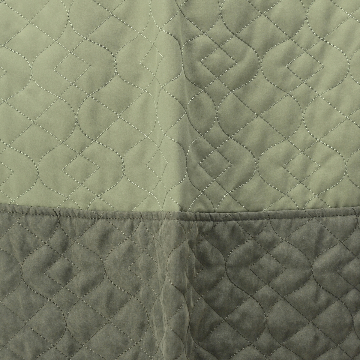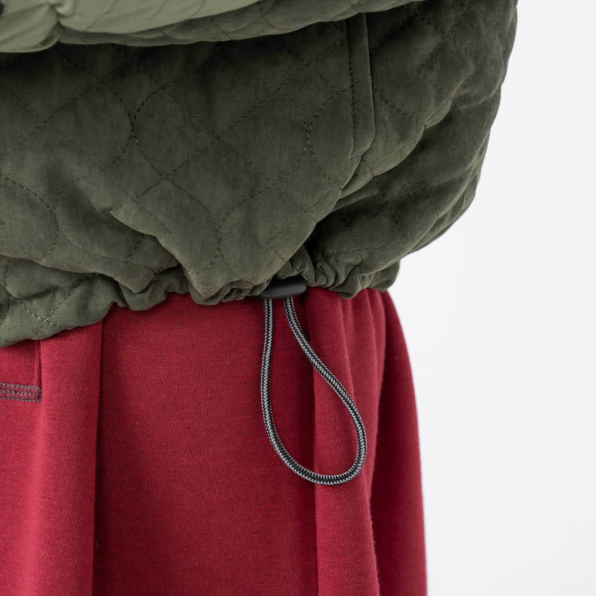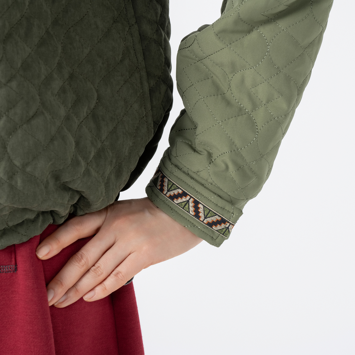 中わたキルトを使ったジャケット。同系色の濃淡で異素材を組合せてデザインしました。波型と直線の入り混じったキルトステッチが、シャープな印象も添えつつ、個性を引き立てます