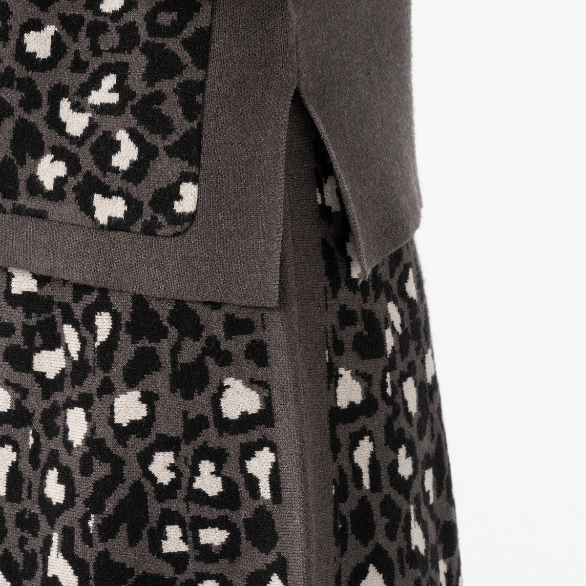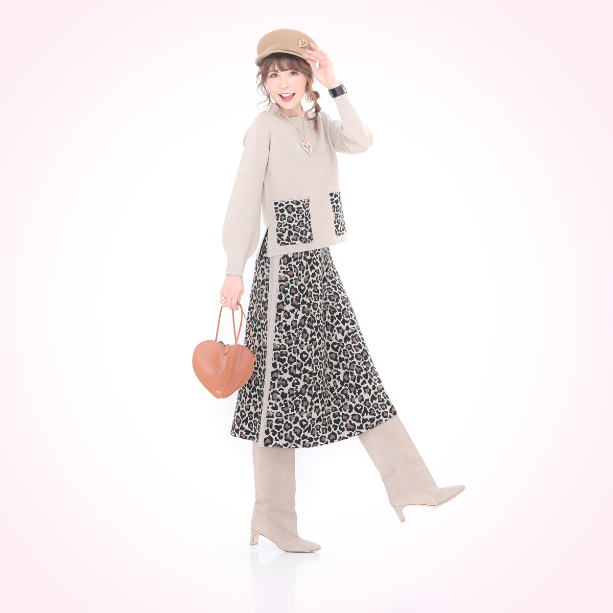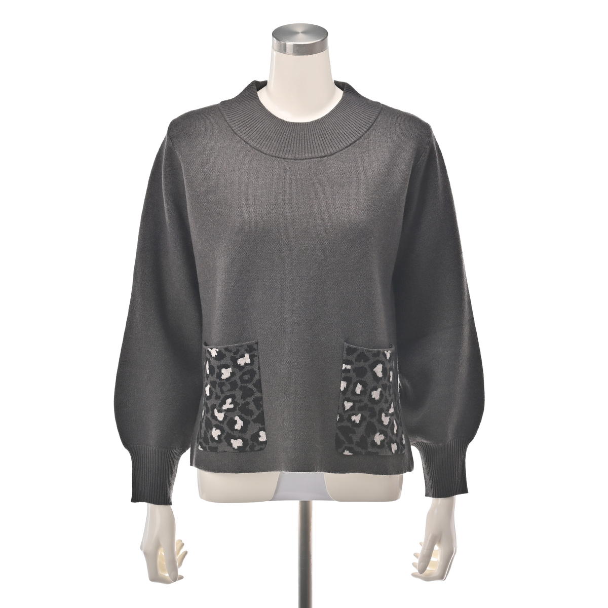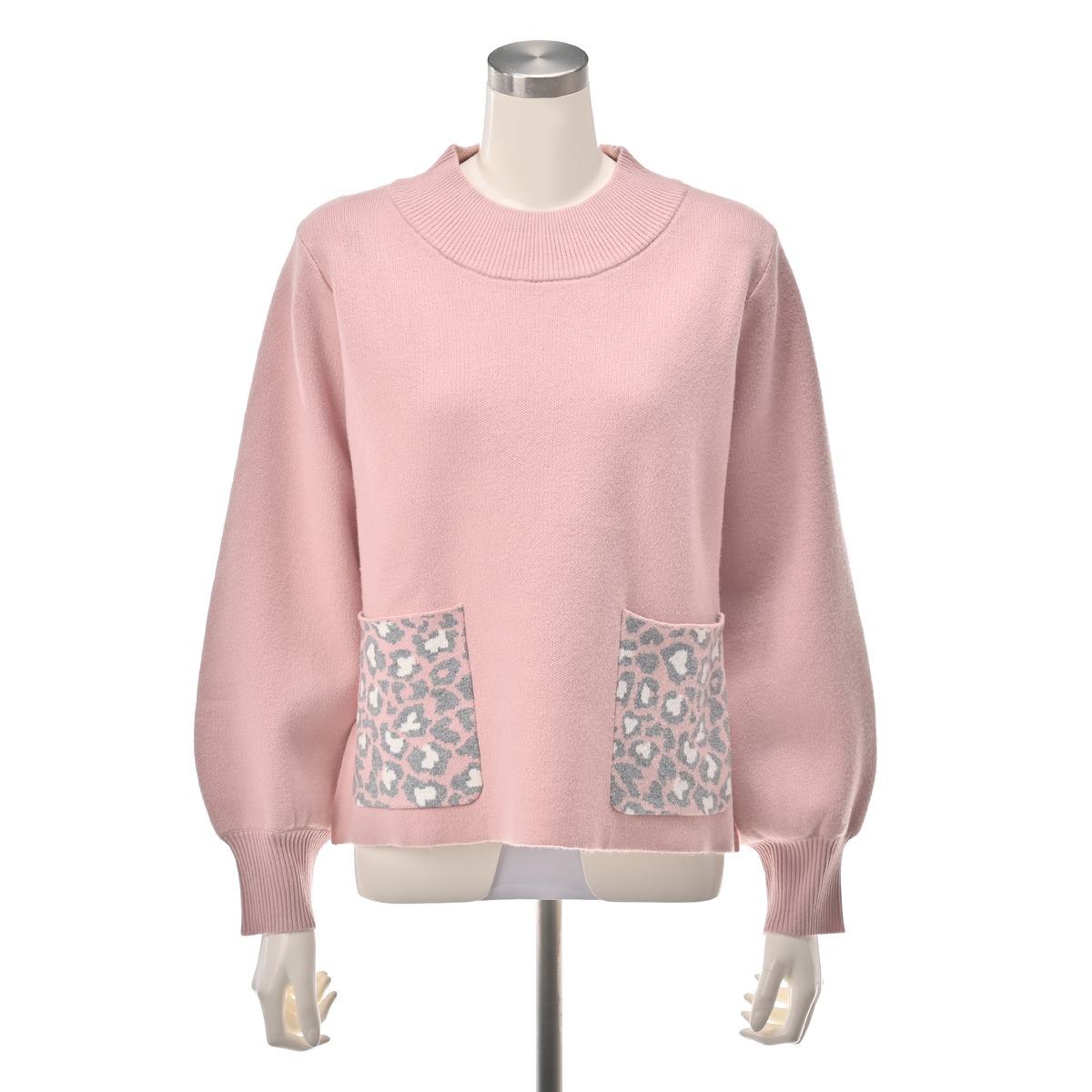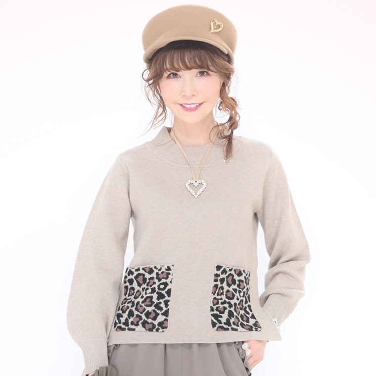 ゆったりとしたモックネックでリラックスして着られるニットプルオーバーです。ハート×ヒョウ柄のポケットがアクセントに。無地の控えめなボディで、シーンを選ばず活躍します
