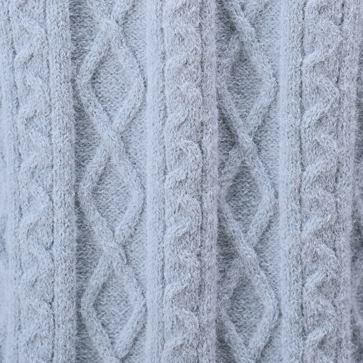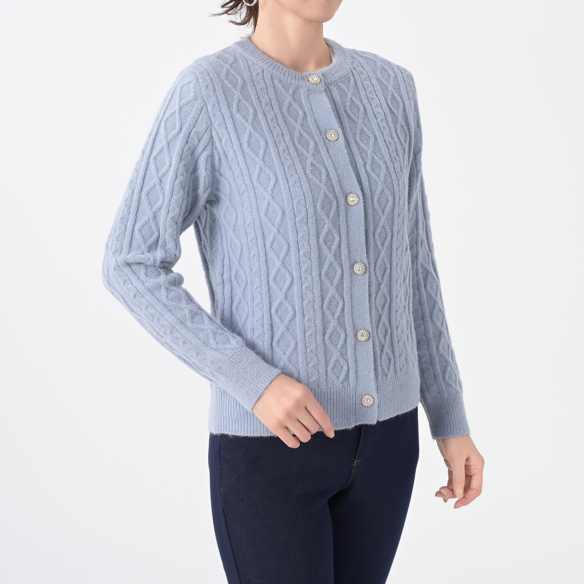 ふっくらしたウォーム感ともちもちの風合いが楽しめるニット素材で仕立てたカーディガン。立体的なケーブル編みとリブ仕上げの衿ぐり、袖口、裾もポイントです