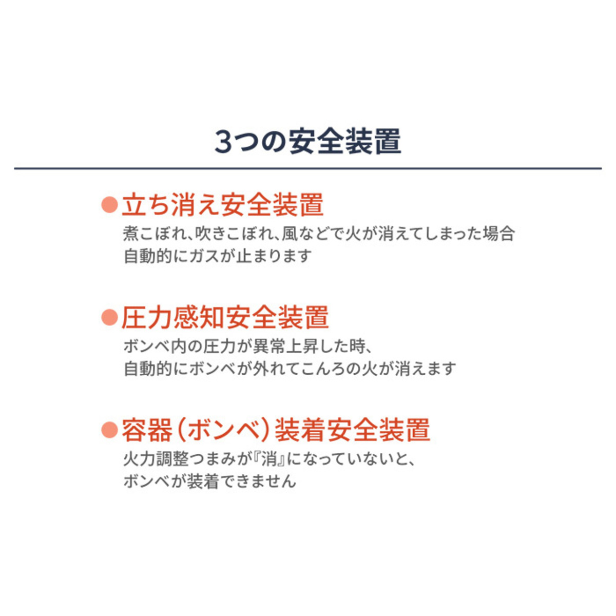圧力感知安全装置、立ち消え安全装置、容器装着安全装置を搭載。3カ所の点火確認窓で、様々な角度から炎の状態を確認できます。電源不要のカセットコンロは、防災備蓄品としても重宝します
