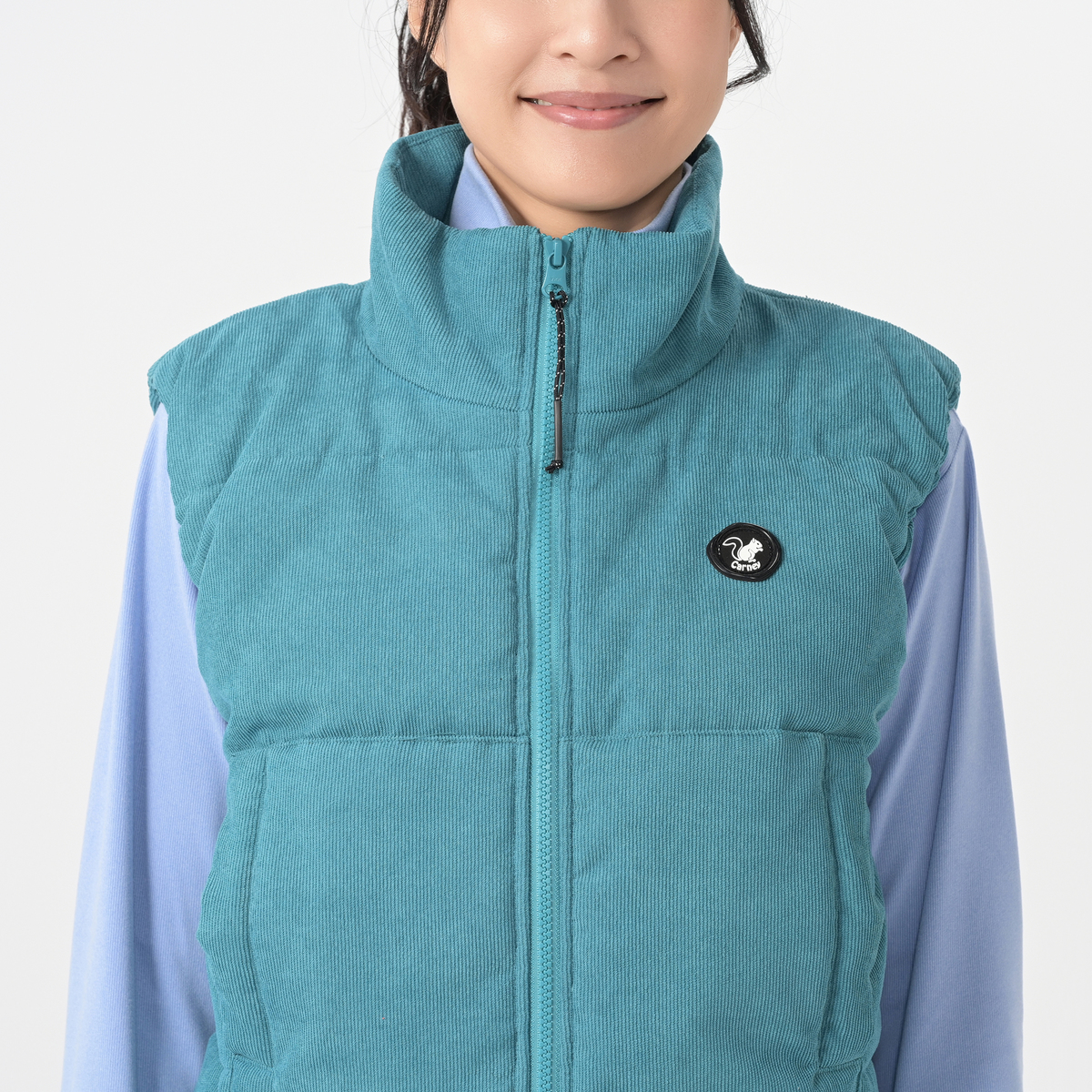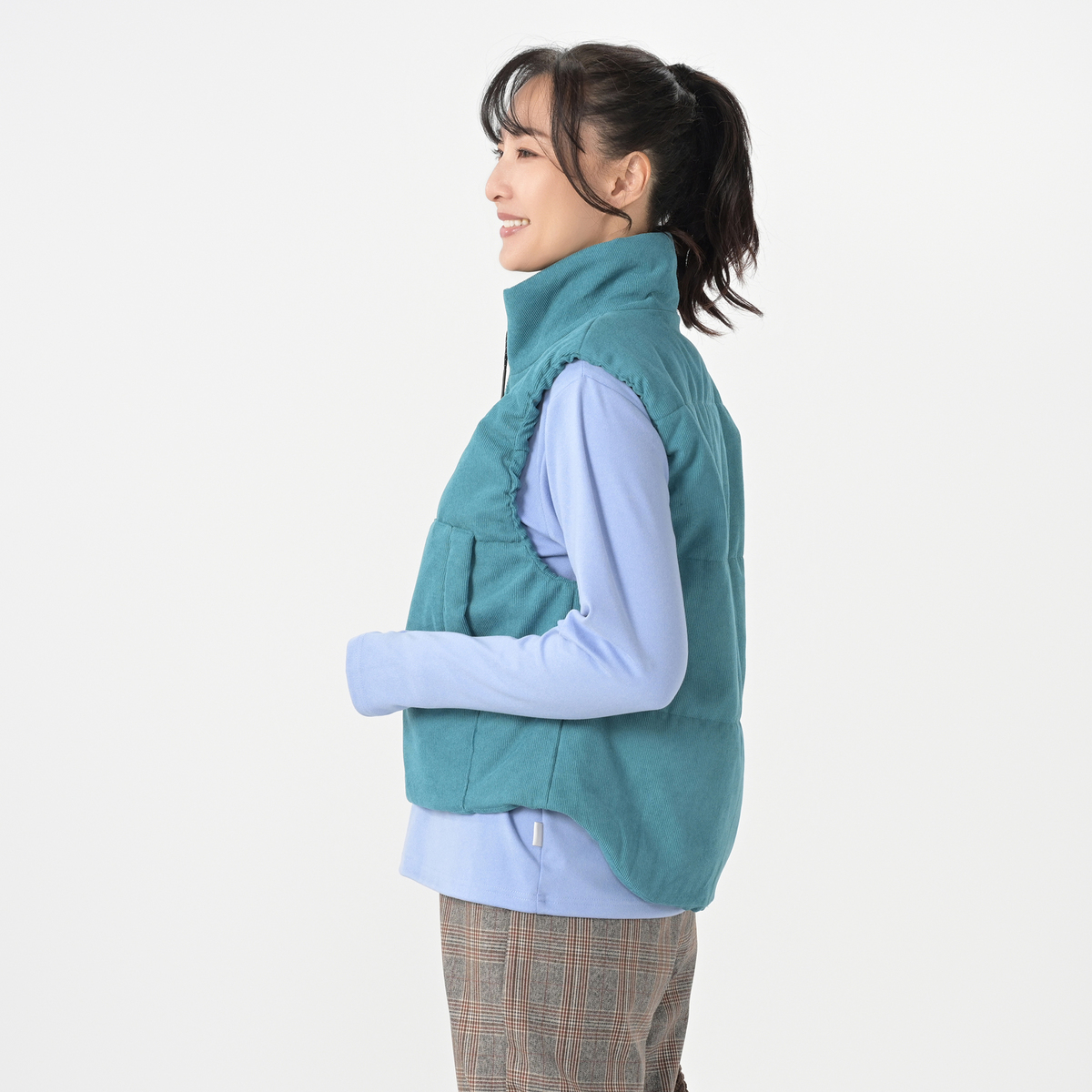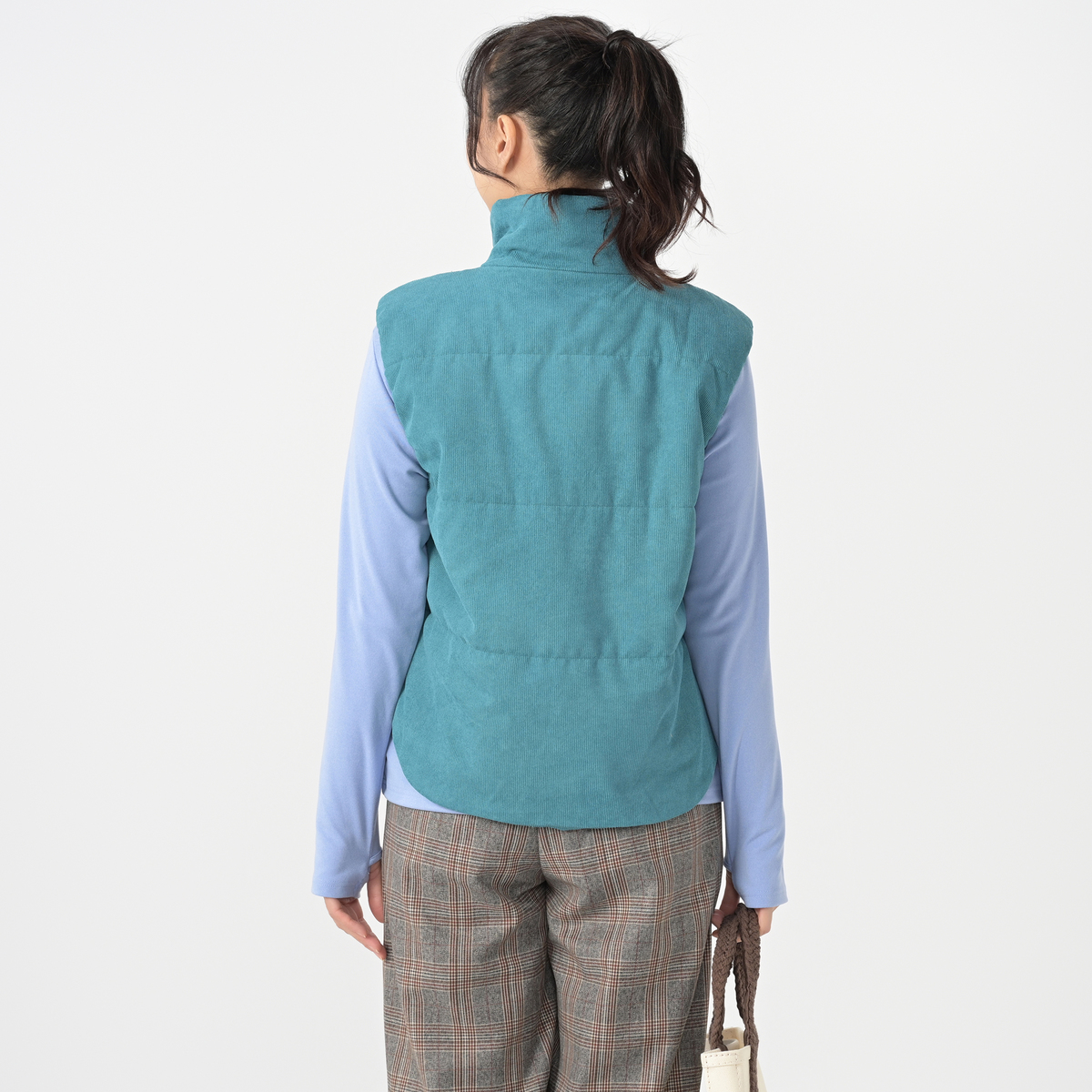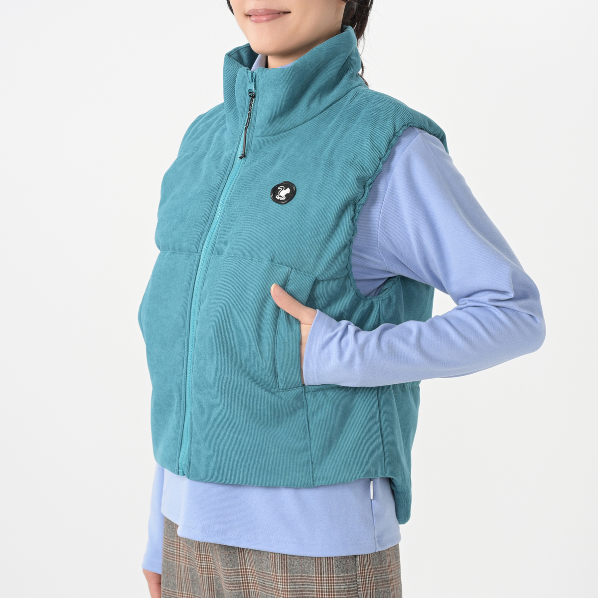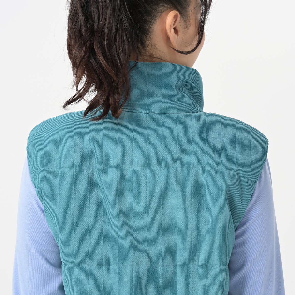 柔らかな細畝のポリエステルコーデュロイを使用した中綿ベスト。スタンドカラーでフロントジップのショート丈で、脇から後ろにかけて丈を長くして、腰まわりも暖かく仕上げています。身頃には3本のキルトステッチをかけて綿を止め、袖ぐりの縫い代に平ゴムを叩いて袖周りのフィット感を高めました。フロントにはポケット付きです