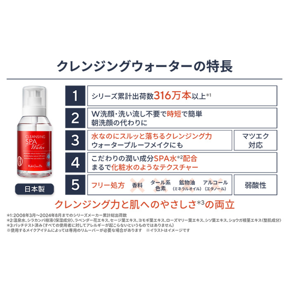 [商品内容] 江原道 クレンジングウォーター 380mL [使用方法] ・使い始めはポンプにコットンをあて、中身が出るまで数回押してください ・適量をコットンに含ませ、メイクがつかなくなるまでやさしく拭き取ってください。洗い流す必要はありません ※ポンプには必ずコットンをあて、受け皿の穴を指でふさがないように、ゆっくり押してください。コットンをあてずにポンプを押すと、中身が勢いよく飛び散ります ※受け皿に中身が 残らないよう、必ず拭き取ってください ※横にするとノズルに残った中身が垂れますので注意してください ※一度使用した汚れたコットンで再度ポンプを押さないでください [注意事項] ※お肌に異常が生じていないかよく注意して使用してください ※傷、はれもの、湿疹など、異常のある部位には使用しないでください ※使用中、または使用したお肌に直射日光があたって、赤み、はれ、かゆみ、刺激、色抜け(白斑など)や黒ずみなどの異常が現れたときは使用を中止し、皮膚科専門医などへ相談してください。そのまま使用を続けますと症状が悪化することがあります ※目に入ったときは、直ちに洗い流してください。すすいでも異物感が残るときや異常が現れたときは、眼科専門医に相談してください ※経時などにより性状や色(白濁など)、匂いなど多少変化することがありますが、使用に問題はありません ※いったん取り出した化粧品を容器の中に戻さないでください ※使用後は必ずしっかりキャップを閉めてください ※高温多湿、または極端に低温の場所や直射日光を避けて保管してください ※本製品を本来の用途以外に使用しないでください ※乳幼児の手の届かないところに保管してください 【日本製】 [成分] 水、DPG、ヤシ油脂肪酸PEG-7グリセリル、温泉水、シラカンバ樹液、ラベンダー花エキス、ローズマリー葉エキス、セージ葉エキス、シソ葉エキス、ヨモギ葉エキス、ショウガ根茎エキス、ステアラミドプロピルジメチルアミン、乳酸、アルギニン、BG、フェノキシエタノール、メチルパラベン