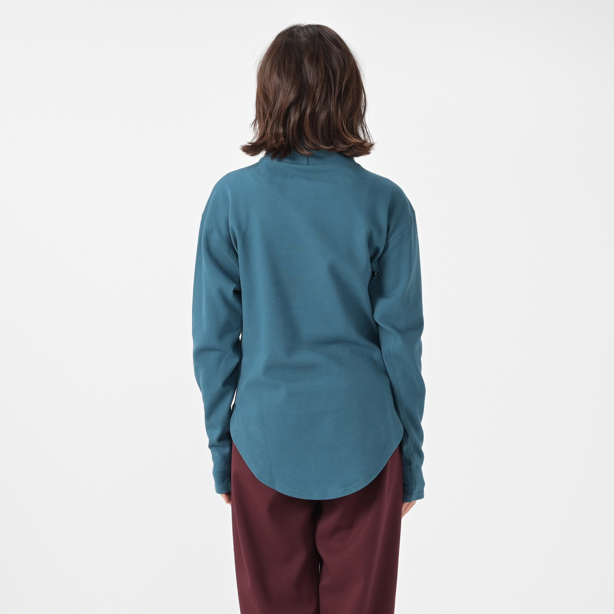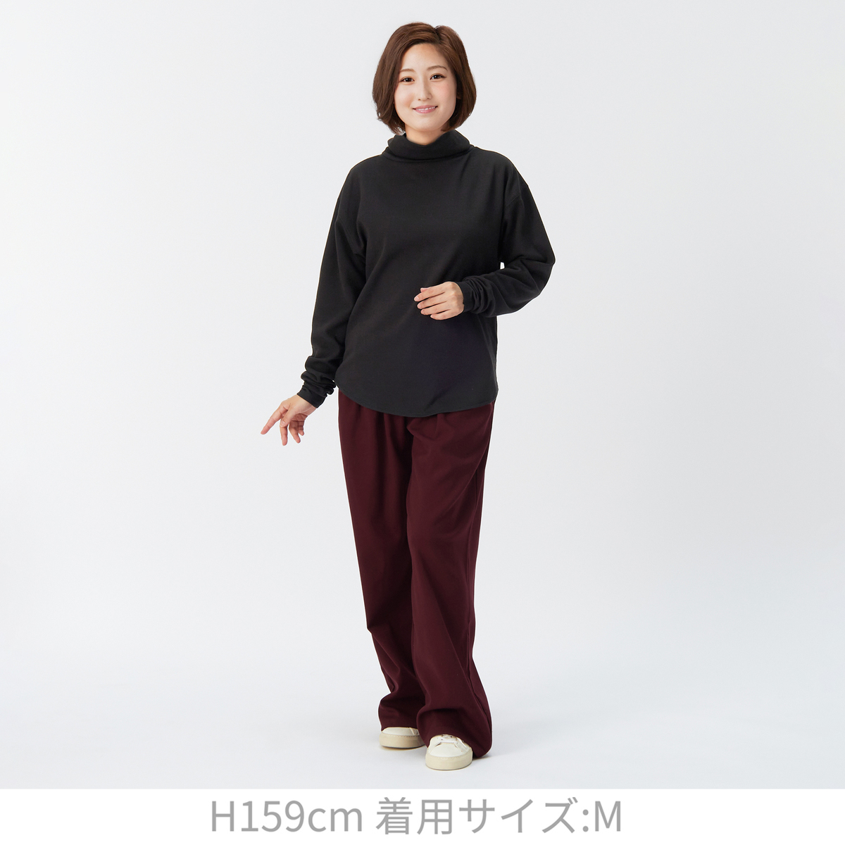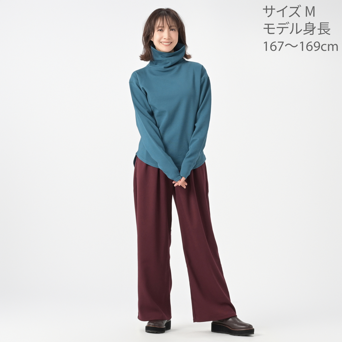 締め付け感のないハイネックとドロップショルダーで、程よくゆるっとしたシルエットに。前後差のあるラウンドヘムがヒップ周りをカバー。シンプルカジュアルなデザインでデイリーに活躍できるアイテムです