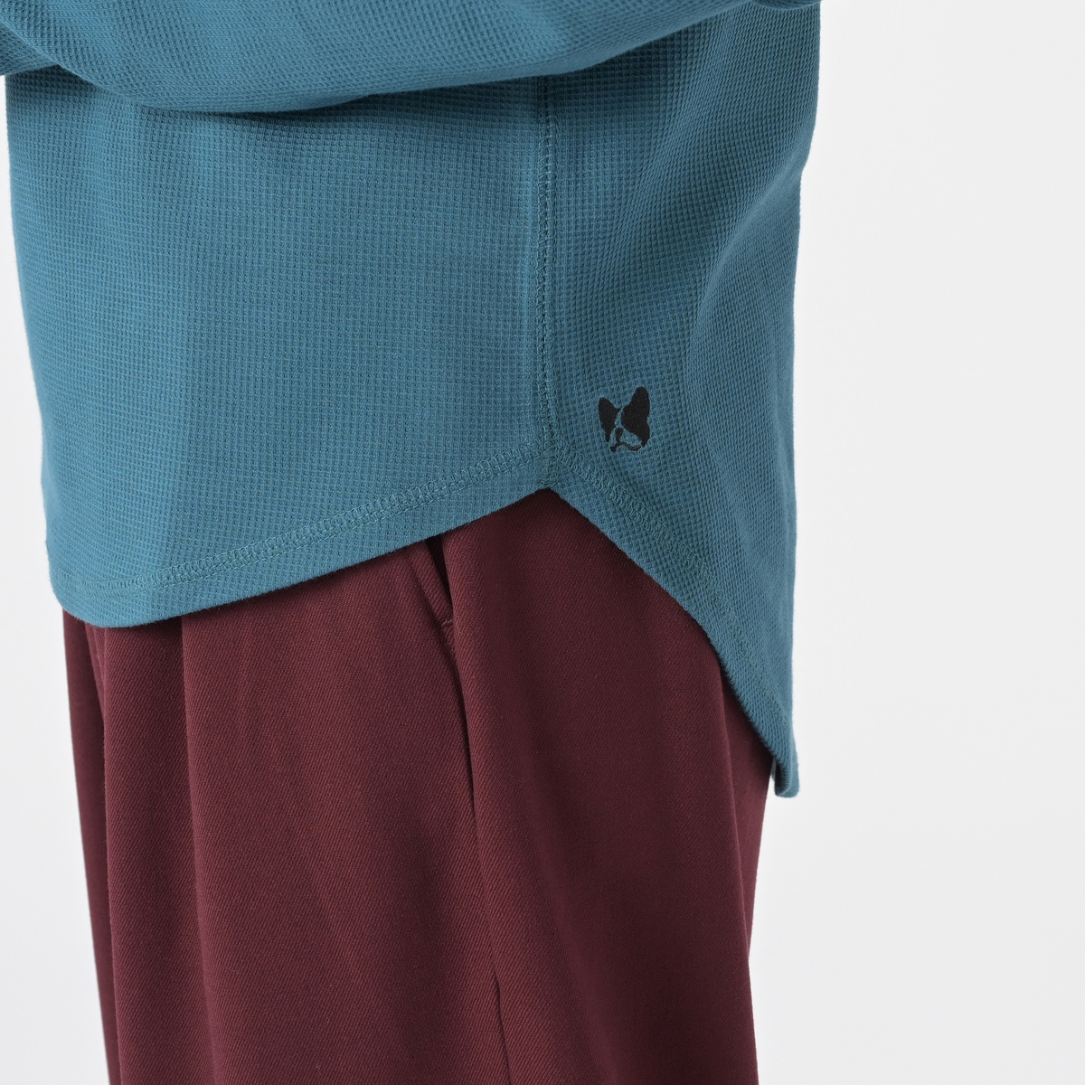 裏起毛のワッフル素材を使用。ダブルフェイス生地なので1枚でも透けにくく、程よい厚みが魅力の素材感。汗や湿気を吸収し、熱を作り出すことで快適な暖かさを実現してくれる吸湿発熱も。後ろ脇にはホット君のワンポイントロゴ刺繍入りです