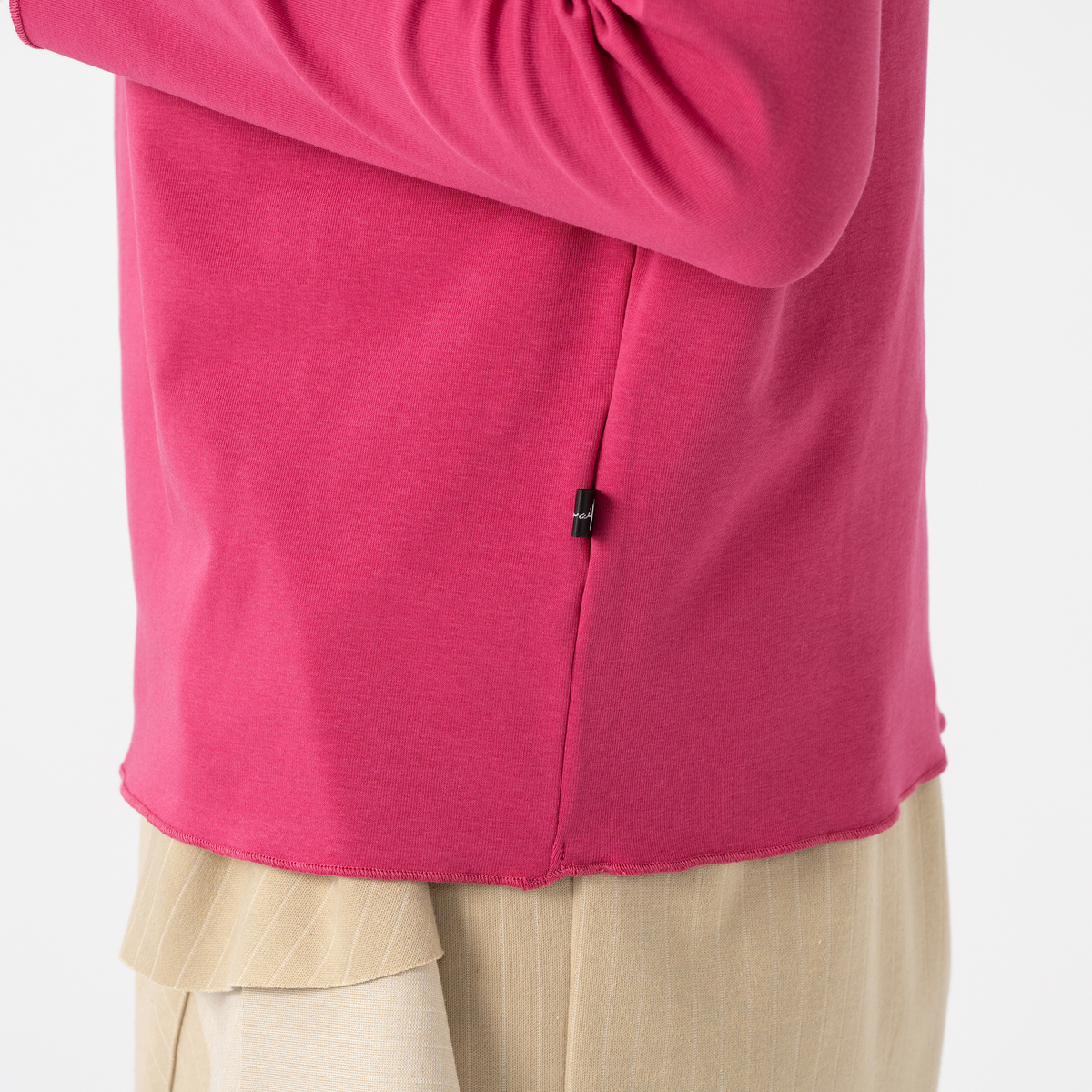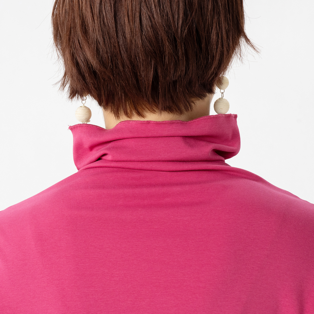 フライス素材を使用したタートルネックプルオーバー。胸元にKawaiOkadaの刺繍を入れて、ワンポイント添えています。着回し力は抜群で、シンプルながら端の始末などにもブランドらしいこだわりを感じさせるアイテムです