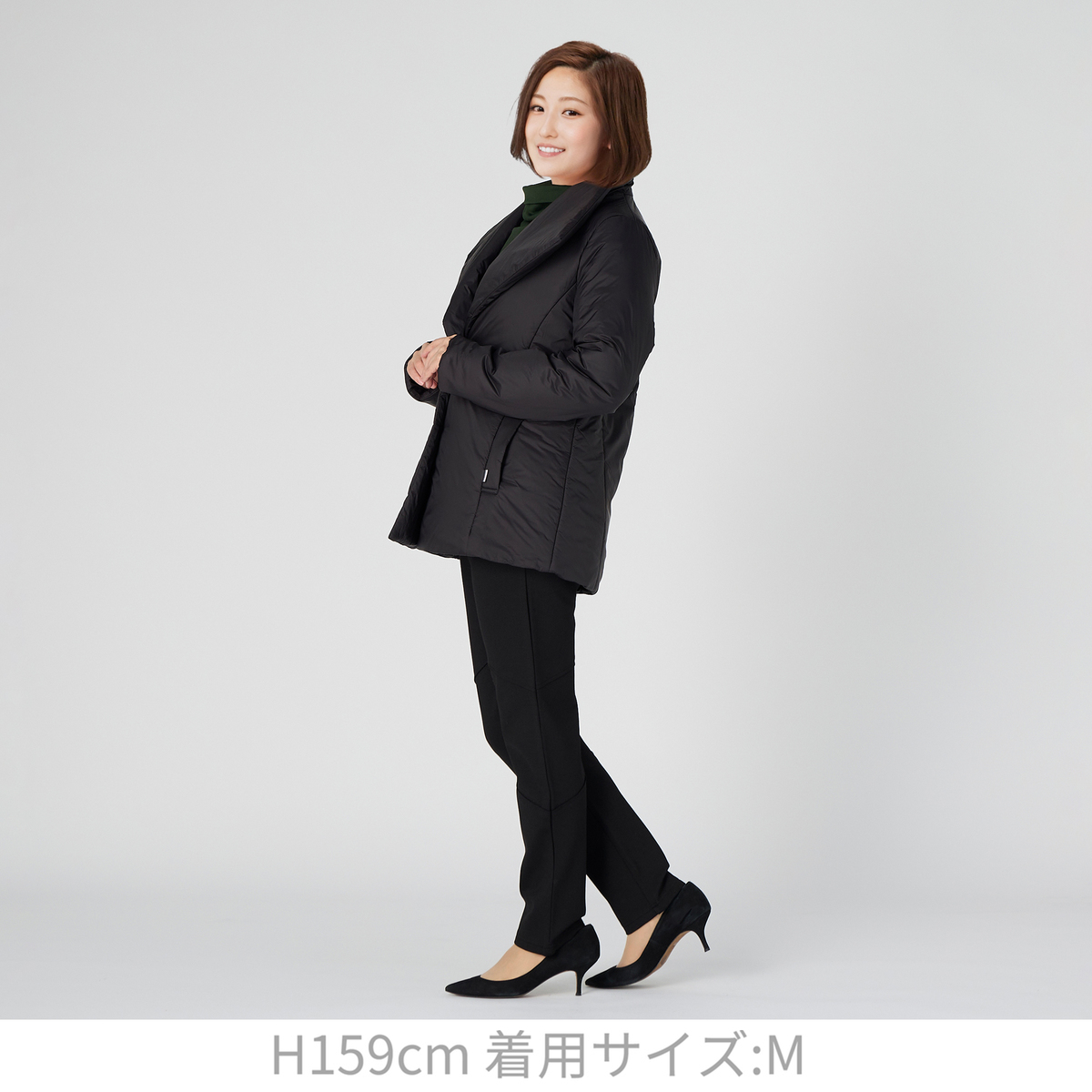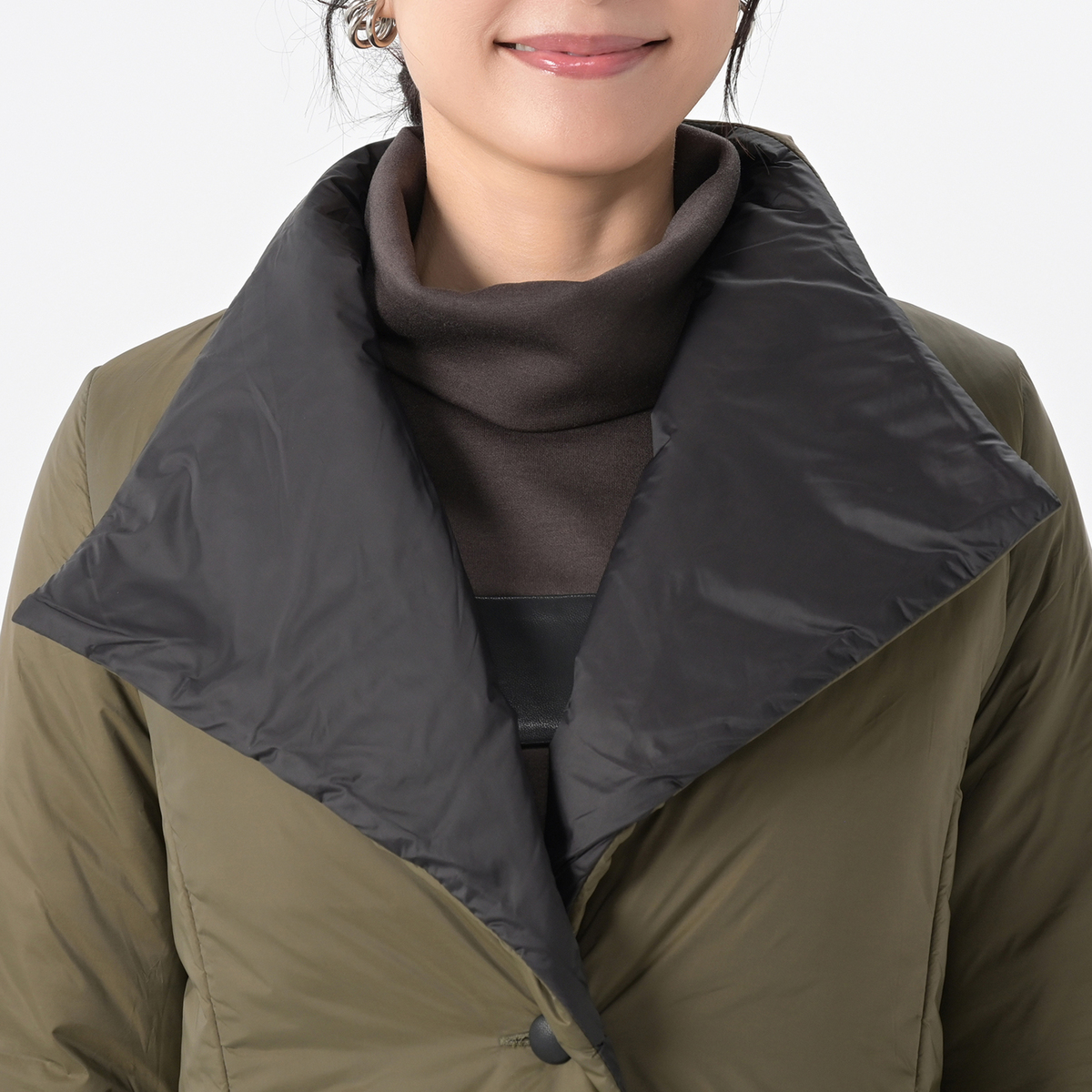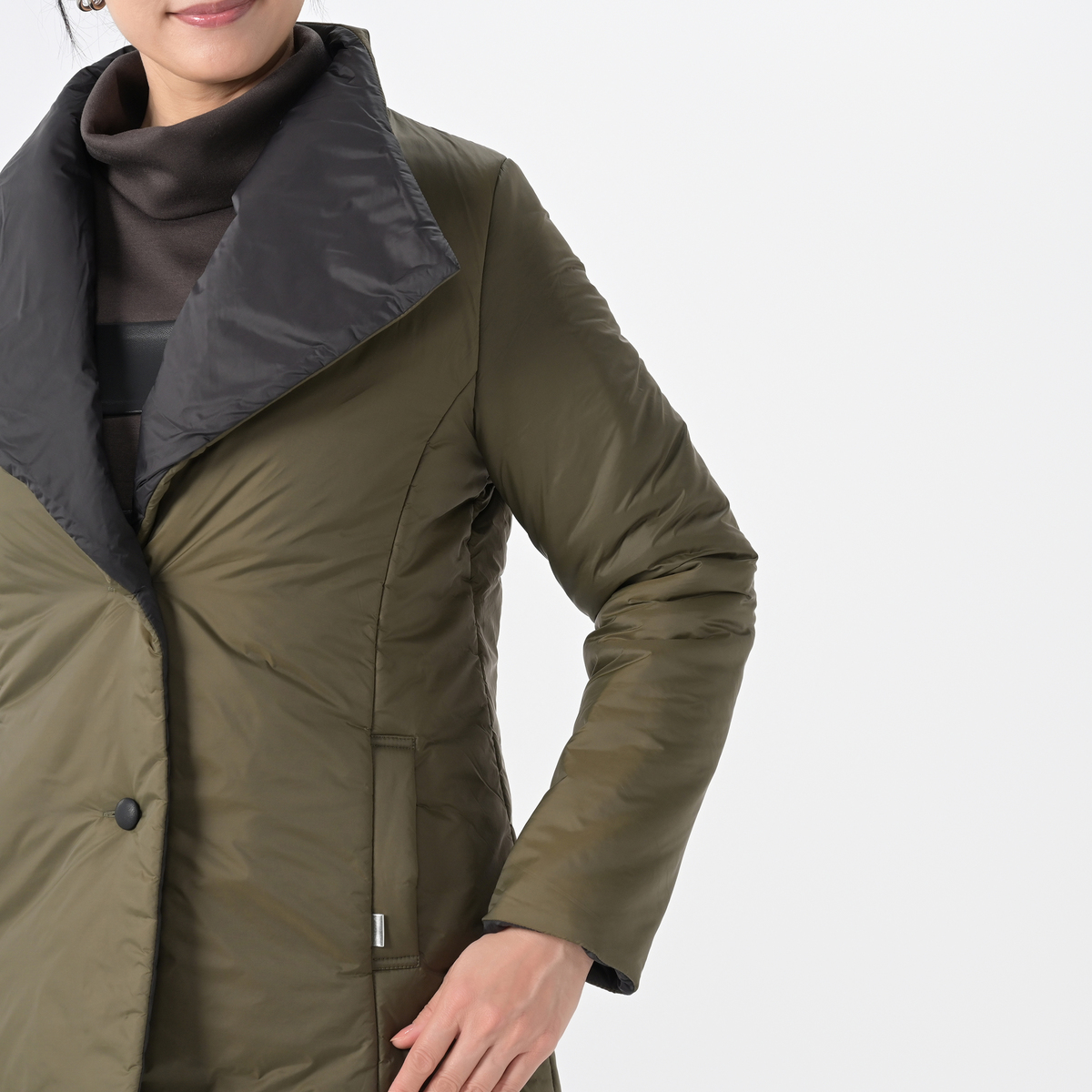 カーキのLサイズを購入しました。折返しの襟部分がブラックで、形も配色もモタンでオシャレだと思います。車 を運転するので、ちょっとのお買物の運転時はハーフ丈は便利です。気に入ったお品をセール価格で買えましたので、大満足です。