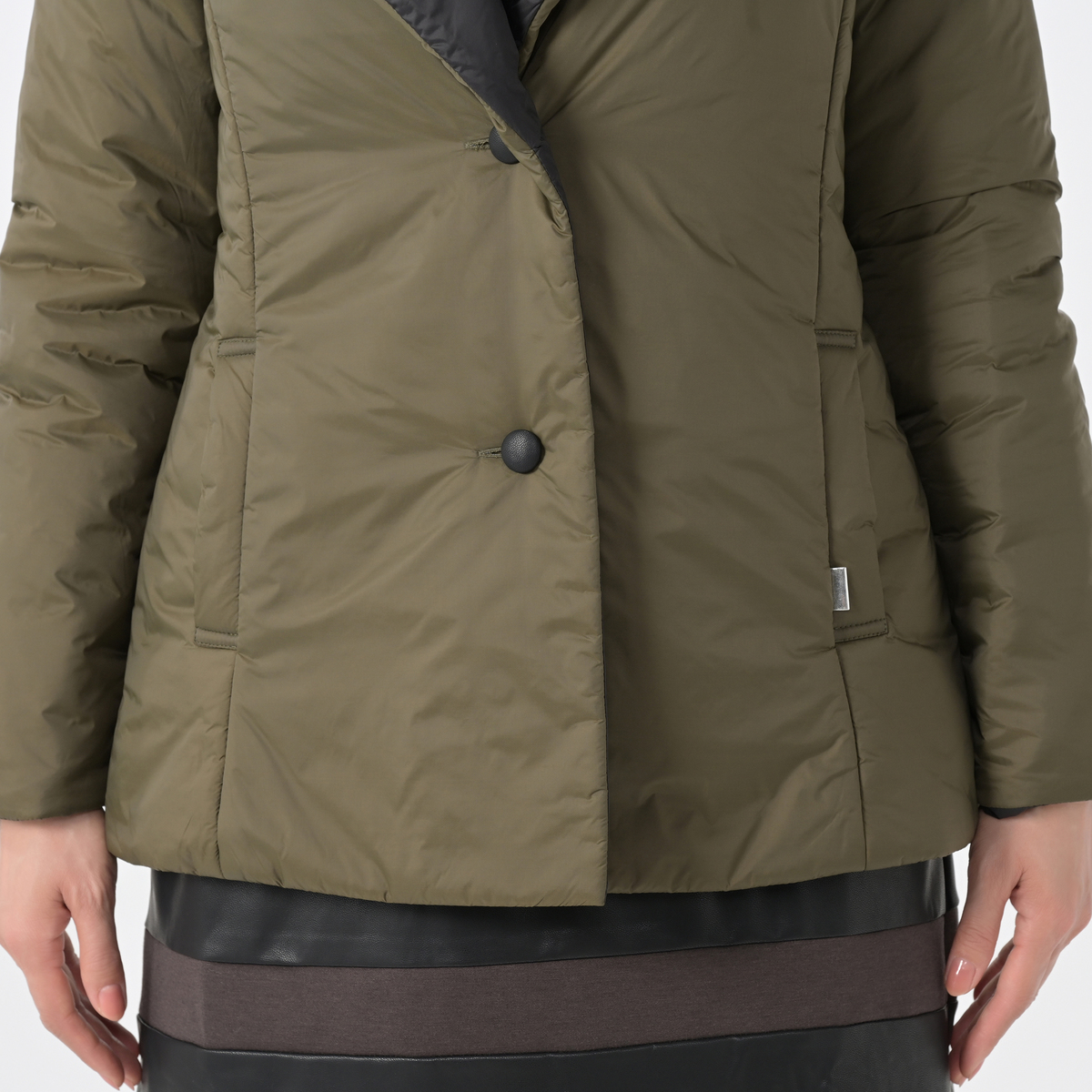 大きめの衿とエレガントなシルエットが特徴の中わたジャケット。合皮のくるみボタンがおしゃれなアクセントになっています