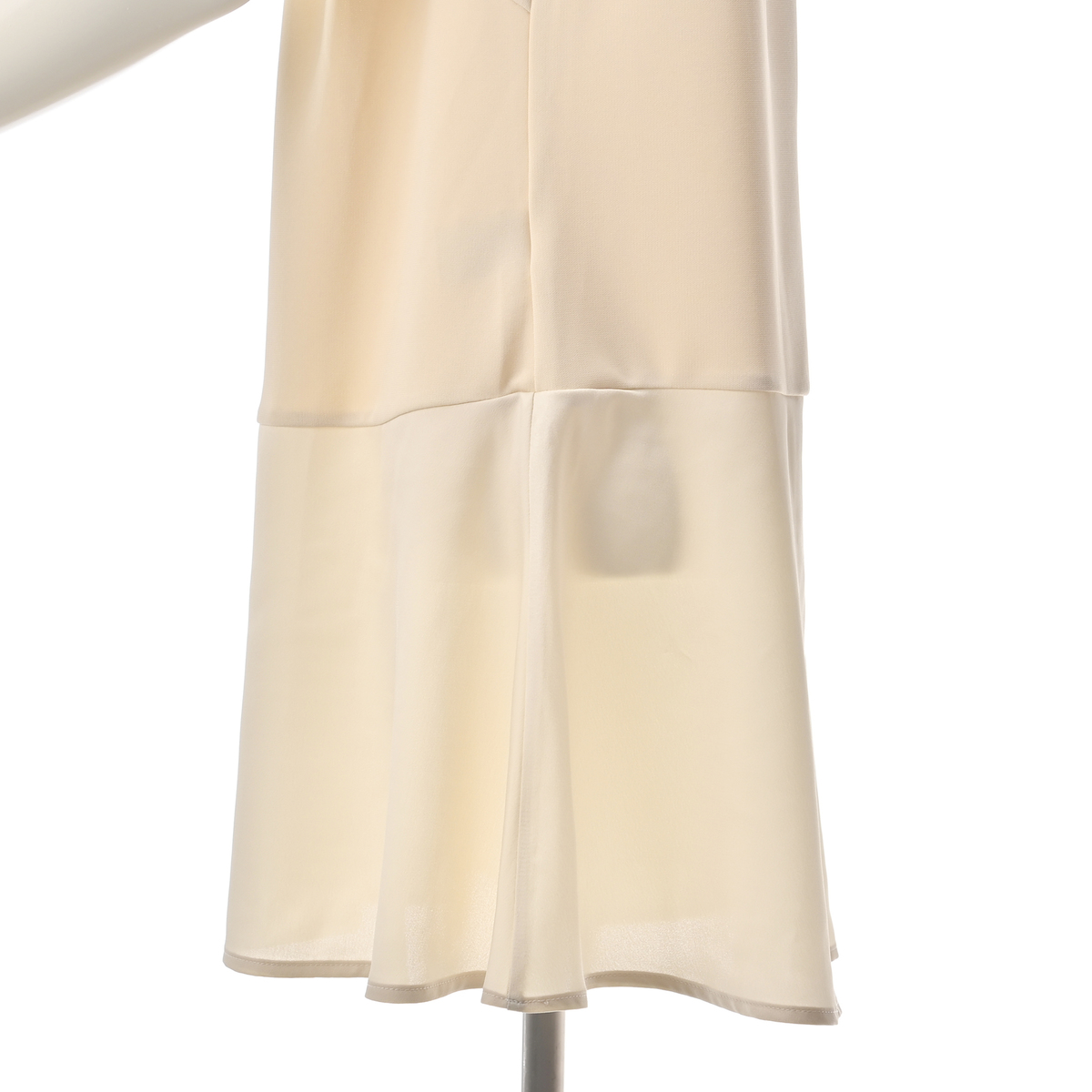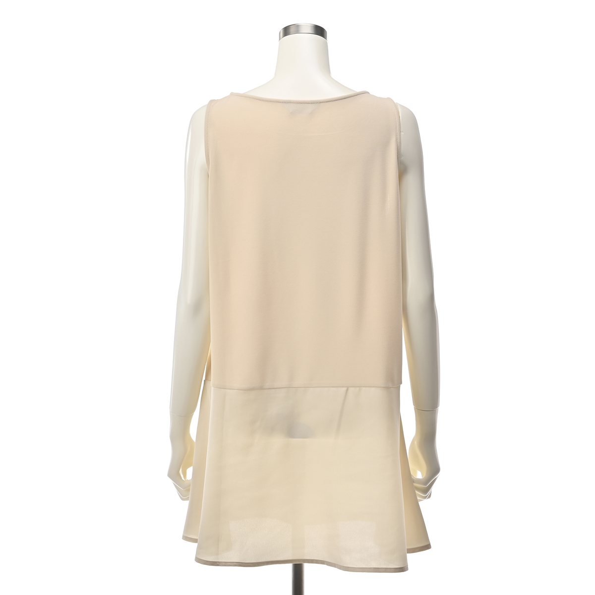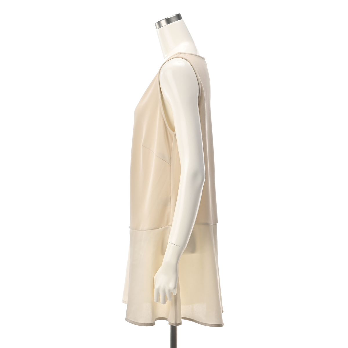 お尻がすっぽり隠れる丈のノースリーブチュニック。一枚着でも楽しめますし、短い丈のカットソーの下に着ればペプラム部分を見せるスタイリングも可能。身頃はカットソーで、ウエスト下でマットサテンに切替えたデザインです