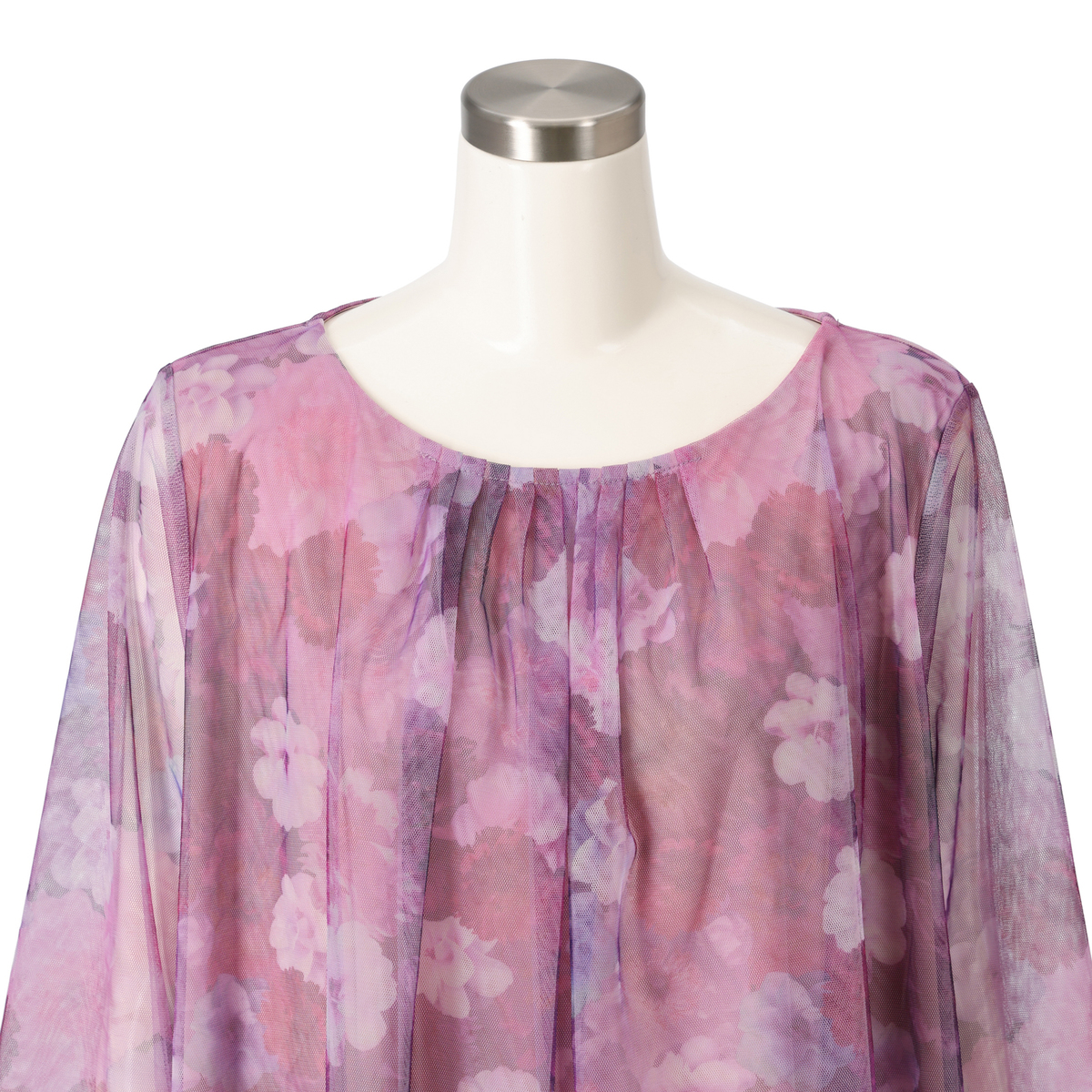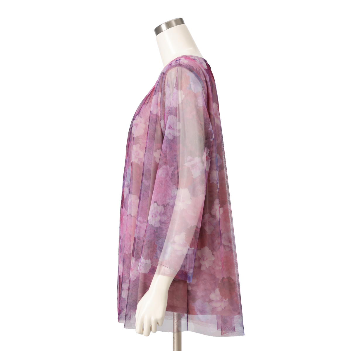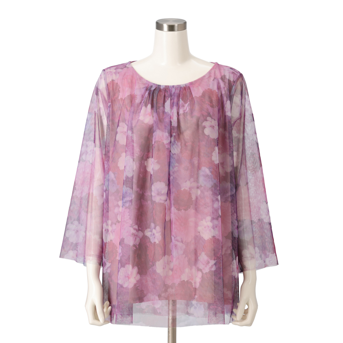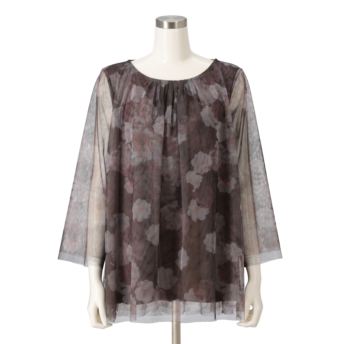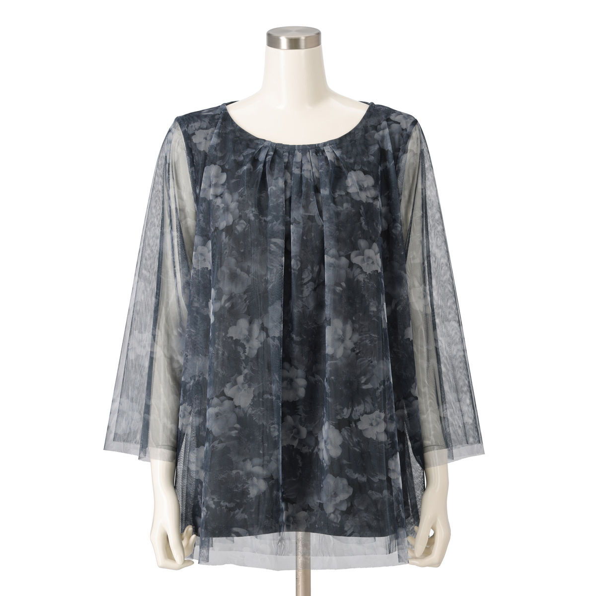 柔らかな雰囲気が漂うイタリアンプリントのチュニック。無地のチュールをプリントチュールの下に重ねることで、洗練されたデザインに。袖もチュール2枚仕立てで、上品なシアー感。胸元の細めなタックは、お顔まわりに華やかさを添えてくれます
