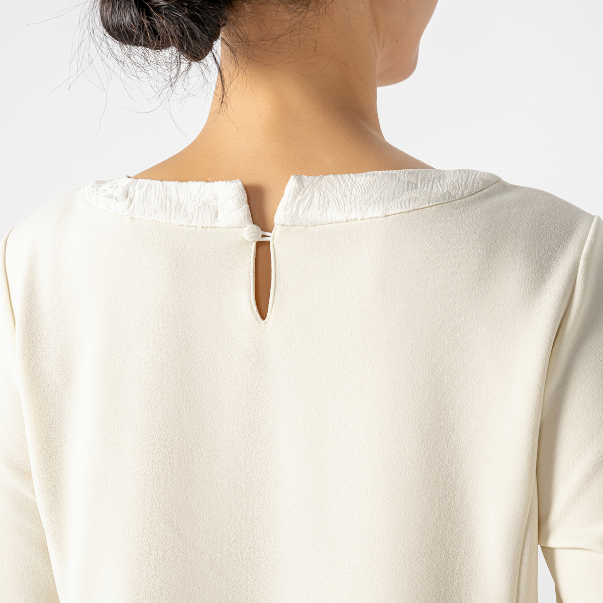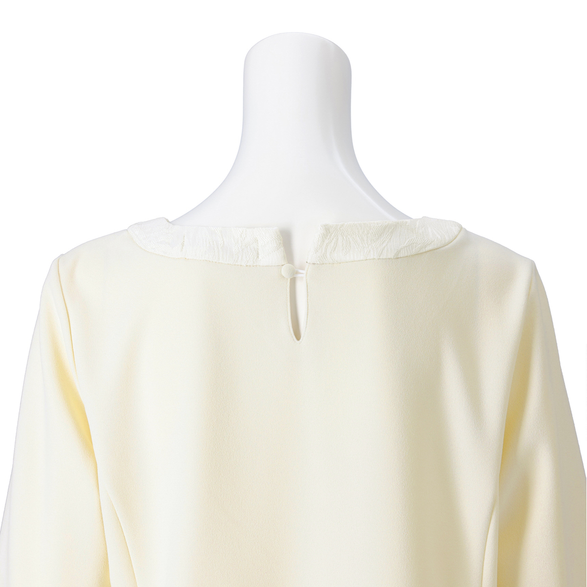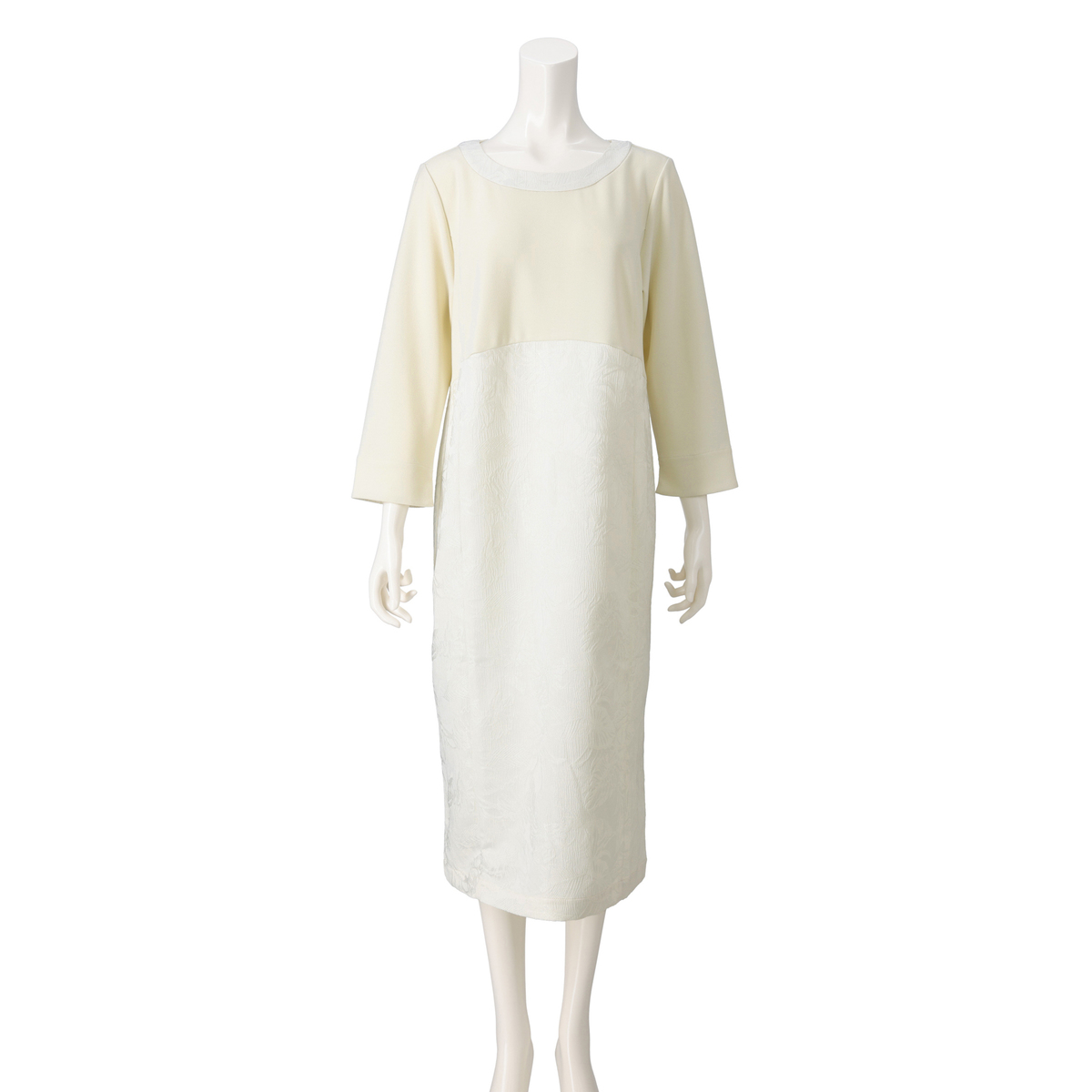 エレガントなコクーンシルエットで、気になるふくらはぎも隠れるロング丈。トップス部分はカットソー素材なので窮屈感なく着用できます。ブラックは、糸の芯まで染めてフォーマル対応できる黒に染め上げました。顔まわりが明るく見えるアイボリーは、慶事の装いにもおすすめです