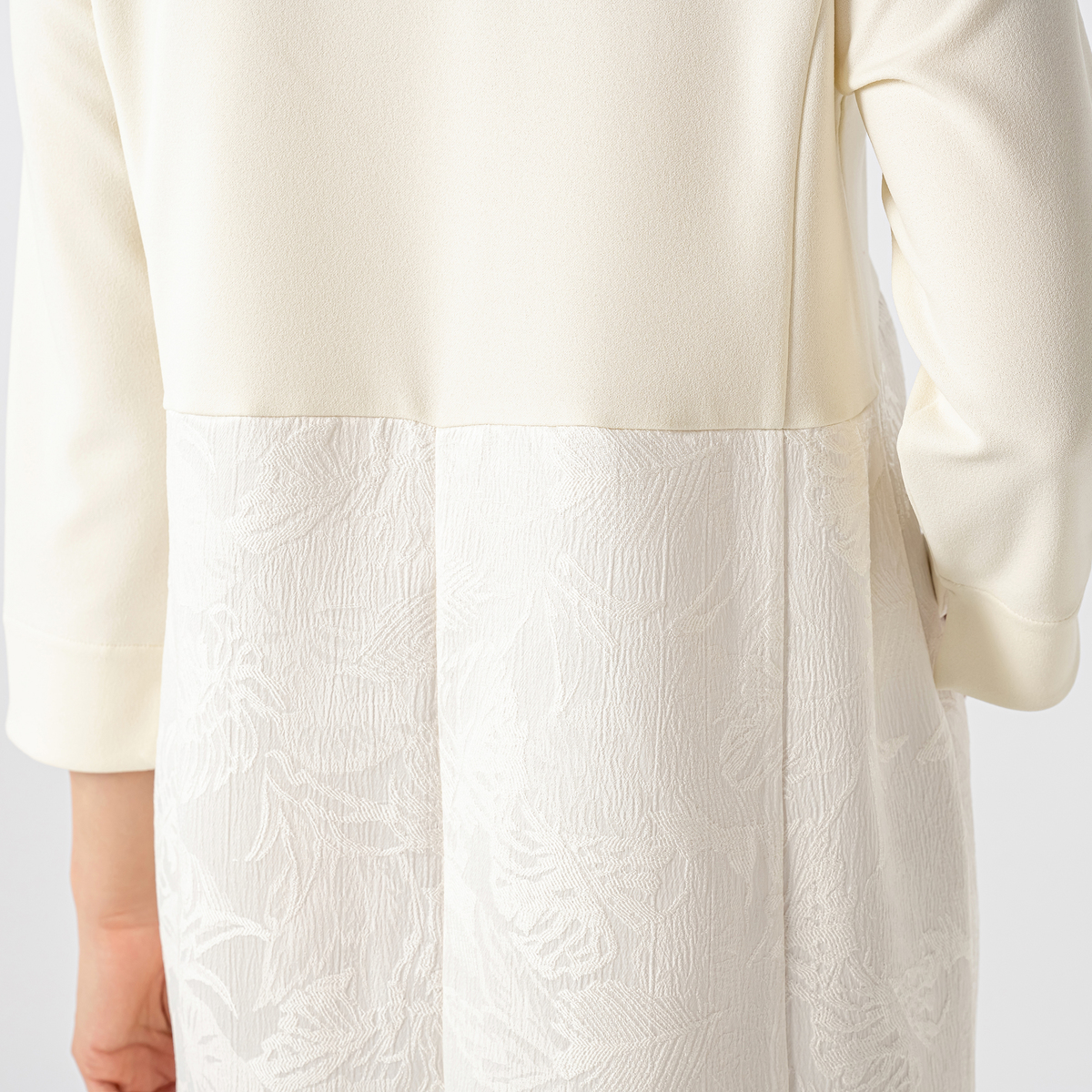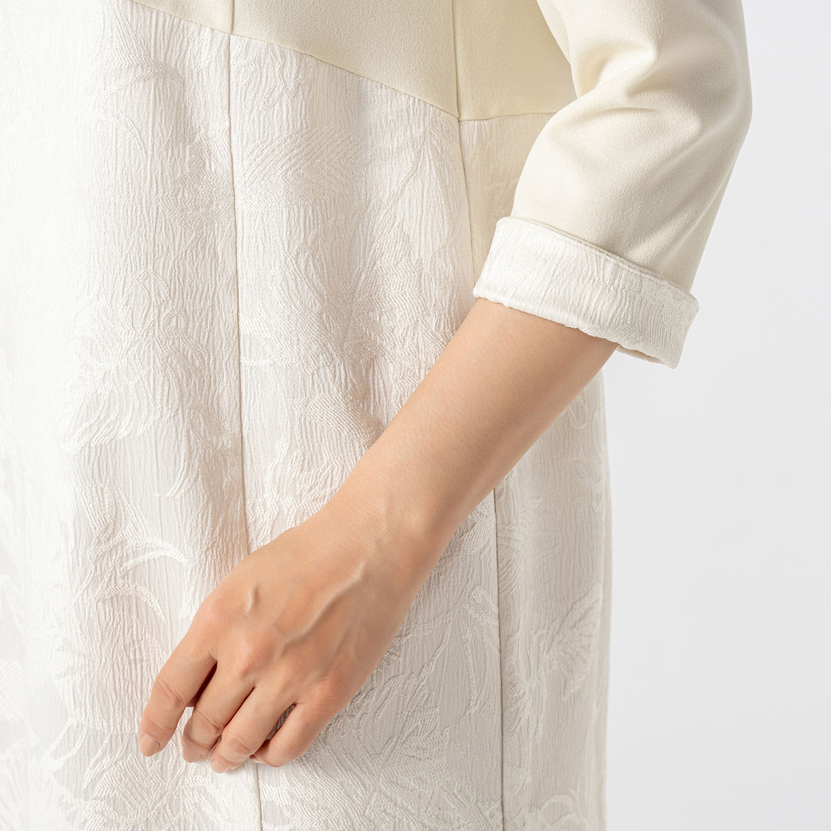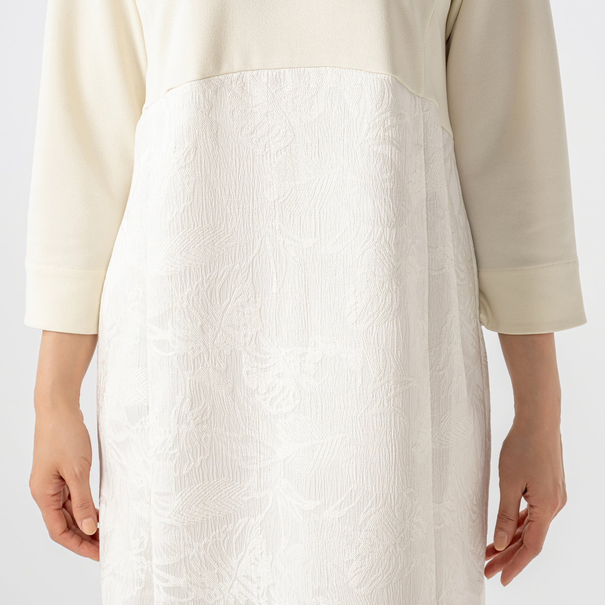 トップス部分にジョーゼットジャージー、裾部分にはサテンジャガード素材を使用したワンピ―ス。ボトム部分のサテンジャガードはモンステラの葉っぱの柄になっています。裏側はつるっとして重ね着してもまとわりつきにくく、肌触りの良い素材です