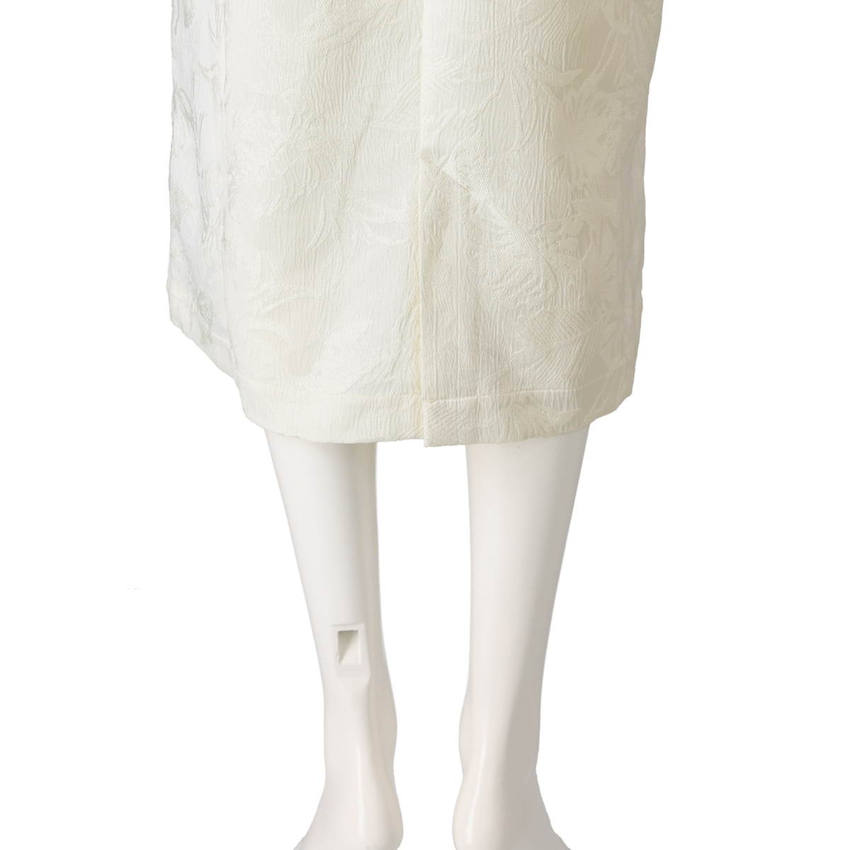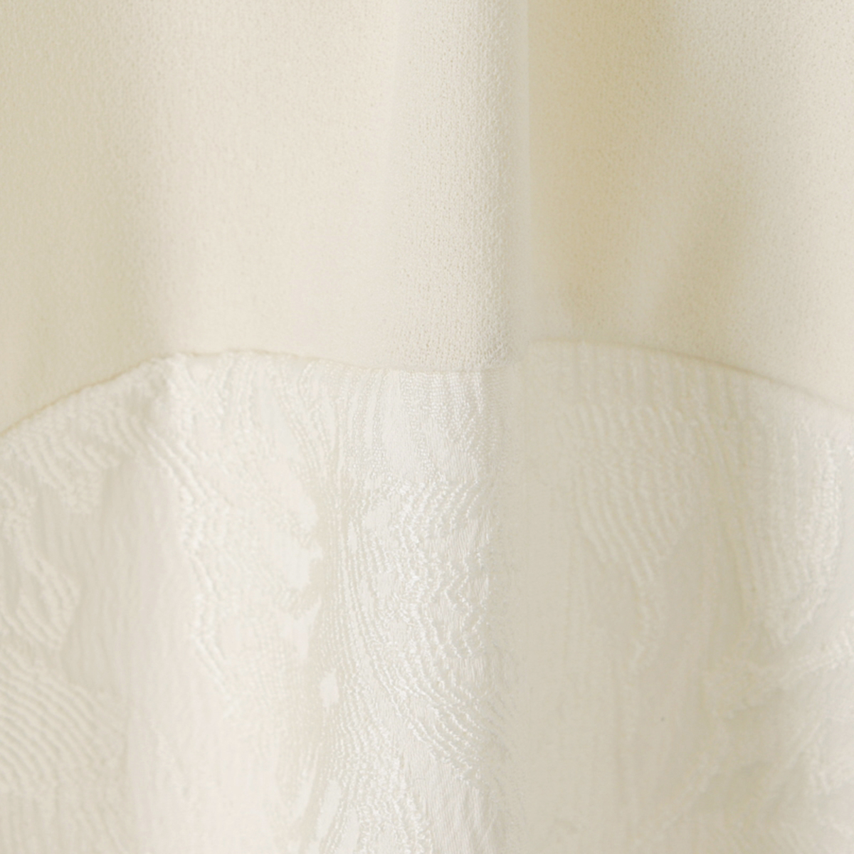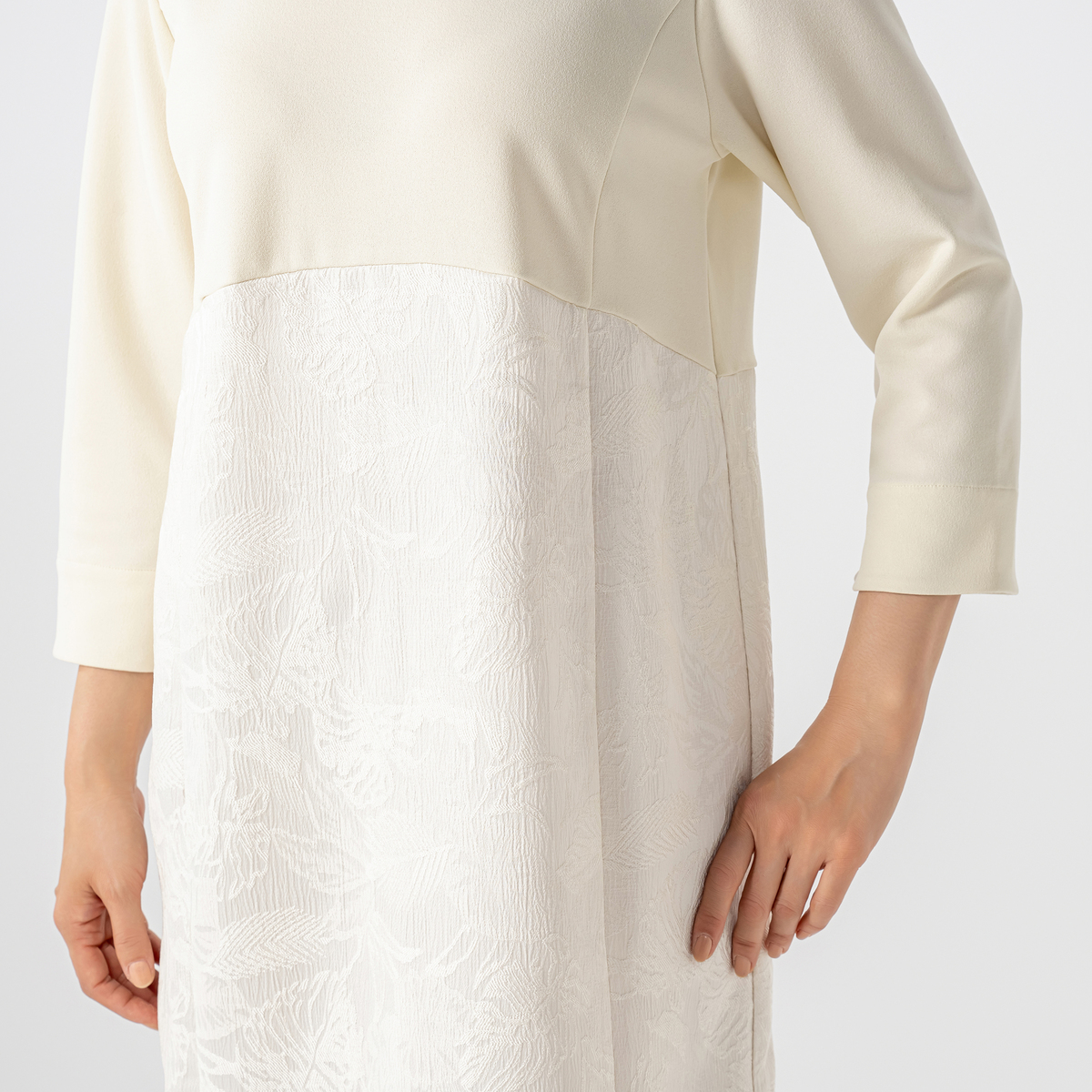 トップス部分にジョーゼットジャージー、裾部分にはサテンジャガード素材を使用したワンピ―ス。ボトム部分のサテンジャガードはモンステラの葉っぱの柄になっています。裏側はつるっとして重ね着してもまとわりつきにくく、肌触りの良い素材です