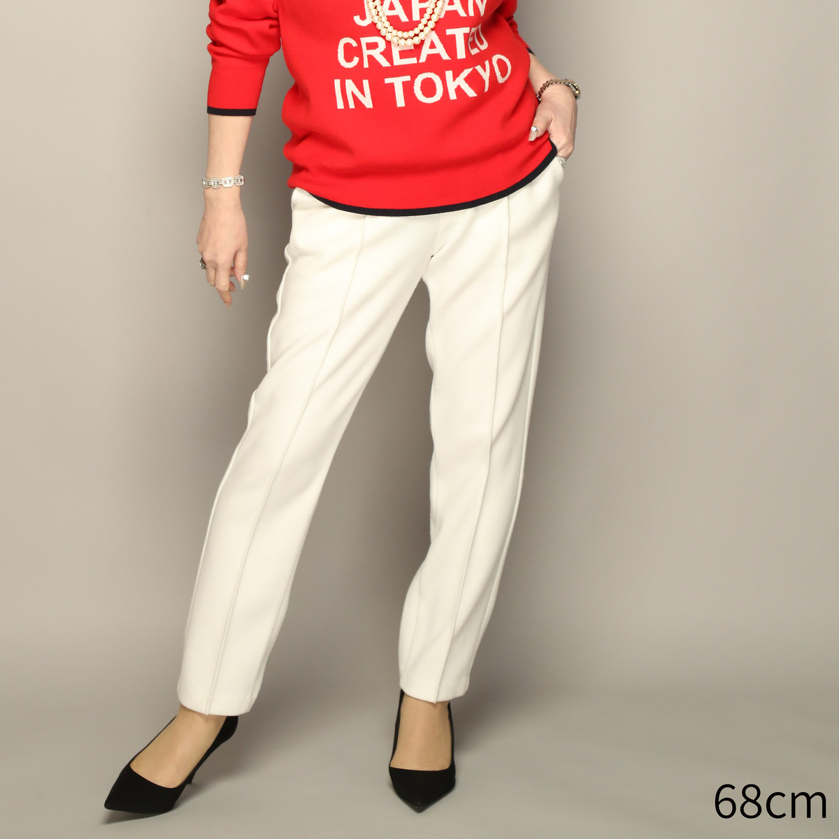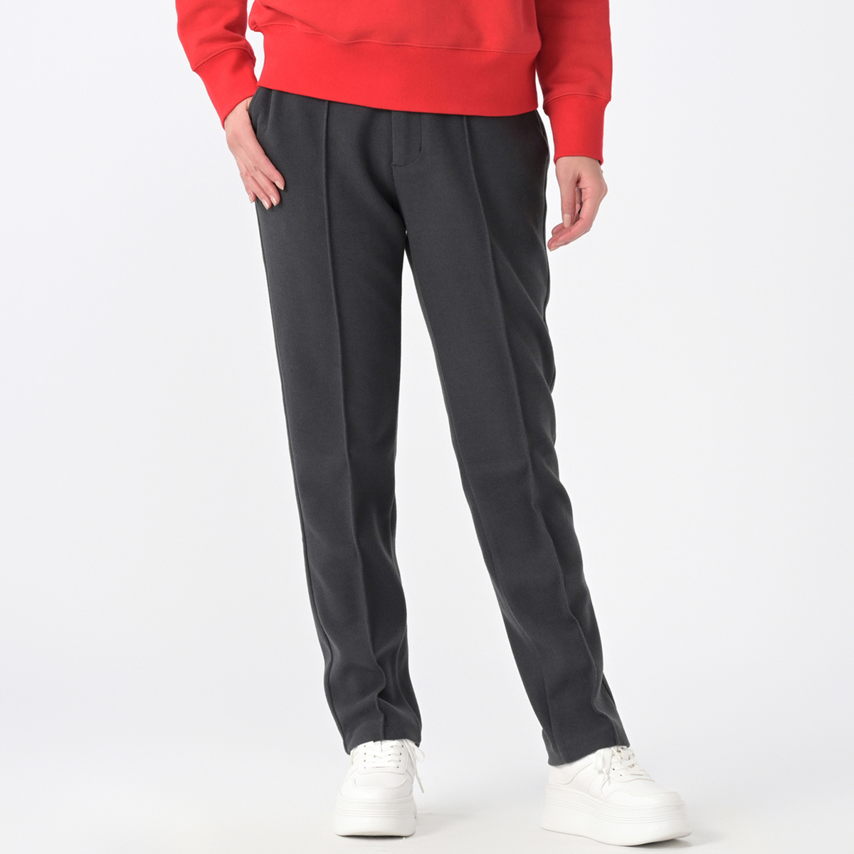 ウエストは後ろ全体がゴムで、前中心はファスナー開閉。綺麗見えしながらスッキリ穿きこなしていただけます。脚長効果を狙えるセンターピンタック入りで、美脚ラインを意識したデザインです