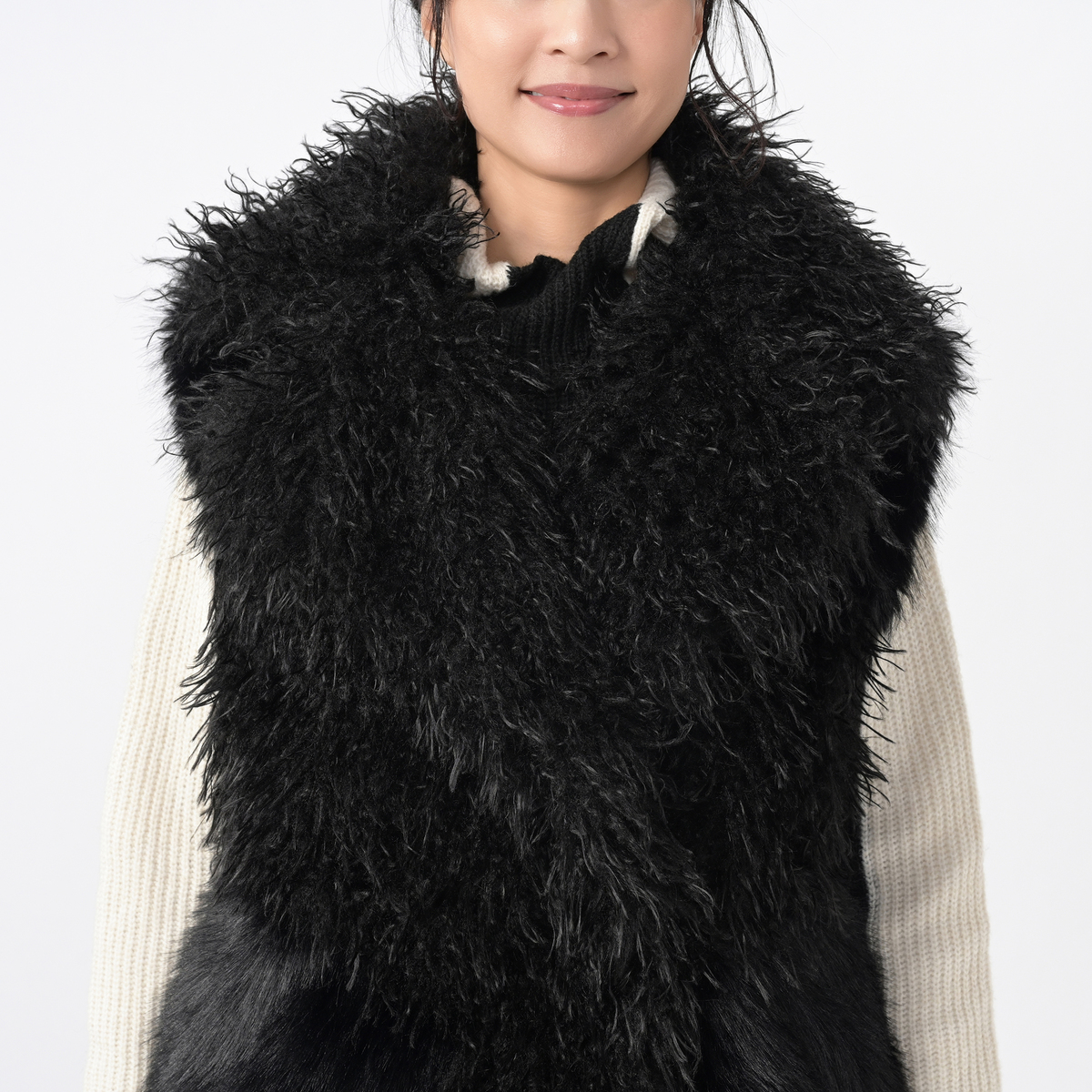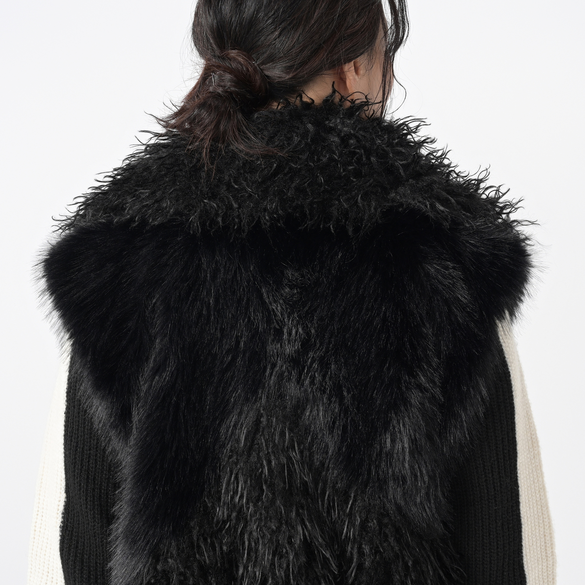 2種類のフェイクファーを切り替え縫製した、ゴージャスなベスト。羽織るだけでコーディネートが決まる、華やかなアイテムです