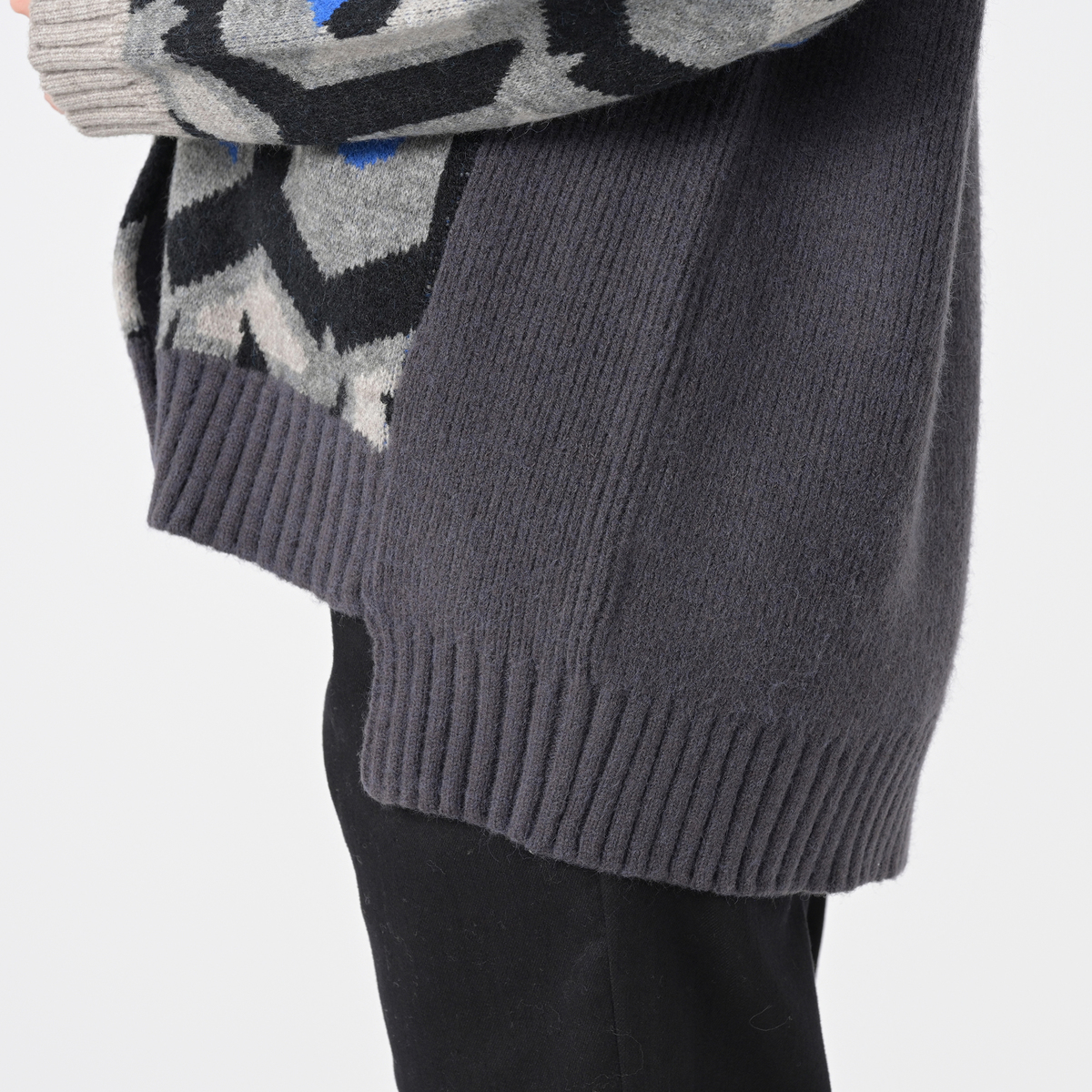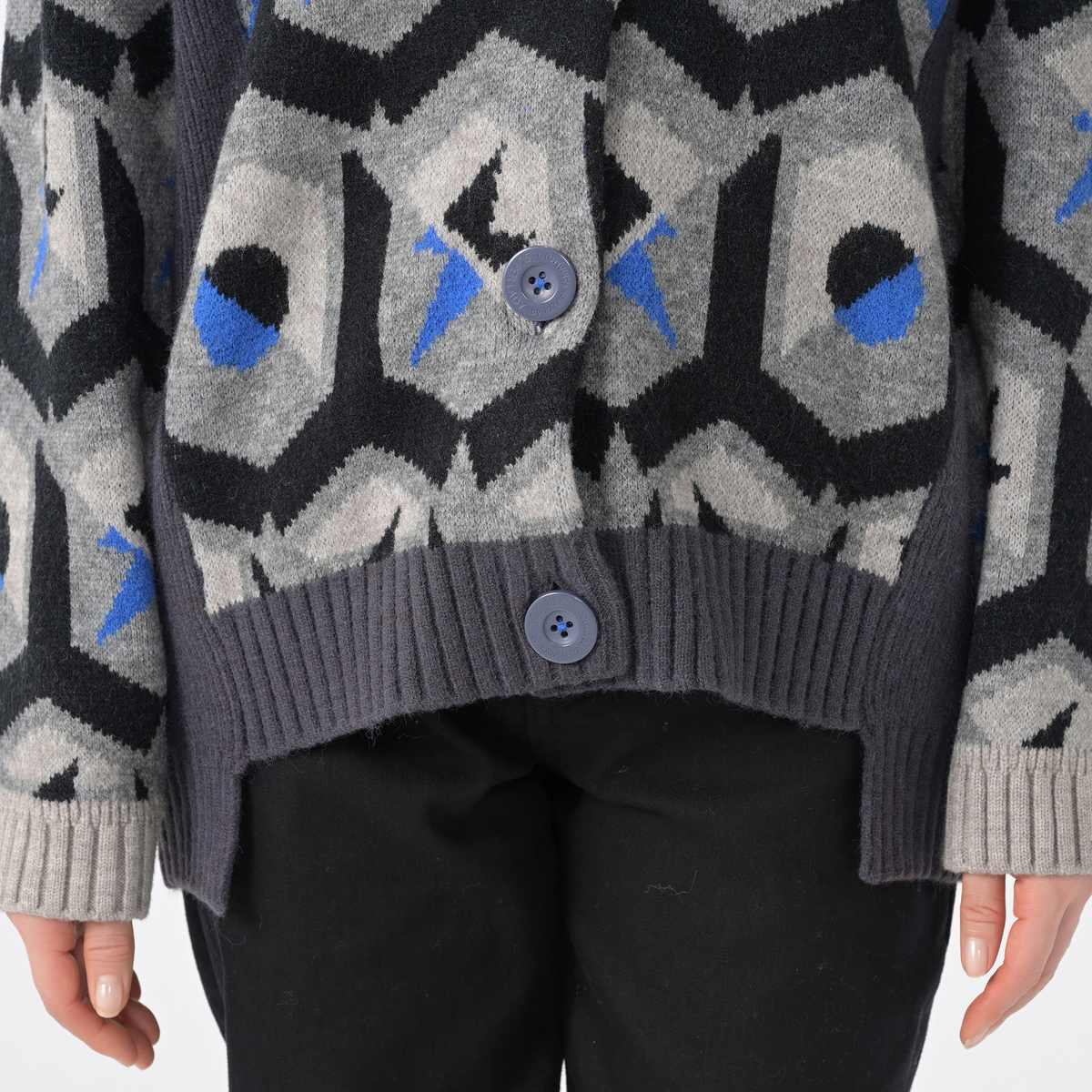 オリジナルジャカード柄のカウチン風ニットジャケット。なめらかな風合いのナイロン混の糸を使用し、スーパーレディらしいカウチン風ニットを表現しました