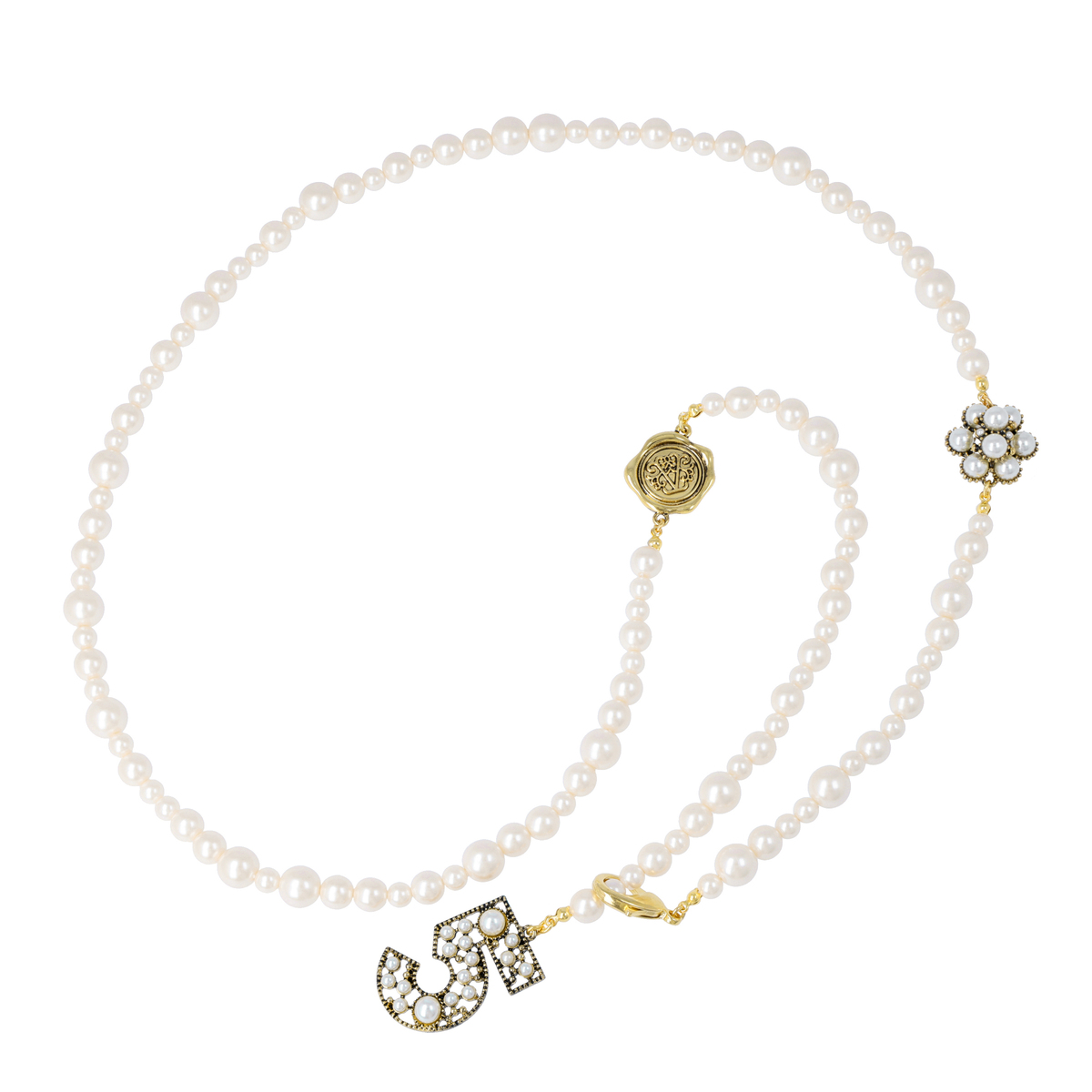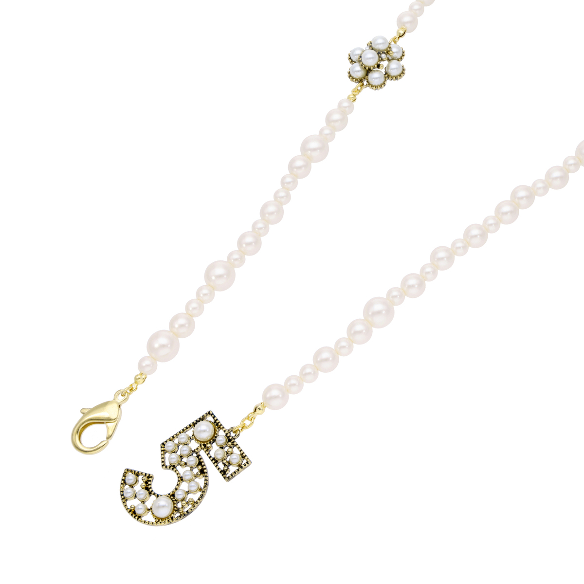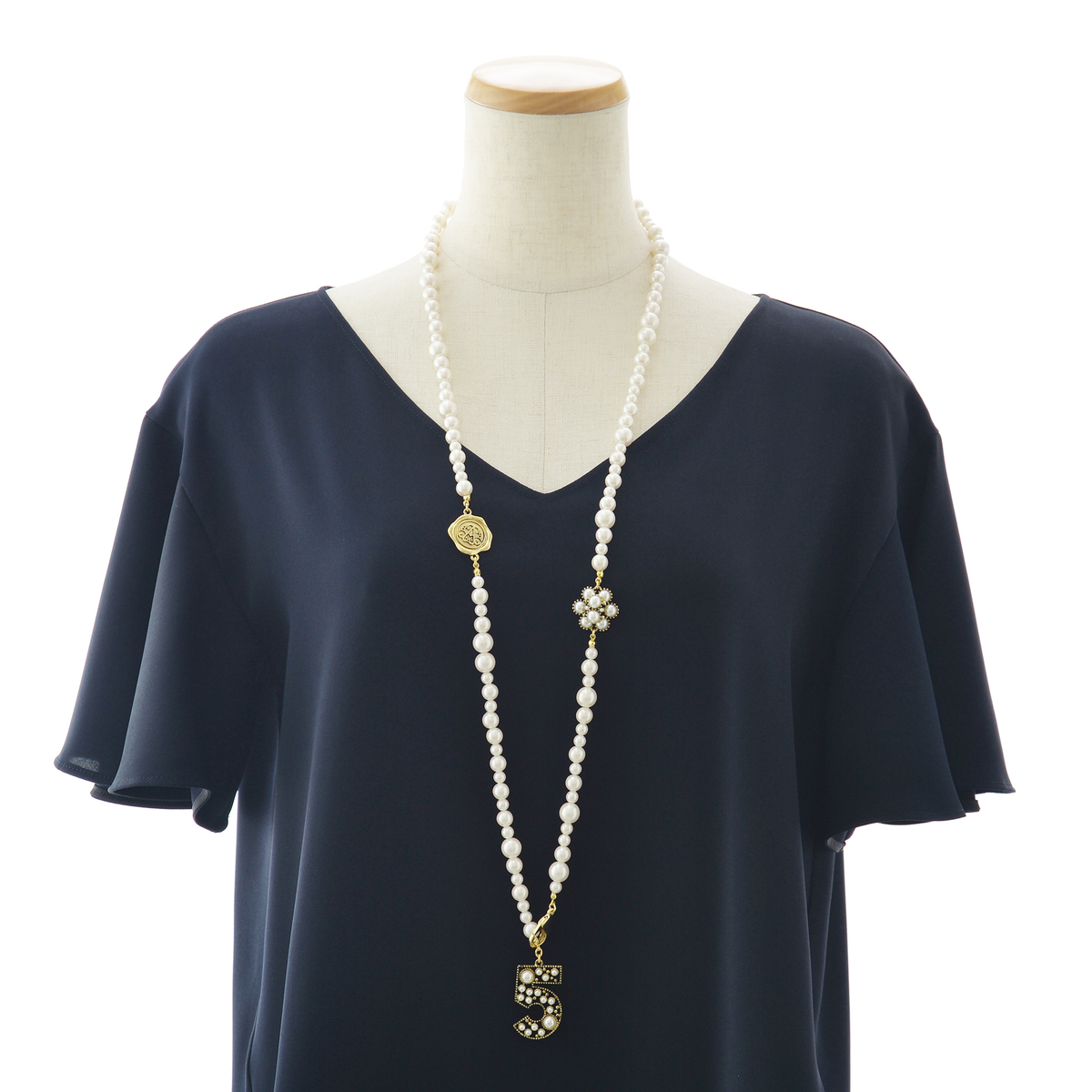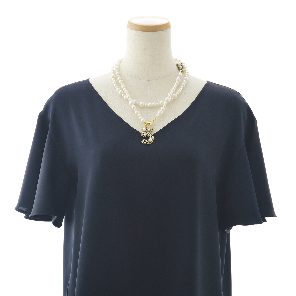 アンコキーヌQVCデビュー5周年を記念してデザインされた、5がモチーフのオリジナルジュエリー。パールビジューを連ねたネックレスです。一見ランダムに見えますが樹脂パールを規則的に通しているため、とても時間と手間がかかっています
