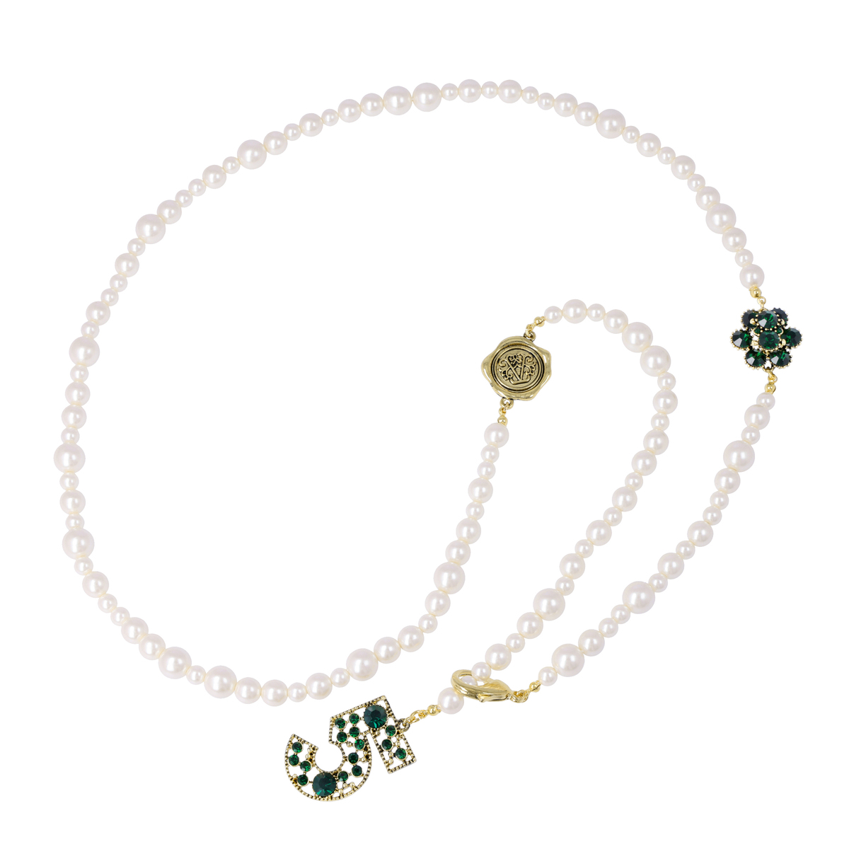 シーリングスタンプ、フラワーモチーフもオリジナル。留め金はネックレスのお好きな位置に留められるため、ロングにしたり、ショートで2重にしたり、ウエストに巻いた使い方も。樹脂パールのため重さも軽くなっています
