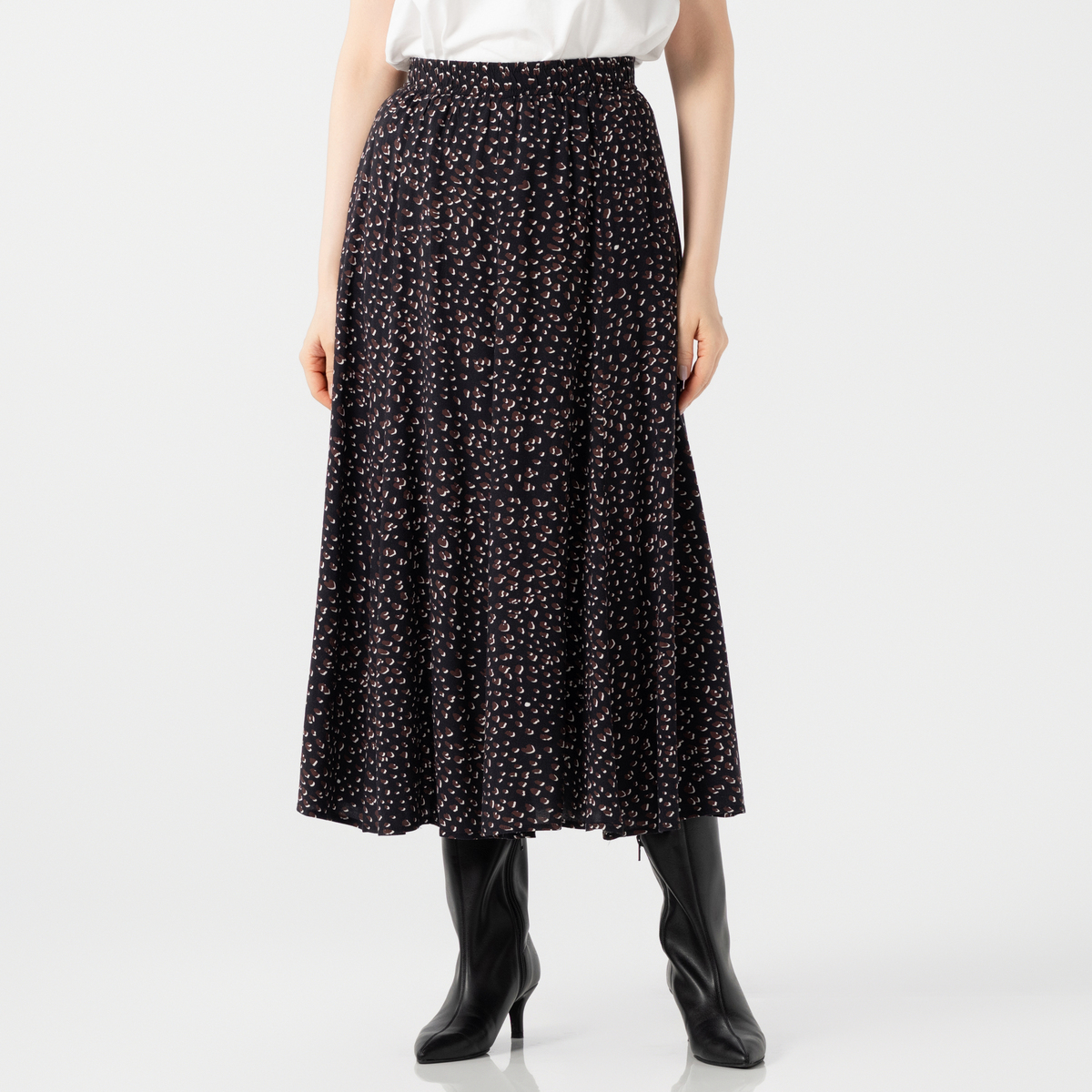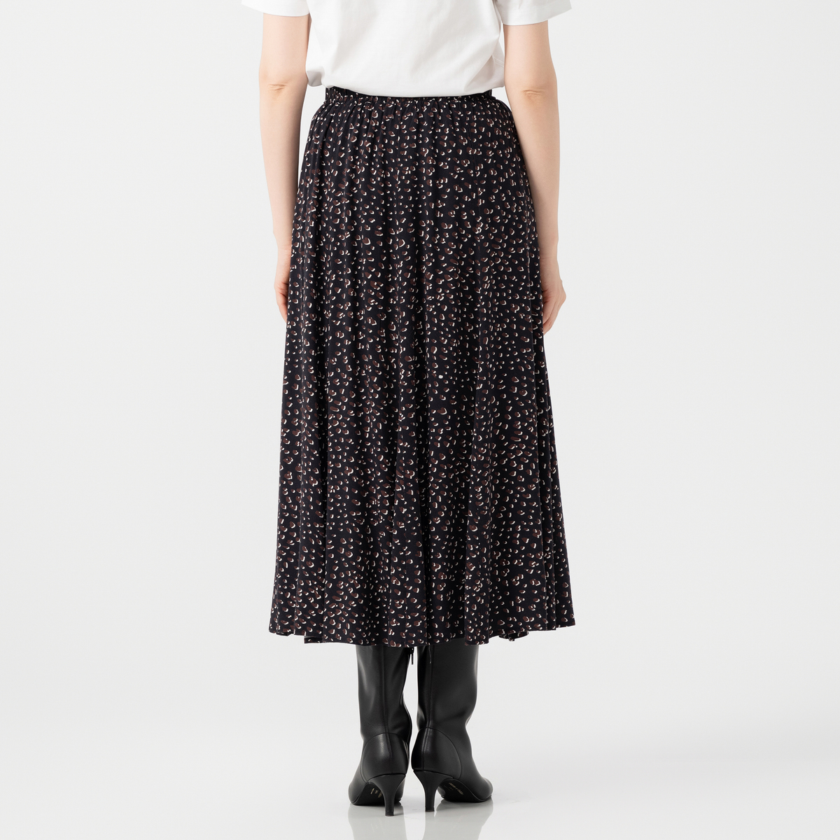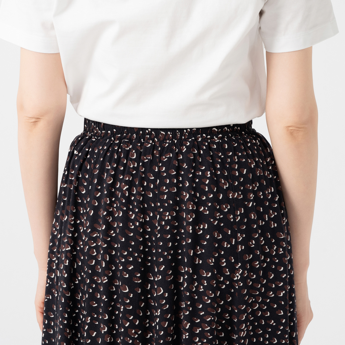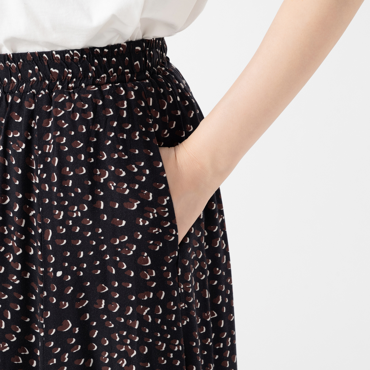 柔らかくてしなやかな素材で仕立てたプリントスカート。肌触りが良く、微光沢が上品さを引き立てます。裏地付きで、ウエストは総ゴム仕様のプルオンデザインです