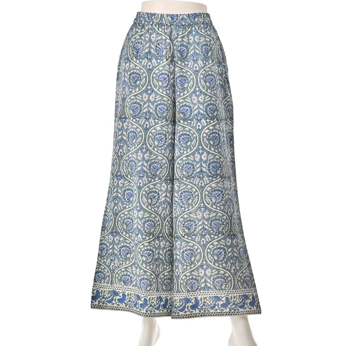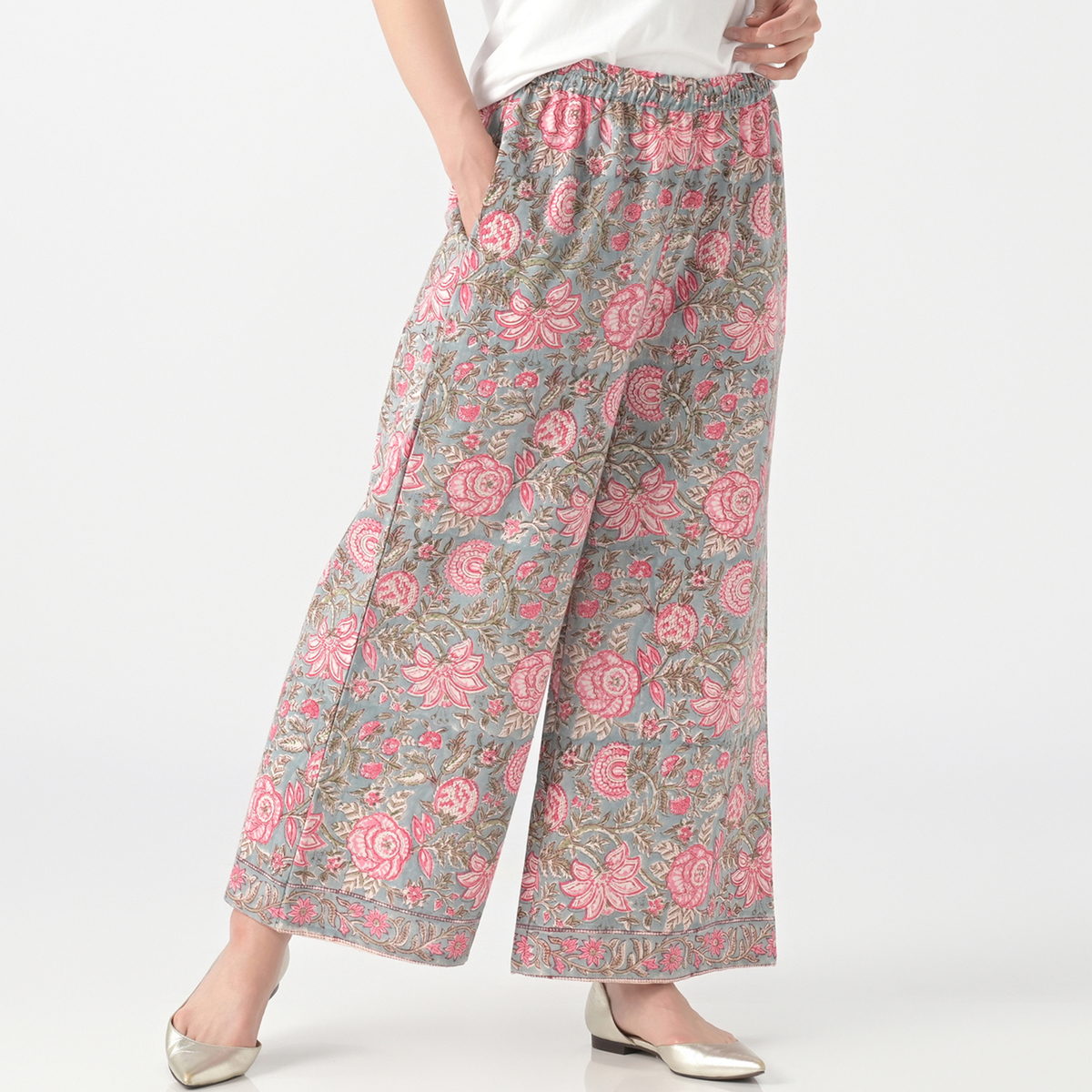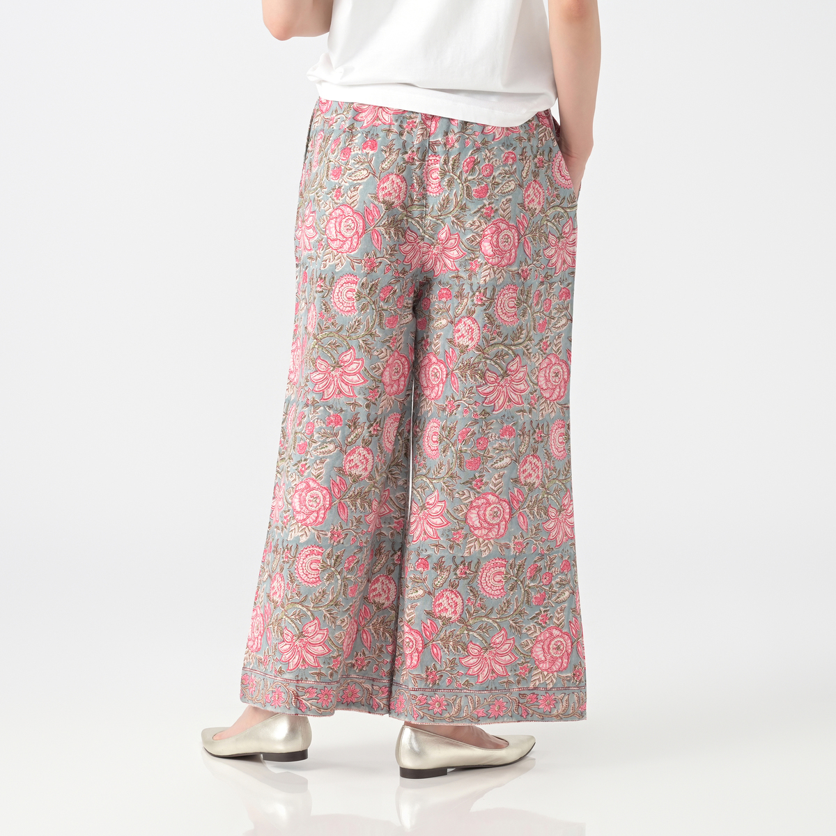風通しの良いインド綿100%のワイドパンツ。木型でひとつひとつ手作業で染めていくブロックプリントという手法によるプリント柄です。手染めのため一点一点微妙に色柄の濃淡が異なるのが特徴で、プリントはインドでハンドメイドです