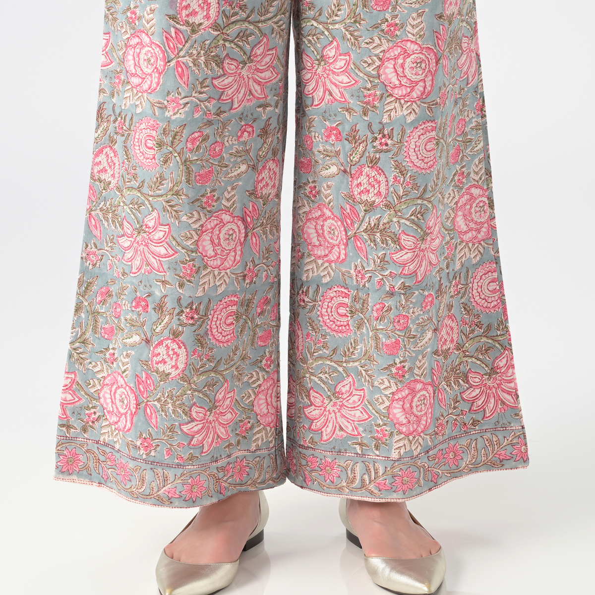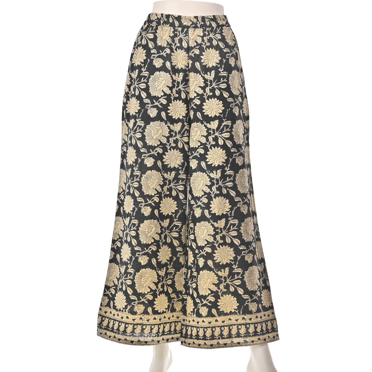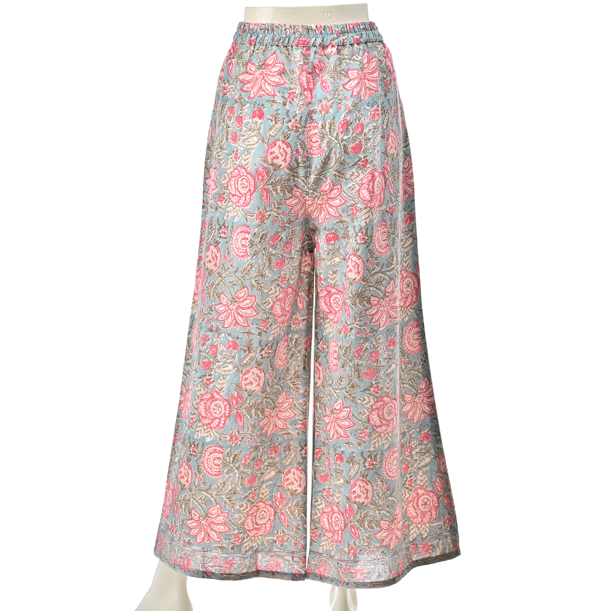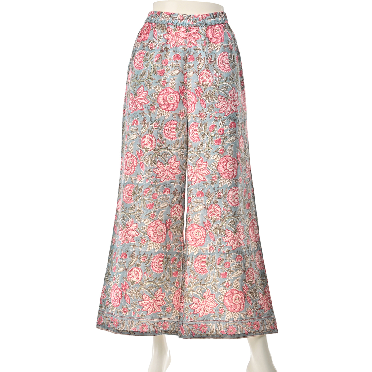 風通しの良いインド綿100%のワイドパンツ。木型でひとつひとつ手作業で染めていくブロックプリントという手法によるプリント柄です。手染めのため一点一点微妙に色柄の濃淡が異なるのが特徴で、プリントはインドでハンドメイドです